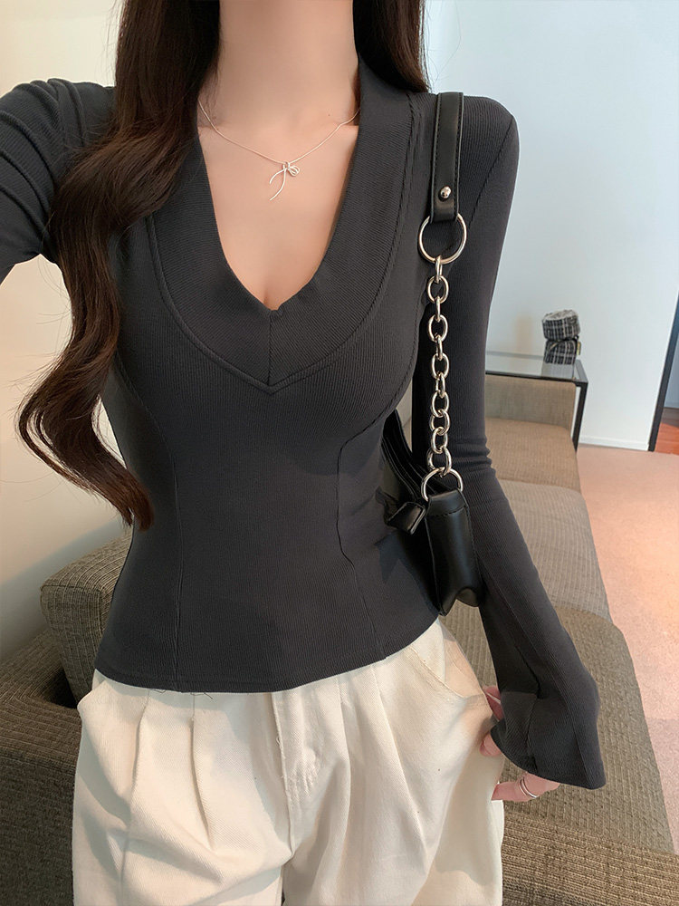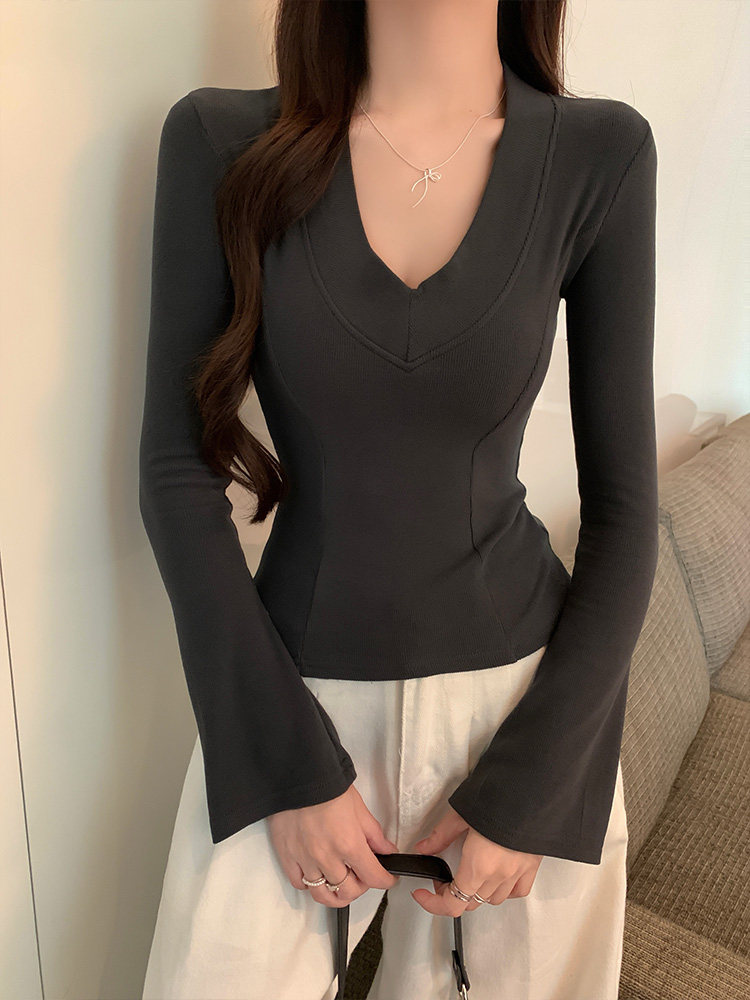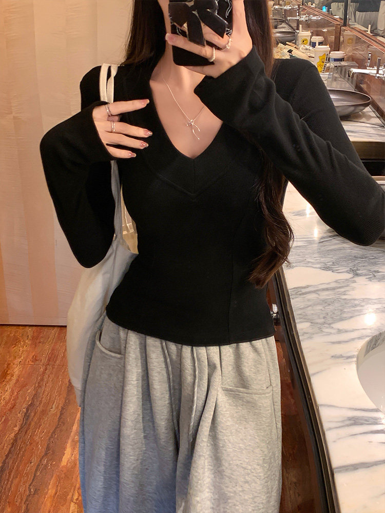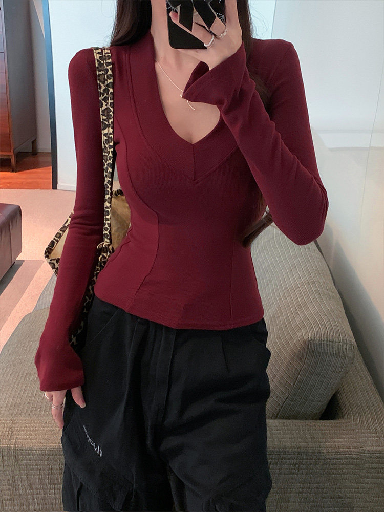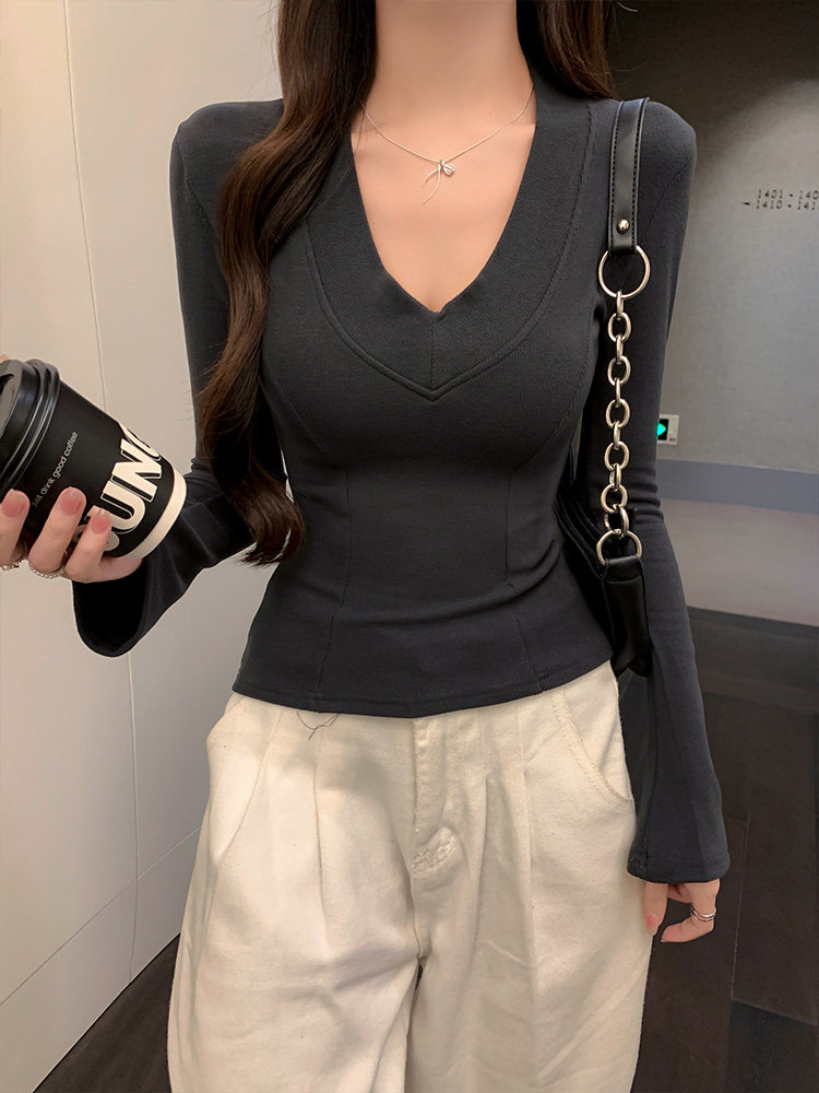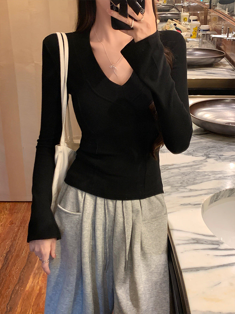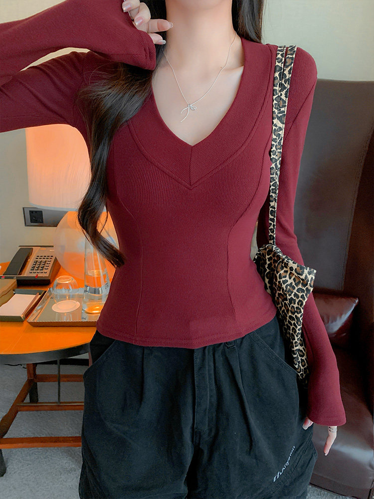 Spicy Girl Style Patchwork Fishbone V-Neck Thickened Fleece-Lined Base Shirt for Women, New Spring Korean Version Slim-Fit Waist-Cinching Long-Sleeve T-Shirt for Women