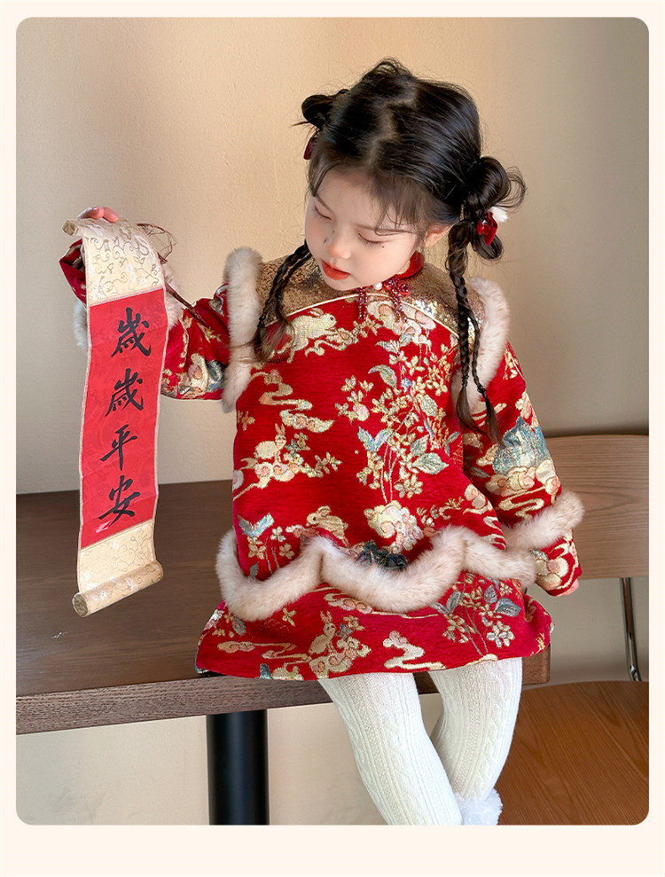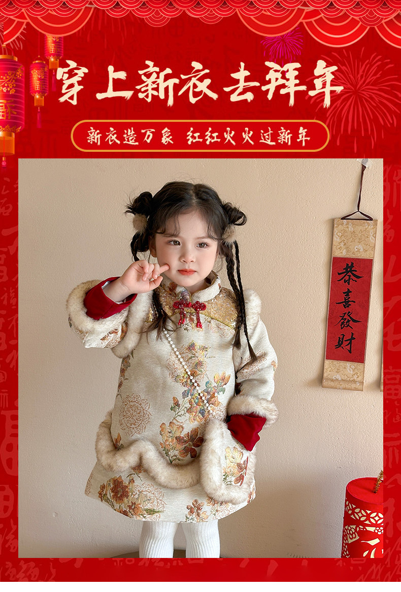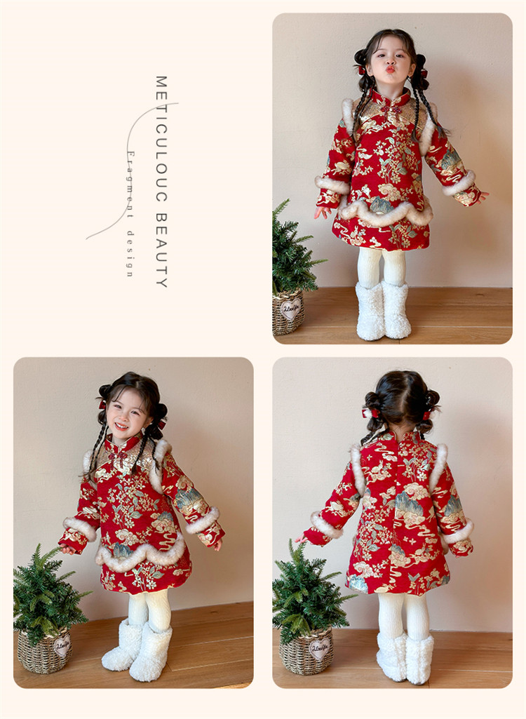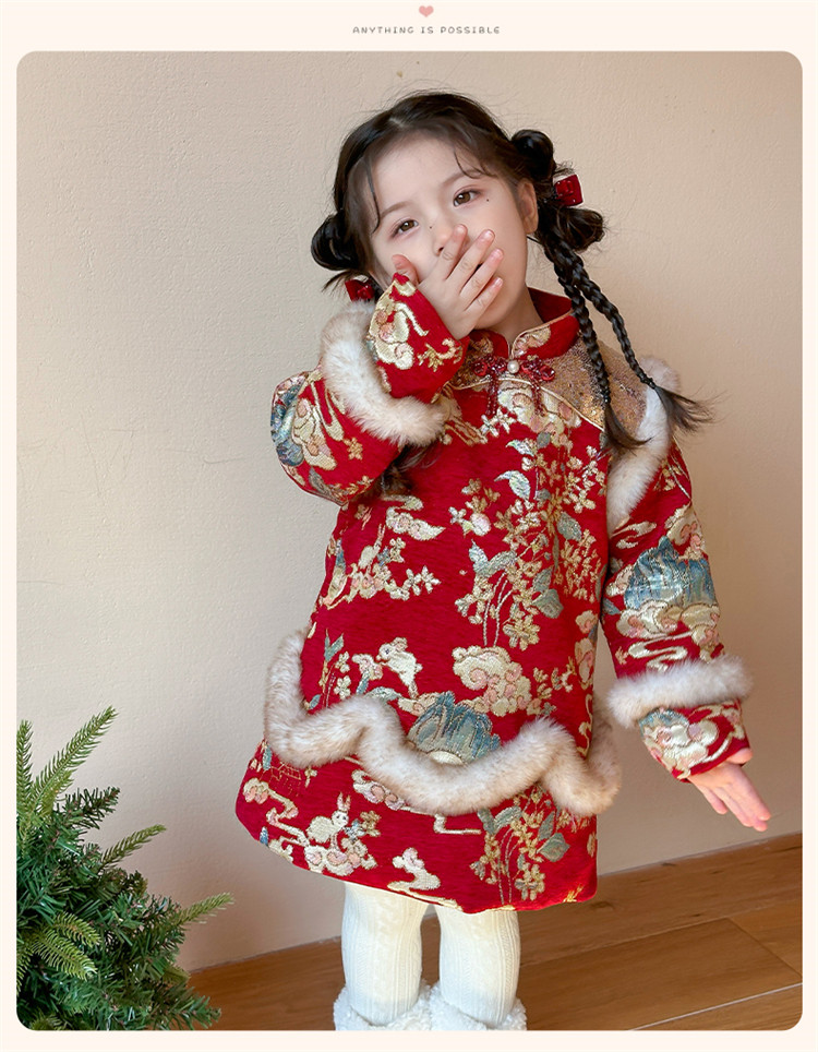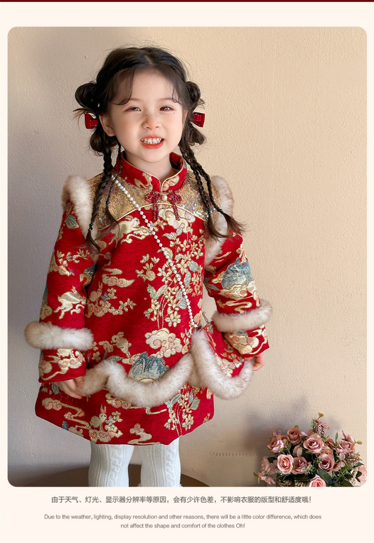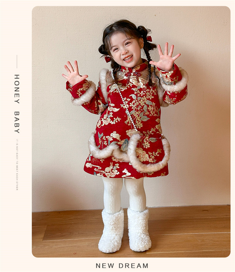 Girls' Fleece-Lined Thickened Cheongsam Dress 2024 Winter New Style Children's Festive Red New Year Outfit