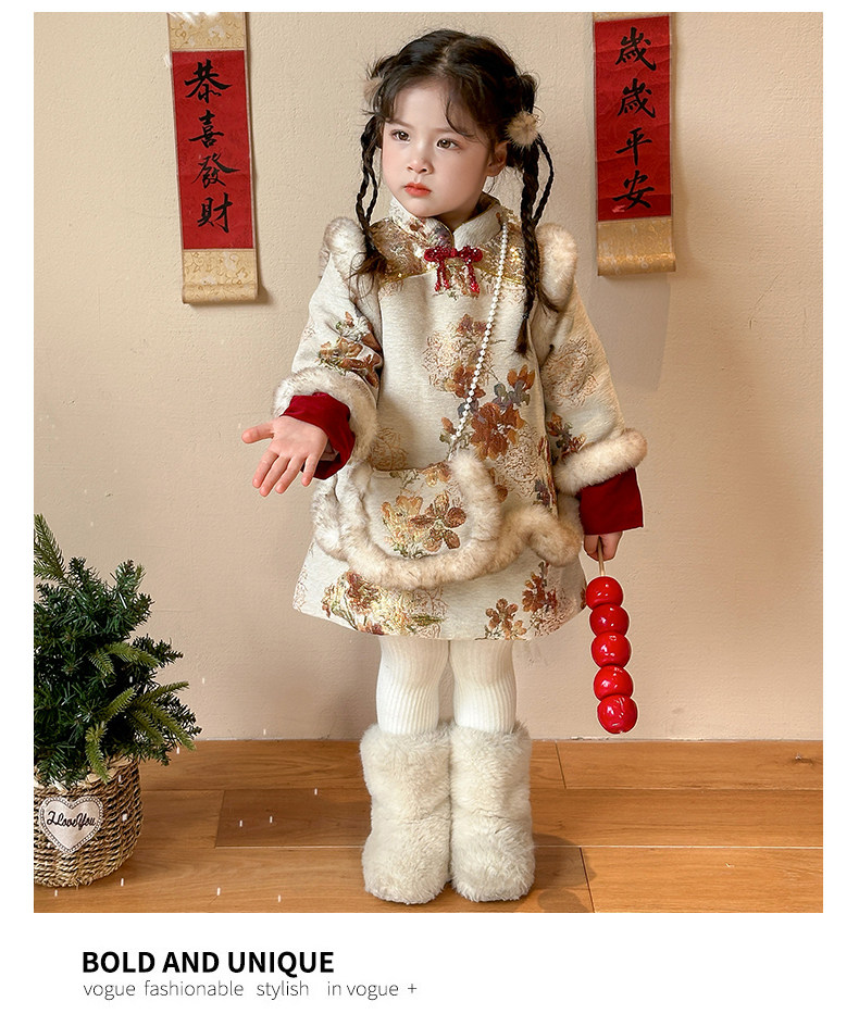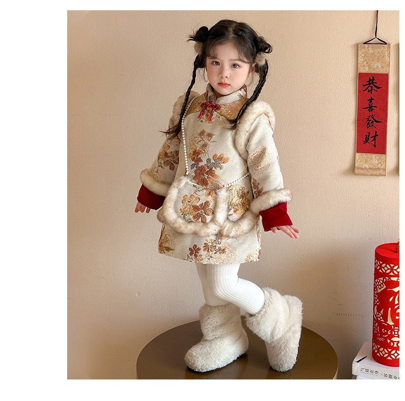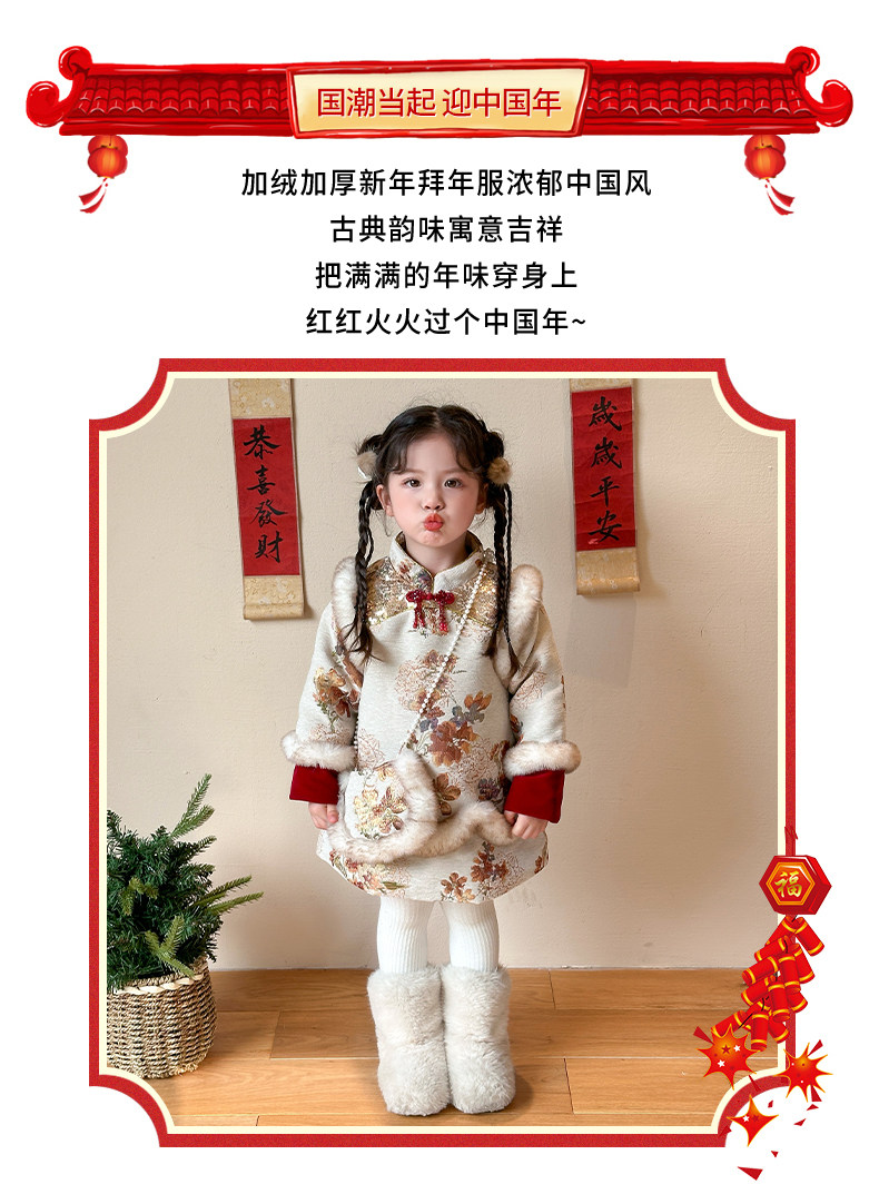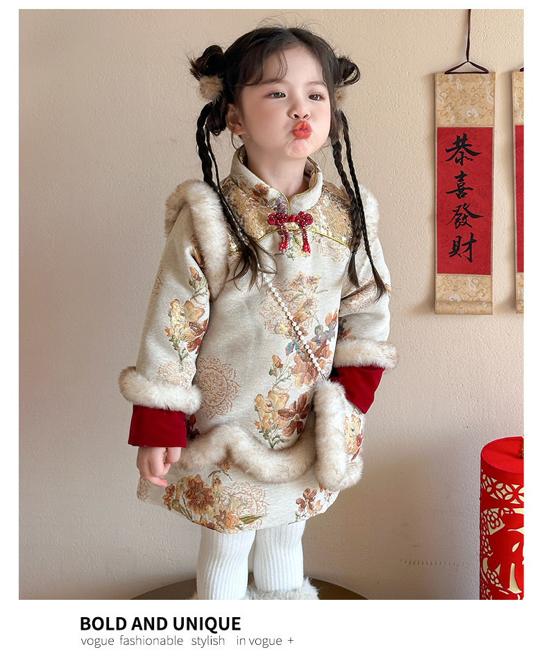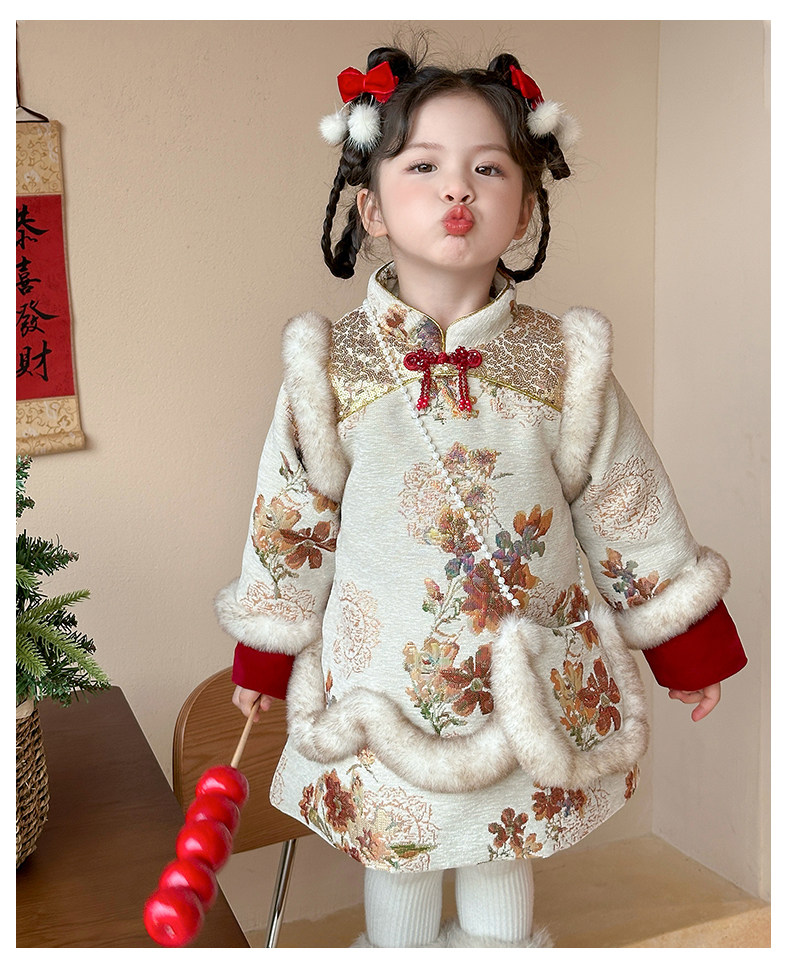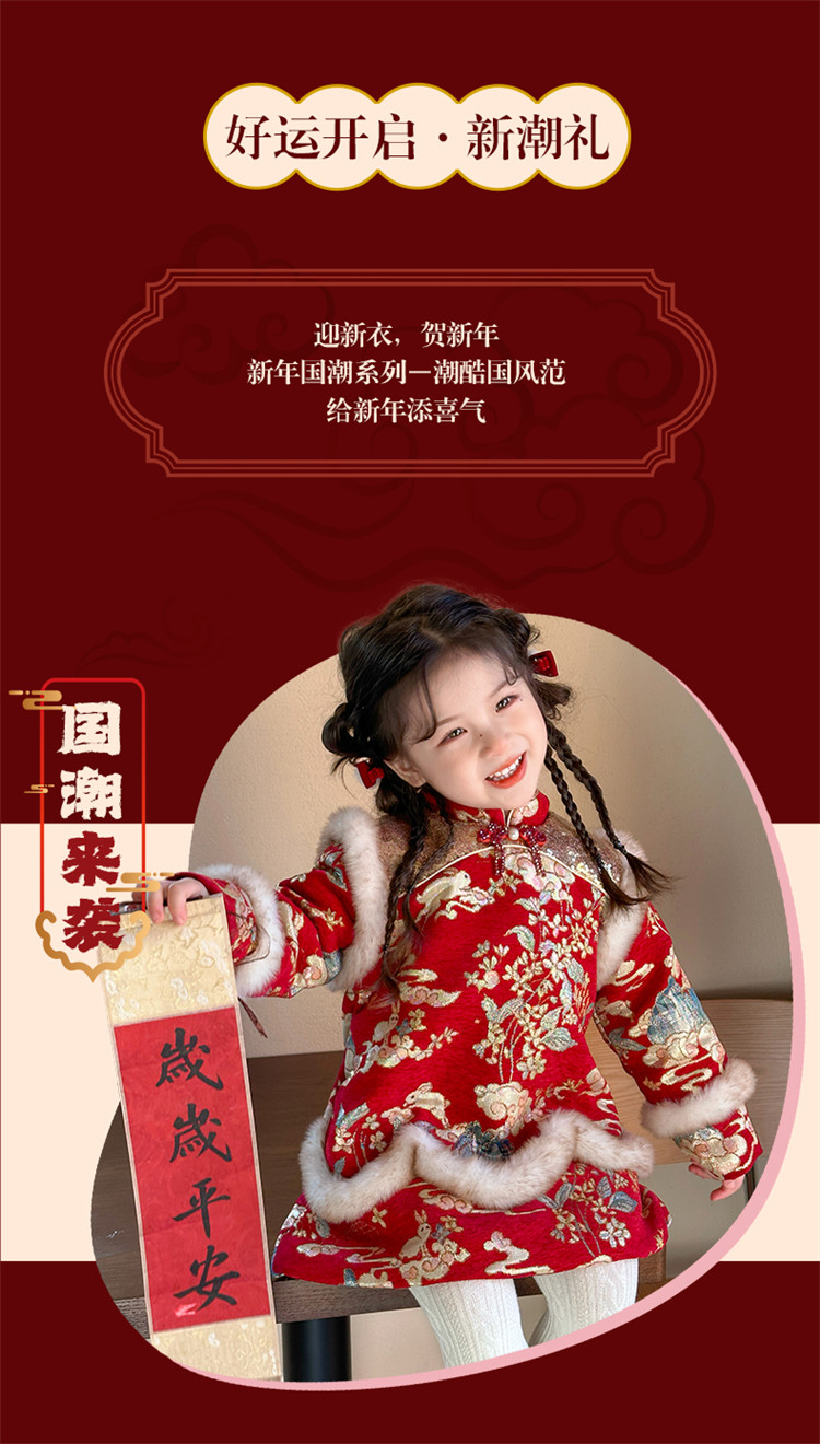 Girls' Fleece-Lined Thickened Cheongsam Dress 2024 Winter New Style Children's Festive Red New Year Outfit