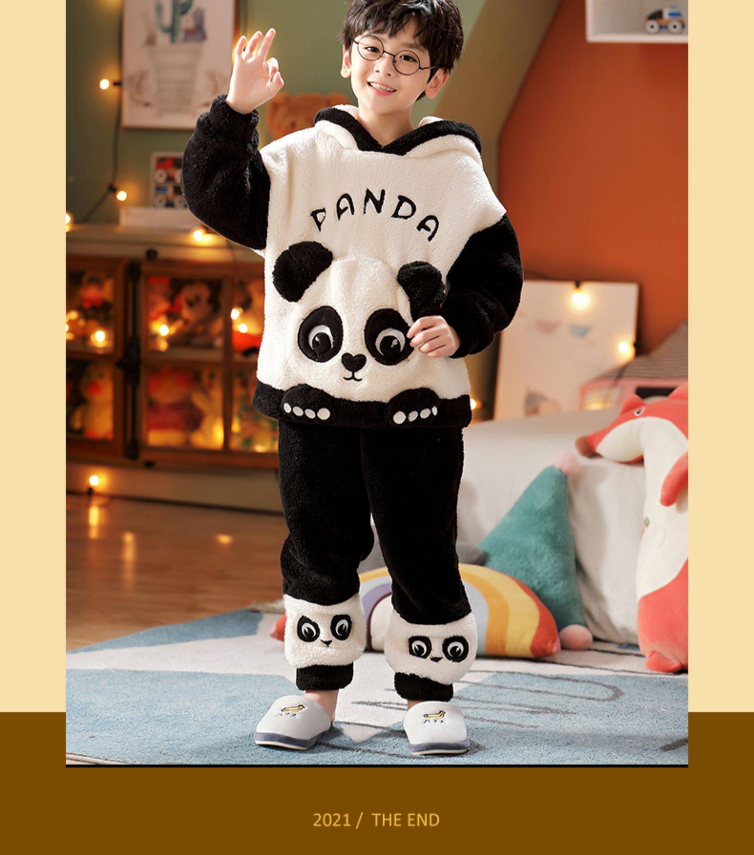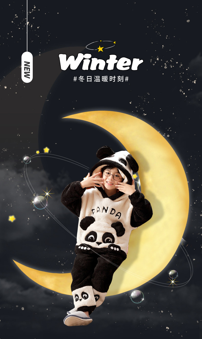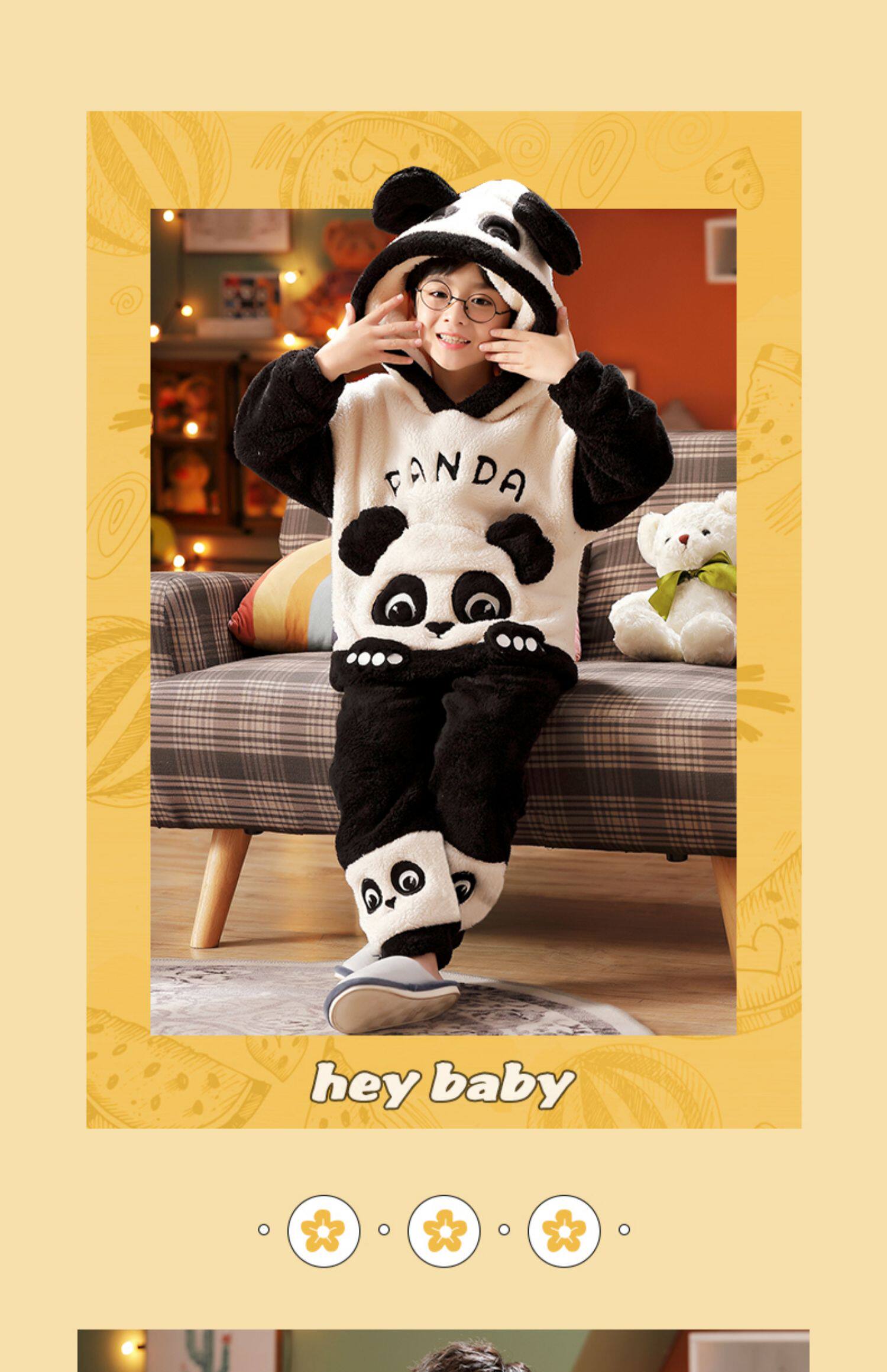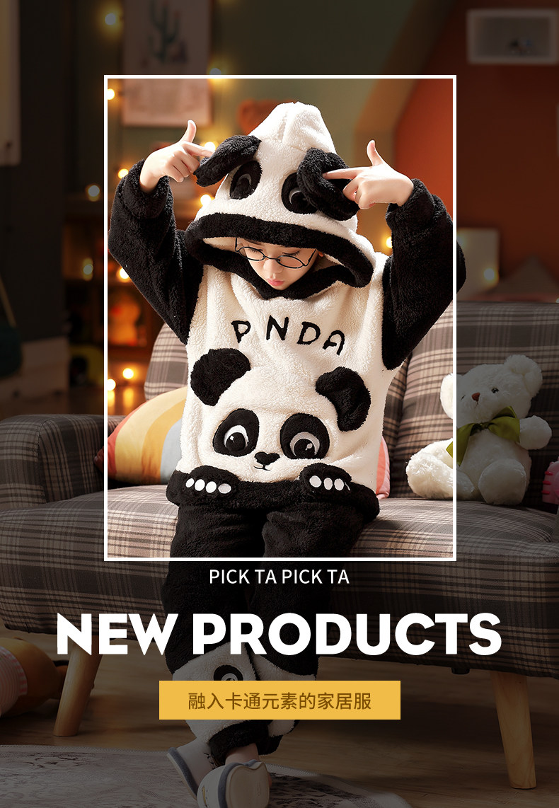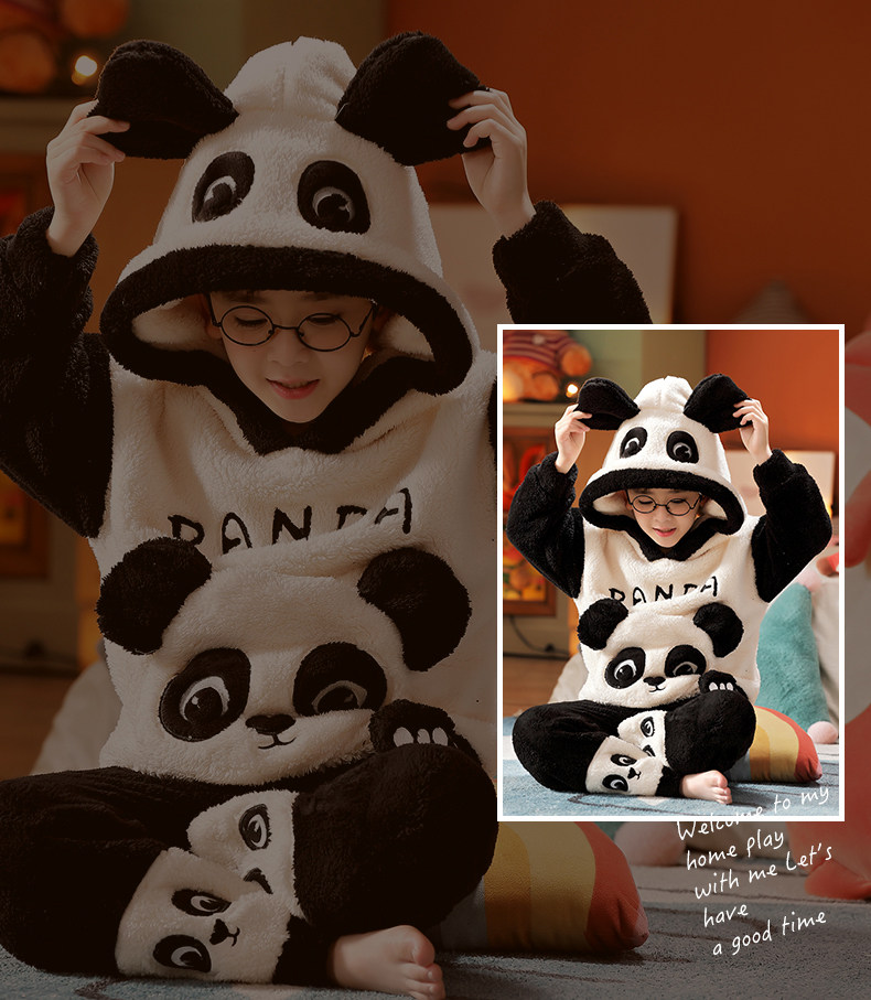Vockoo Boys' Panda Pajamas Fleece-Lined Autumn and Winter Home Clothes Coral Fleece for Older Children Flannel Kidsren's Clothing