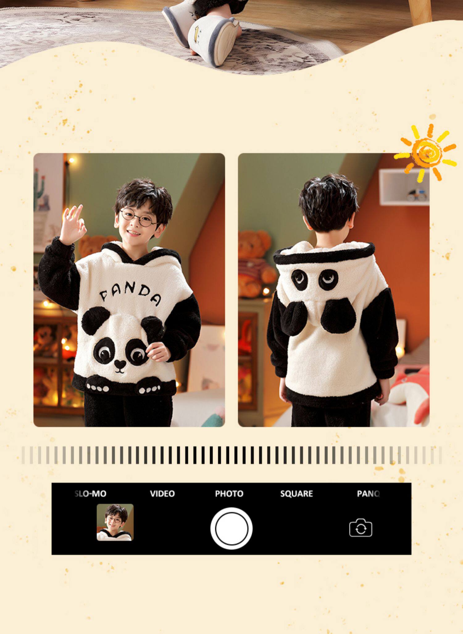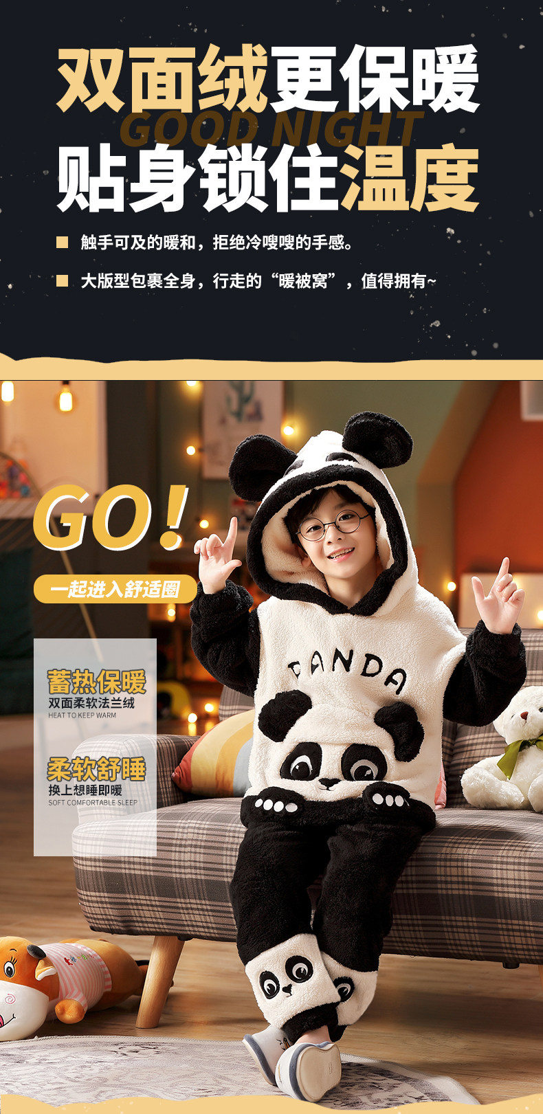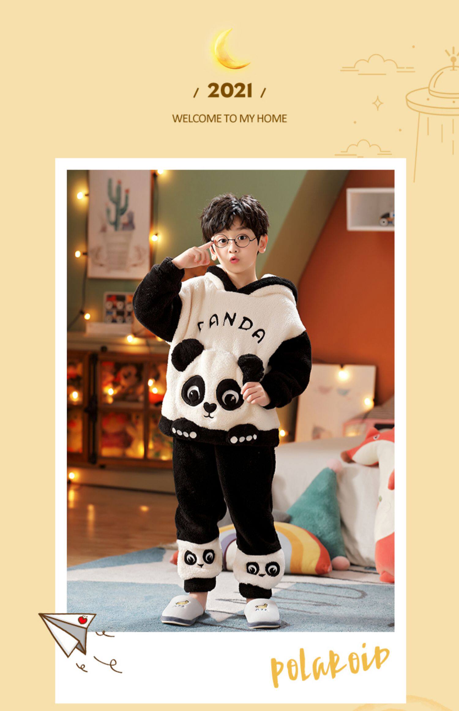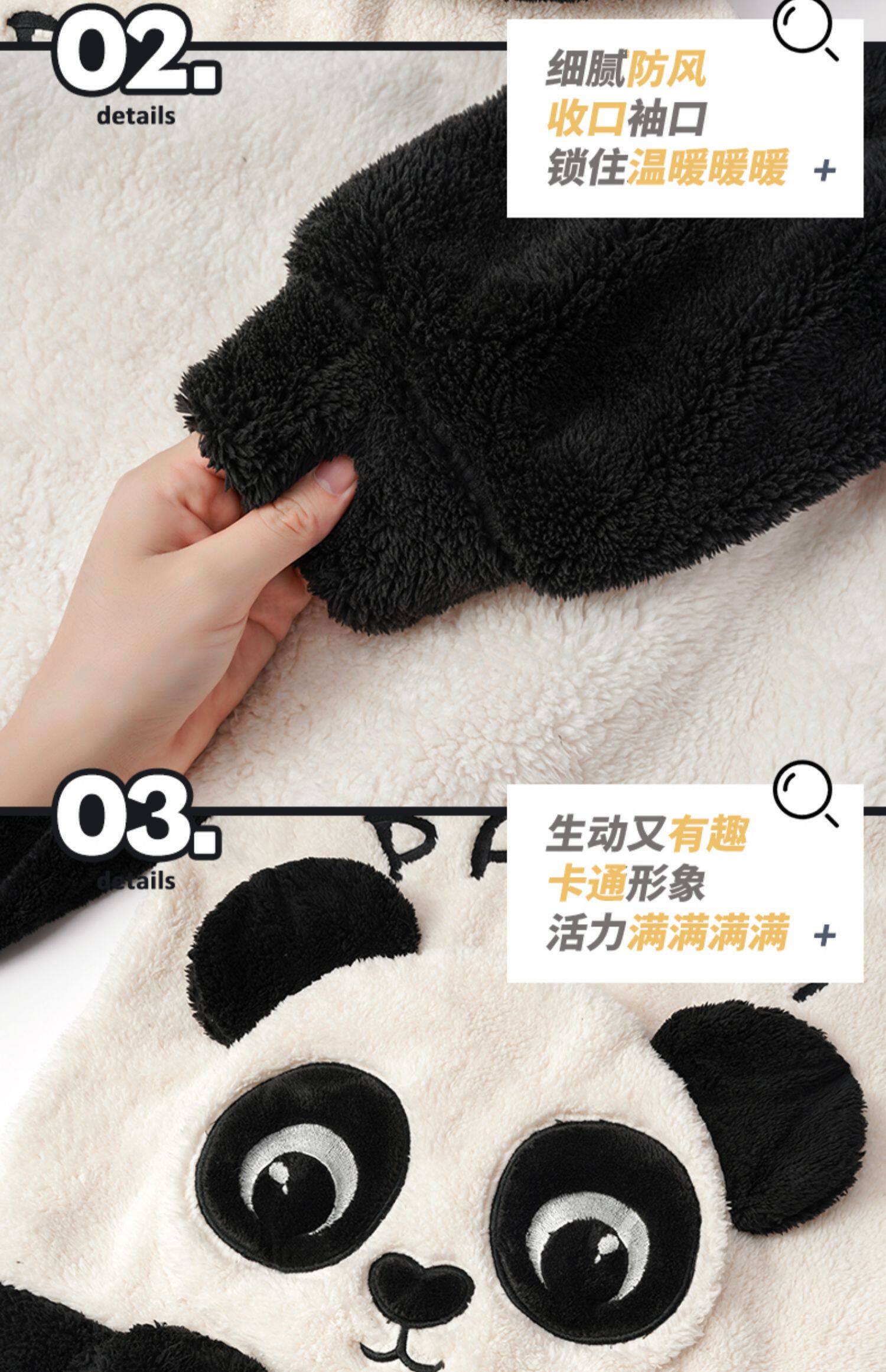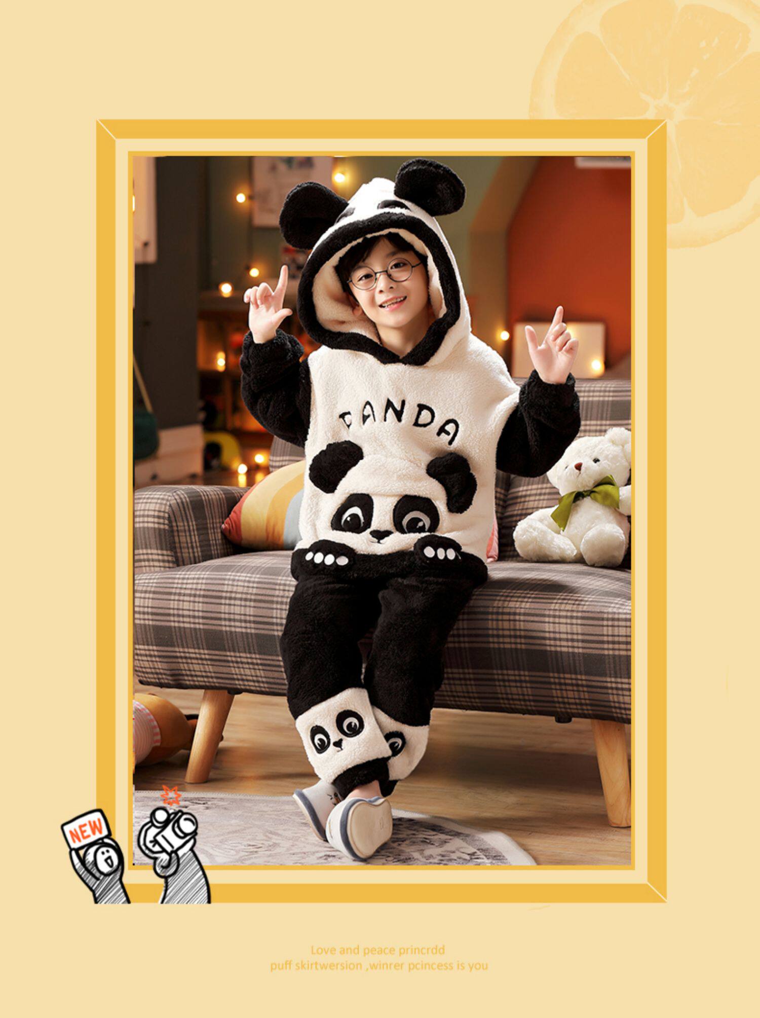 Vockoo Boys' Panda Pajamas Fleece-Lined Autumn and Winter Home Clothes Coral Fleece for Older Children Flannel Kidsren's Clothing