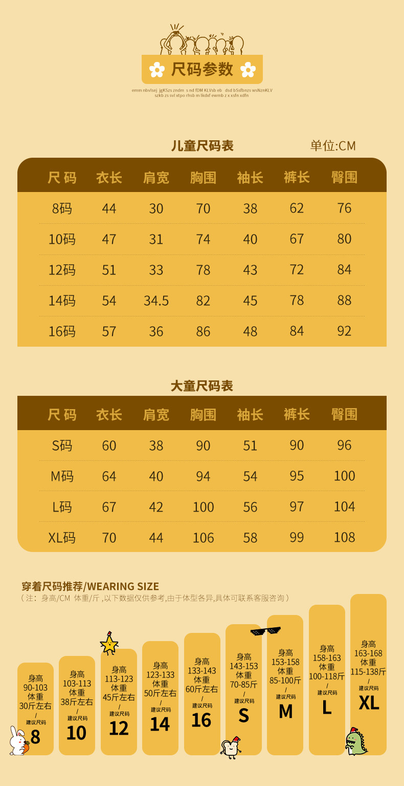 Reference Height Size 8, 100cm 15kg,Size 10, 110cm 19kg,Size 12, 120cm 22.5kg,Size 14, 130cm 27.5kg,Size 16 140cm 32.5kg,S Size 150cm 37.5kg,M Size 160cm 45kg,L Size 165cm 52.5kg,XL Size 170cm 59-72.5kg
