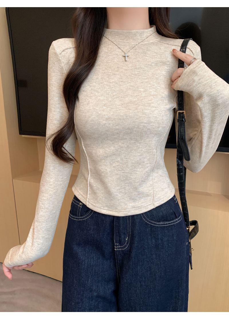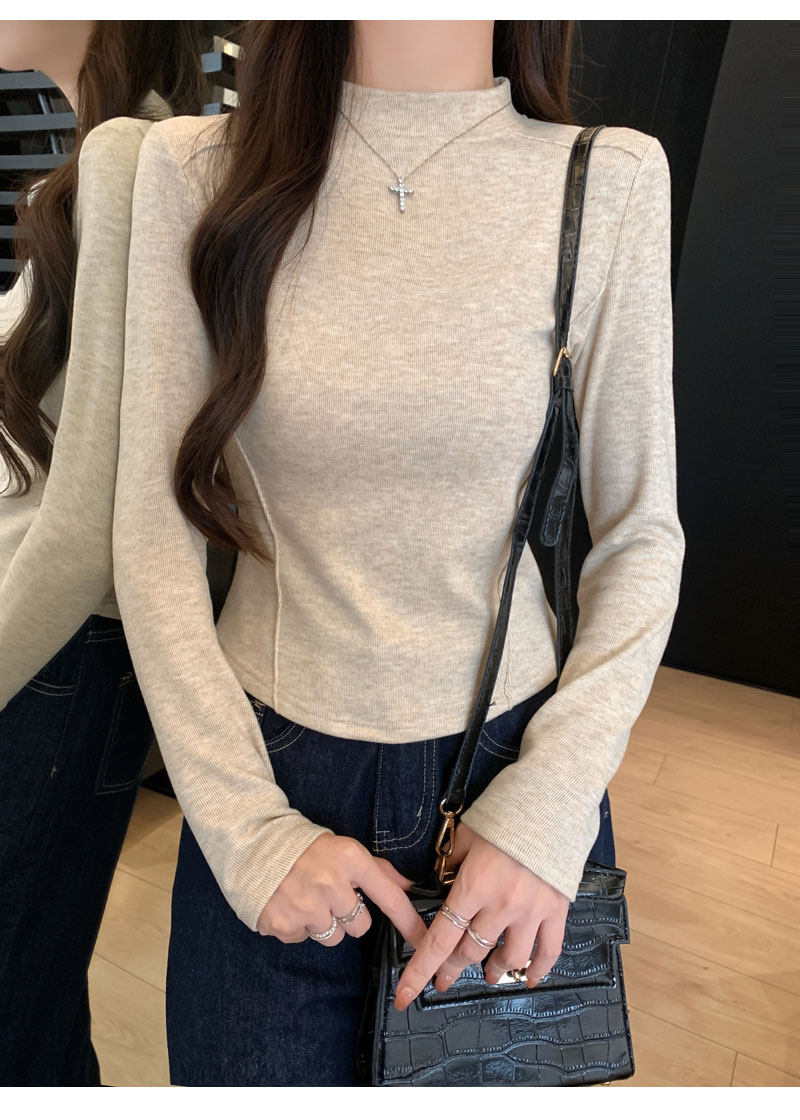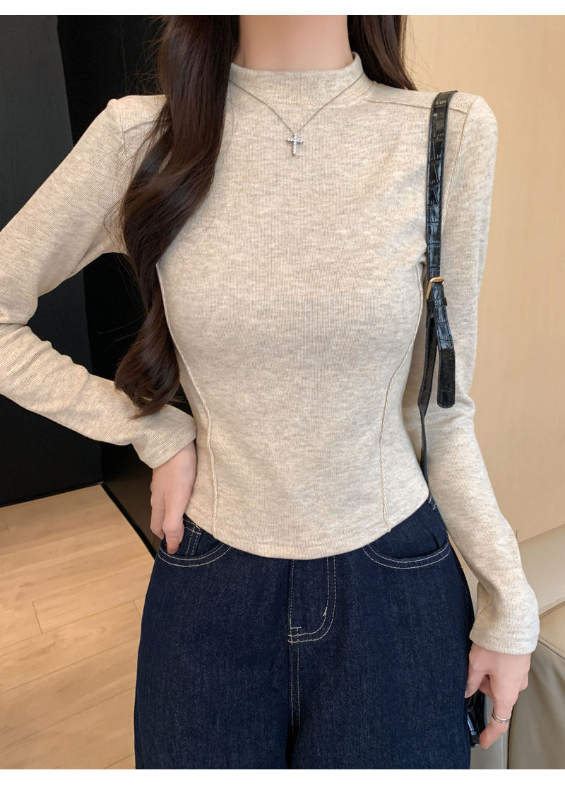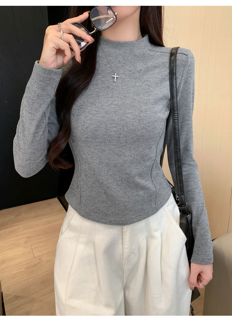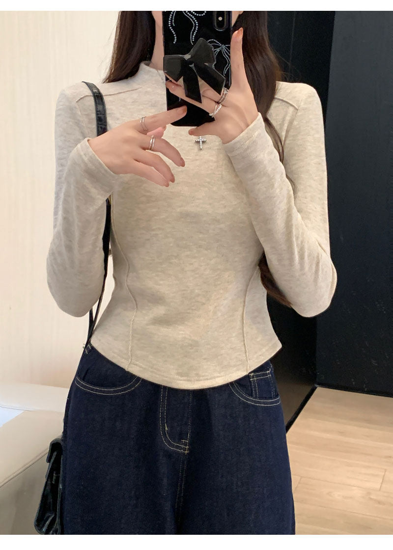 Women's Long-Sleeved Half-High Collar Base Shirt with Brushed Fleece Lining, New Autumn and Winter Design with Fishbone Line and Curved Hem