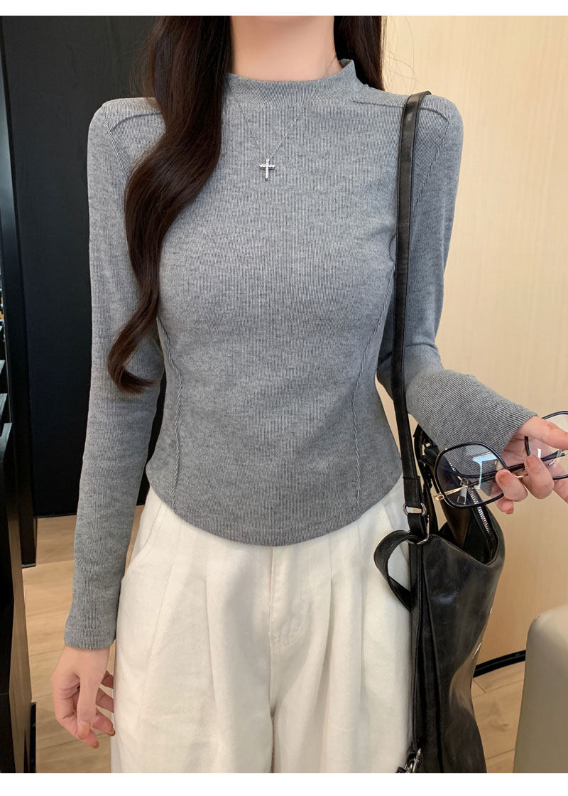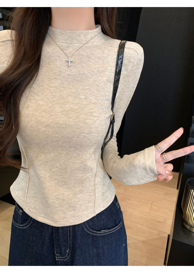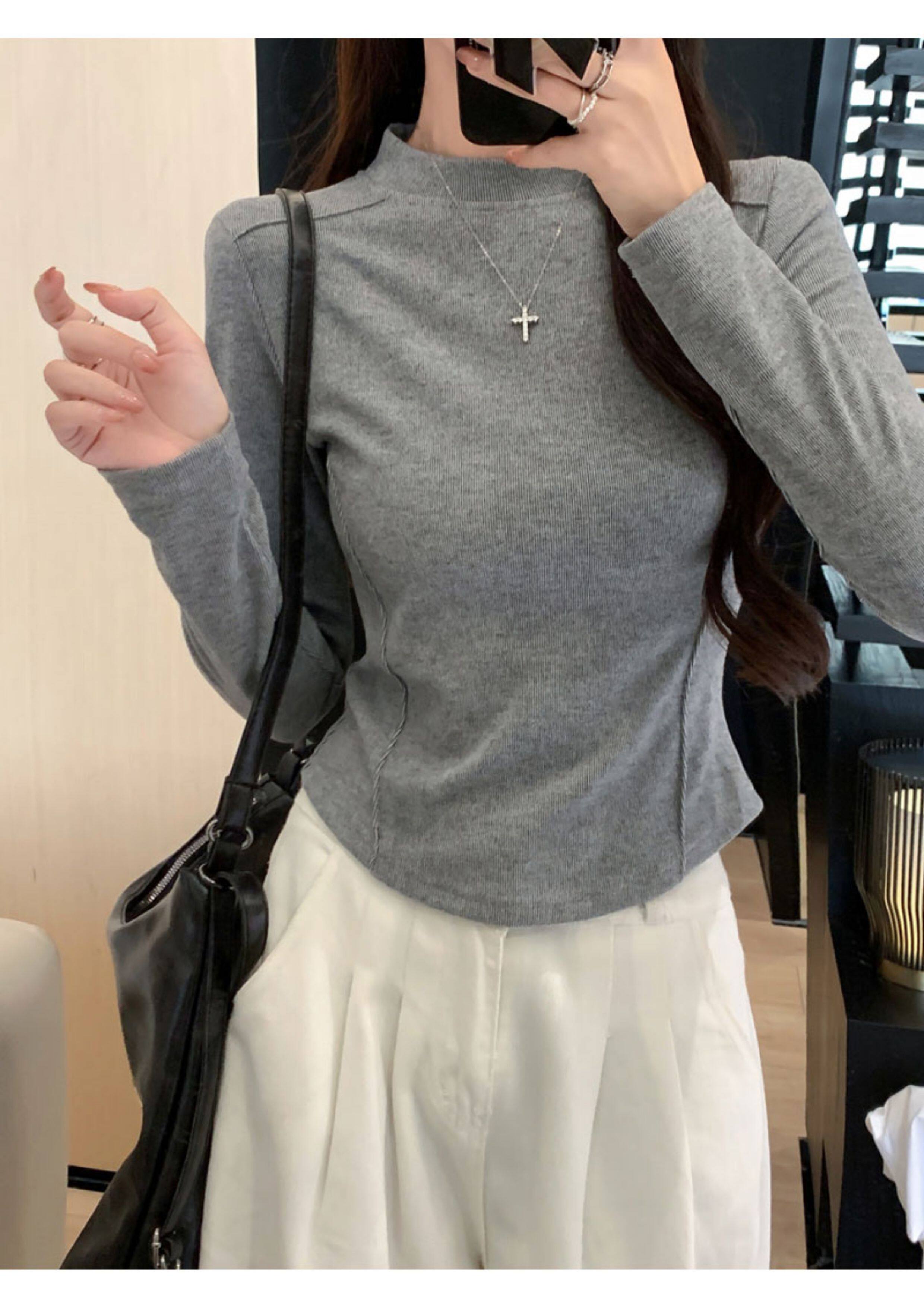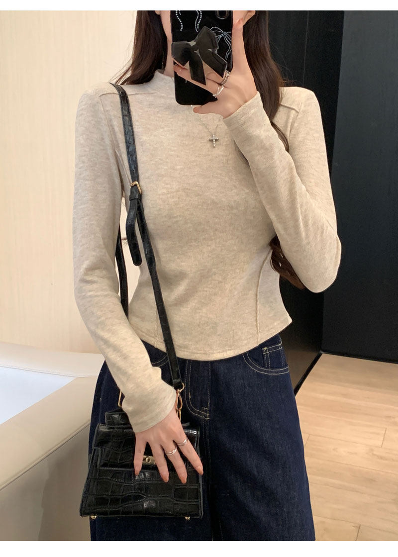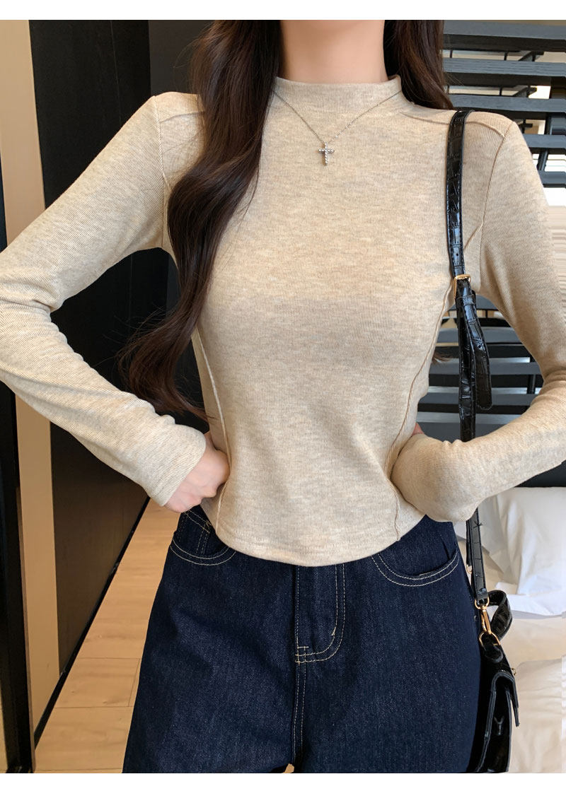 Women's Long-Sleeved Half-High Collar Base Shirt with Brushed Fleece Lining, New Autumn and Winter Design with Fishbone Line and Curved Hem