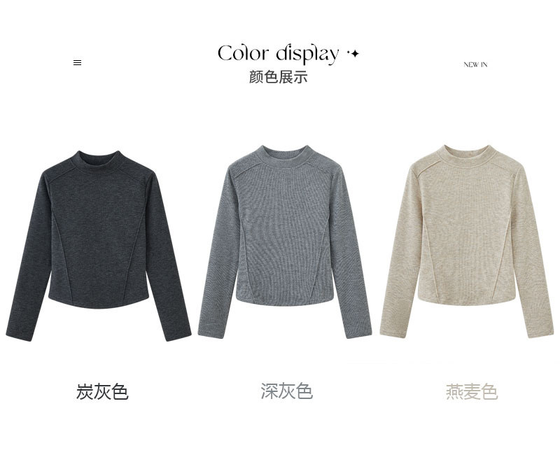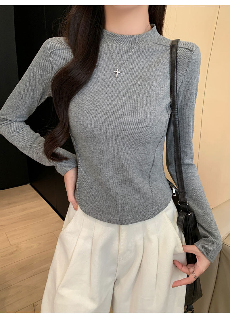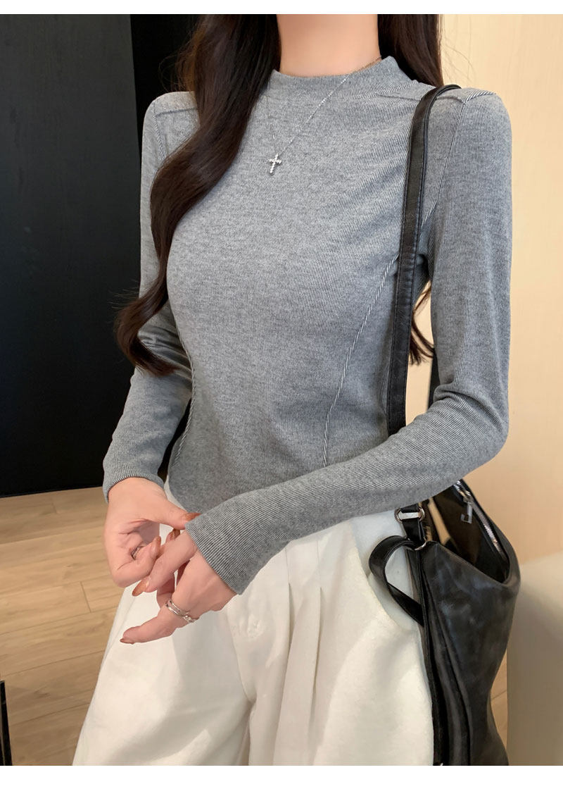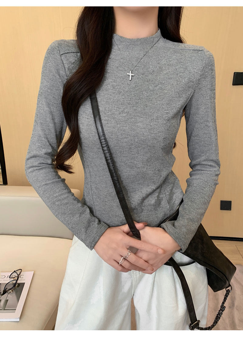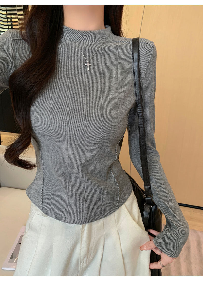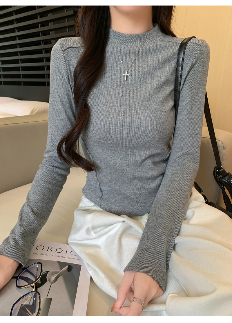 Women's Long-Sleeved Half-High Collar Base Shirt with Brushed Fleece Lining, New Autumn and Winter Design with Fishbone Line and Curved Hem