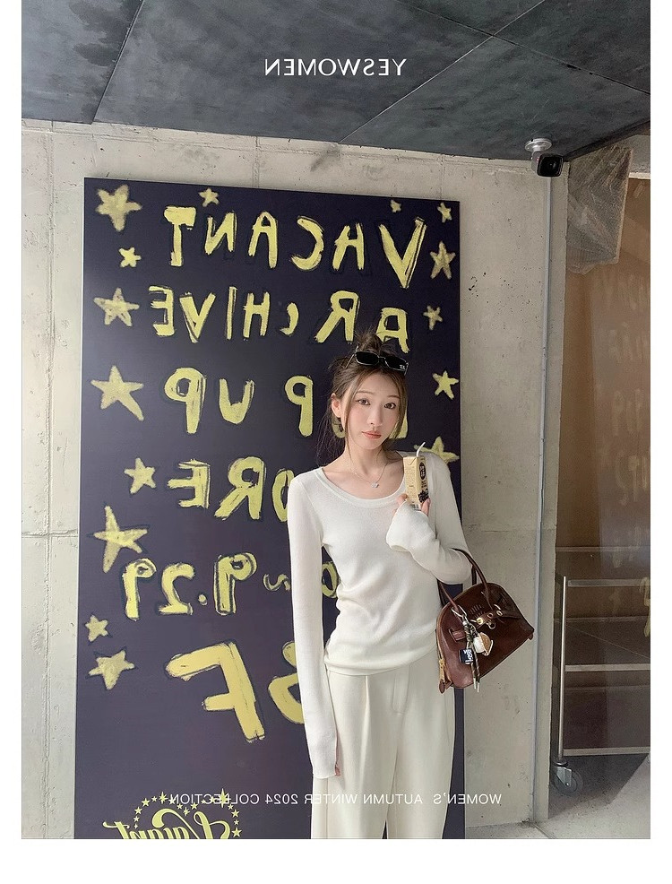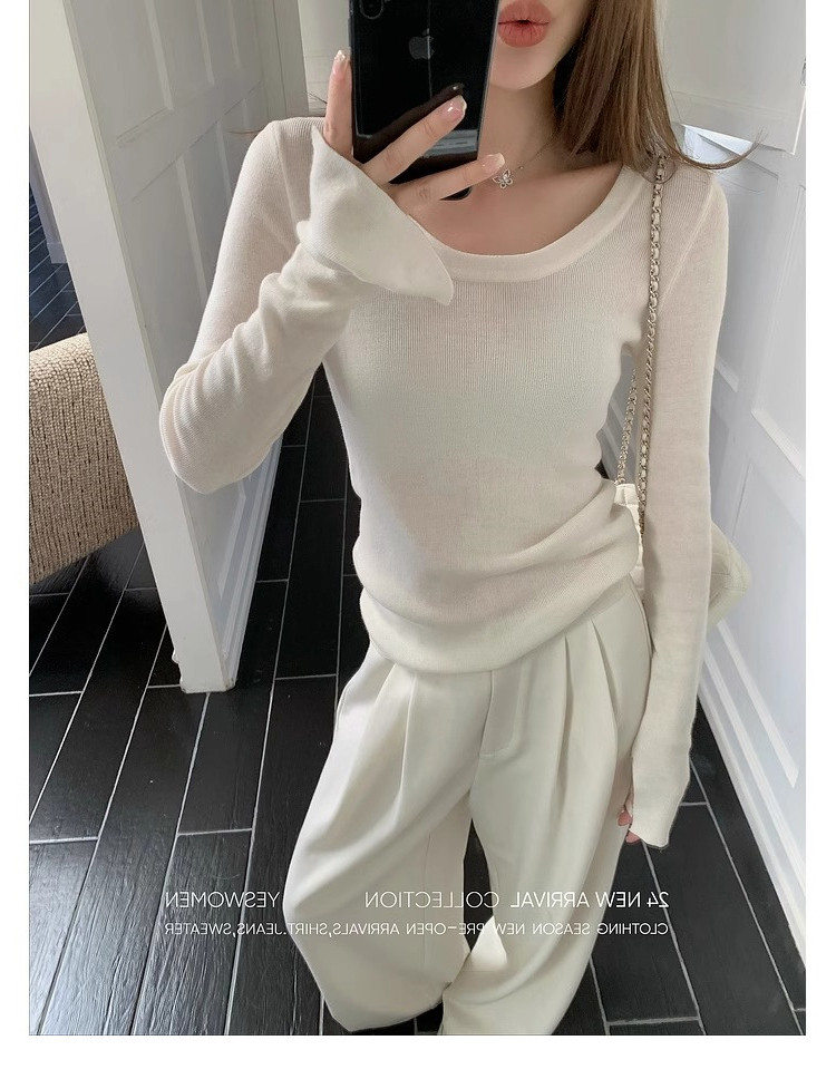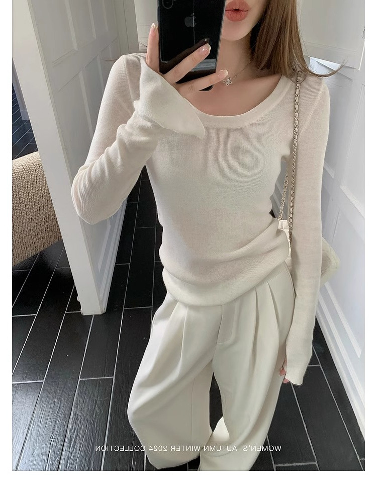 Autumn and Winter Gentle White Large-Neck Wool Knit Sweater for Women, Stylish Slim-Fit Base Sweater with Bell Sleeves for Layering