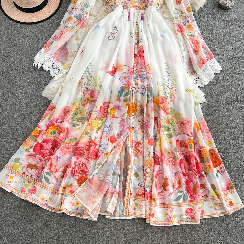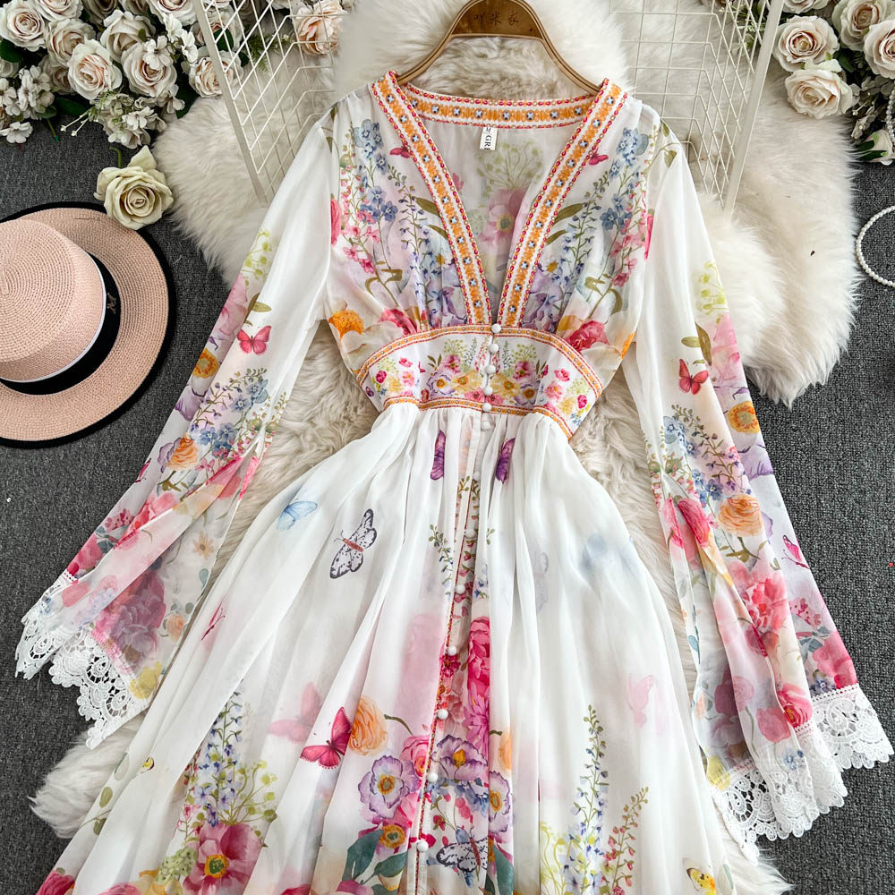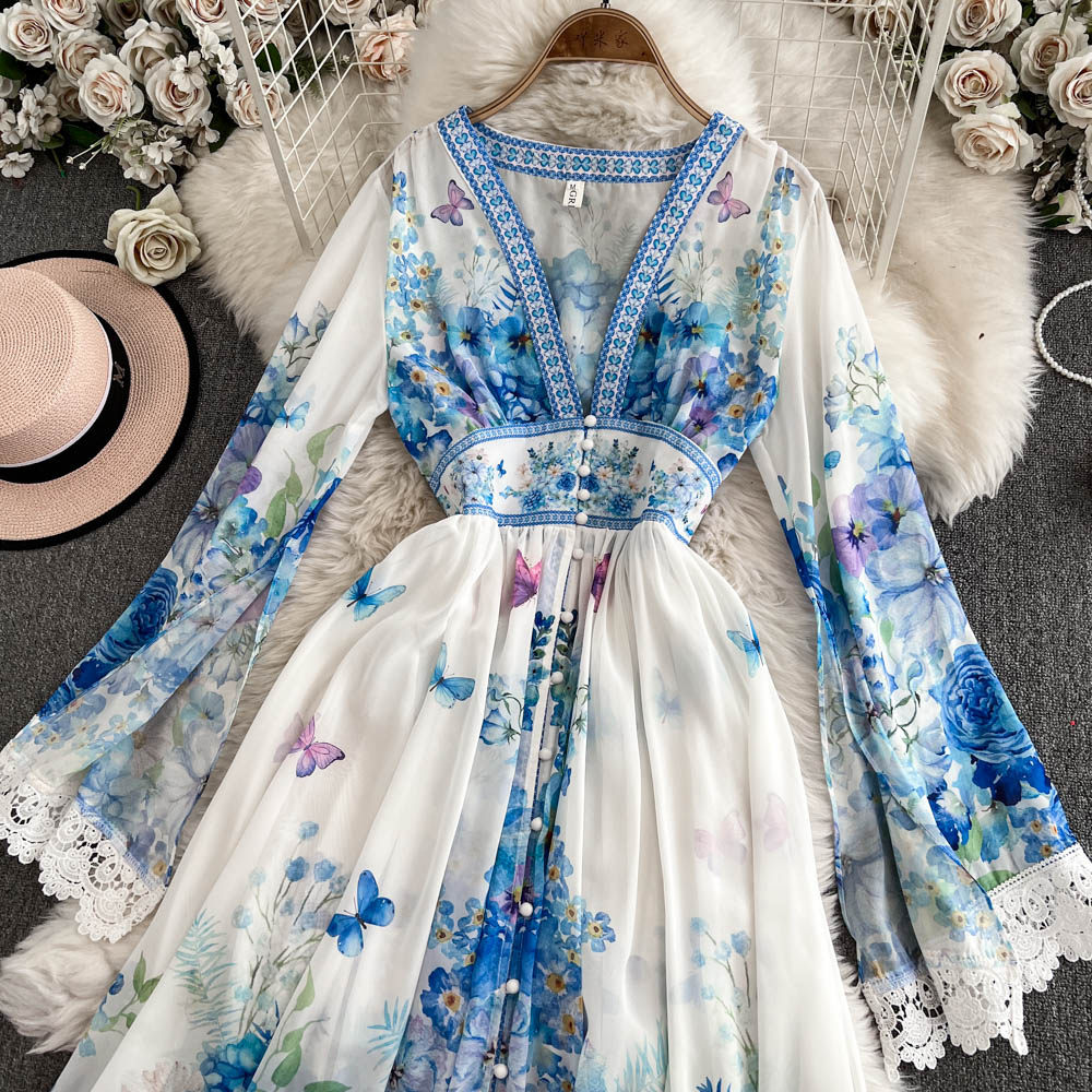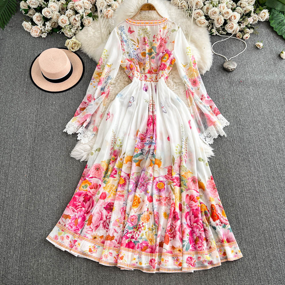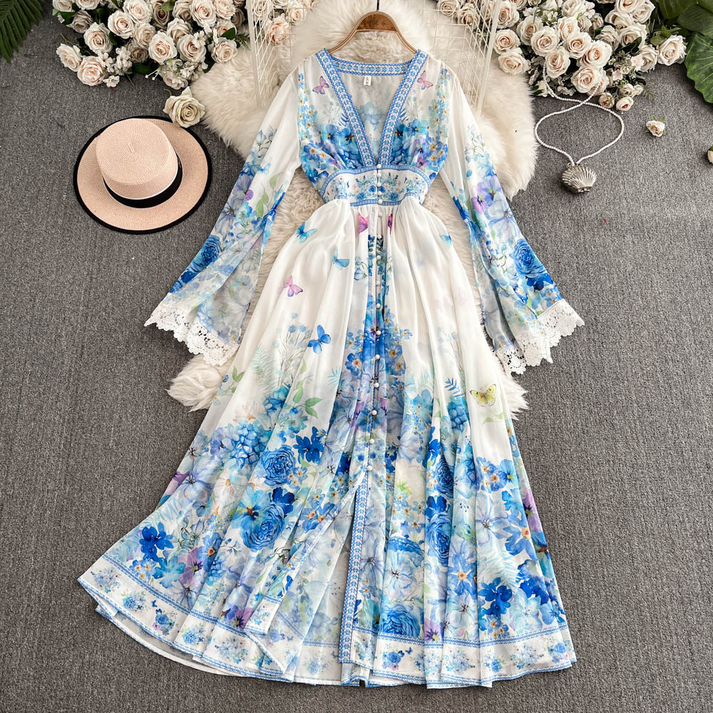 European and American palace style dress, sexy deep V-neck, buttoned waist, slimming and long design, printed temperament dress