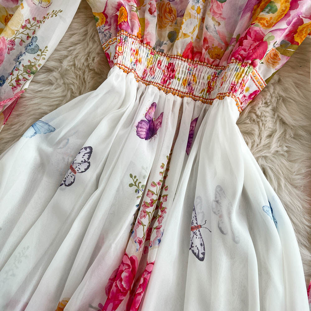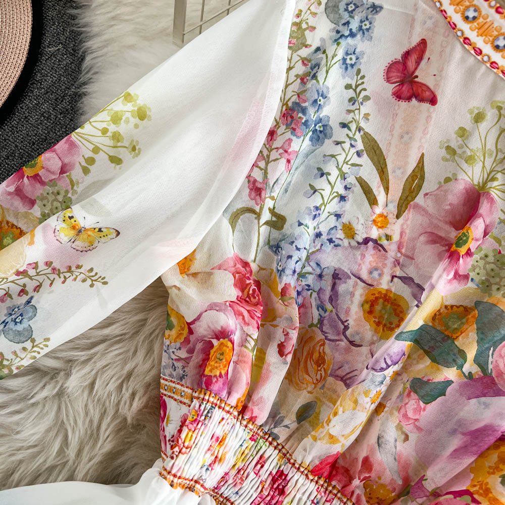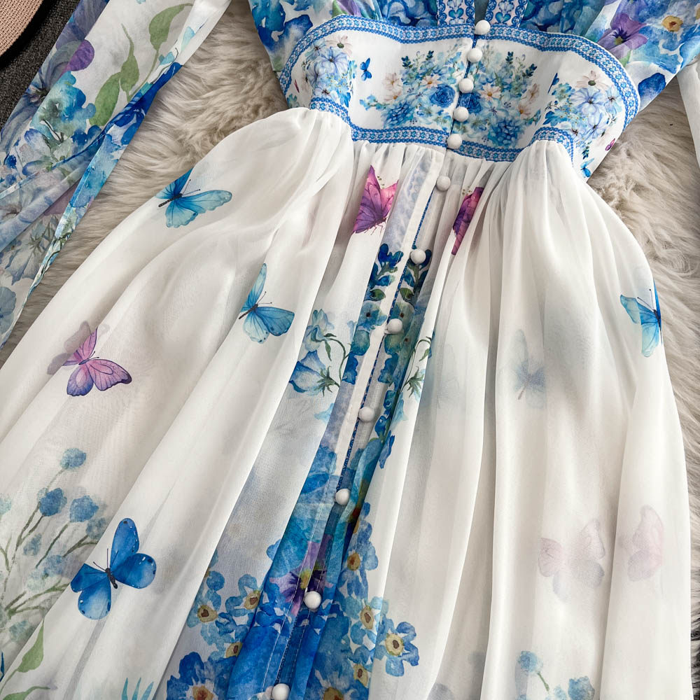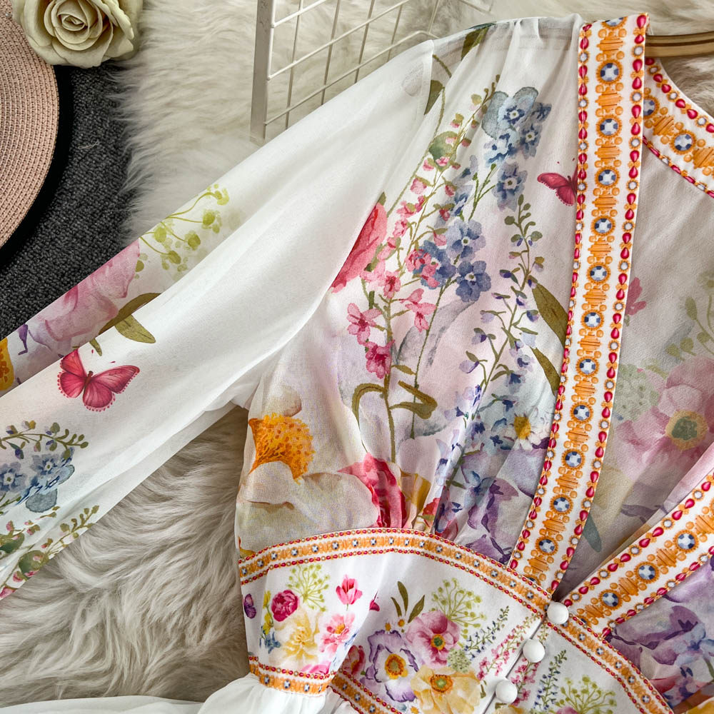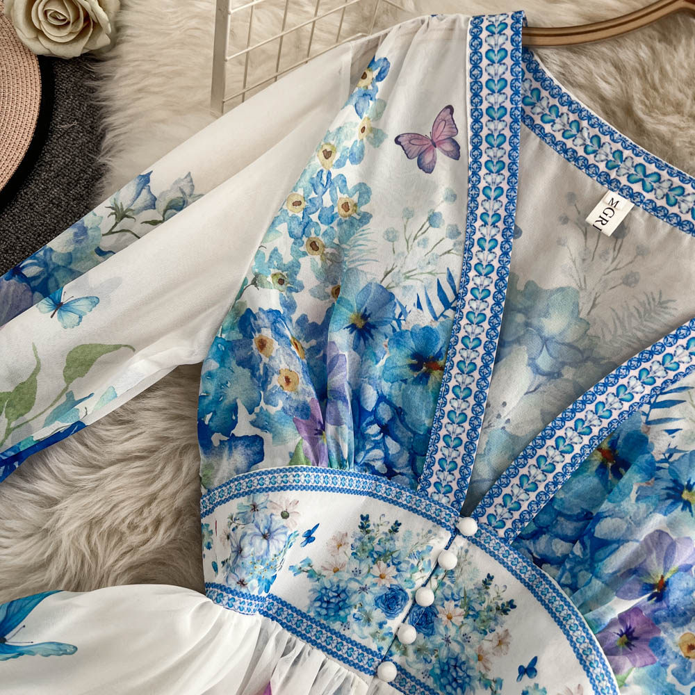 European and American palace style dress, sexy deep V-neck, buttoned waist, slimming and long design, printed temperament dress