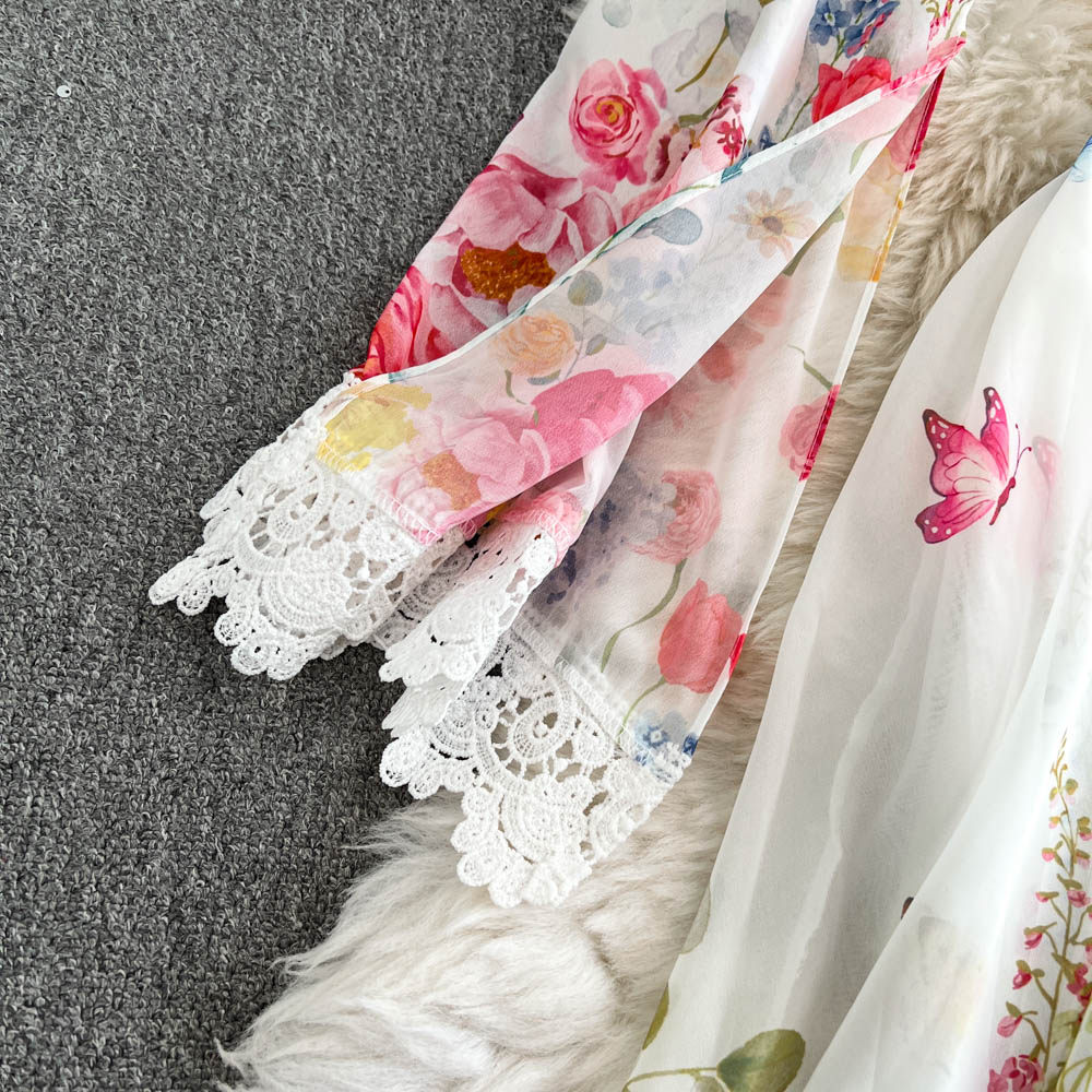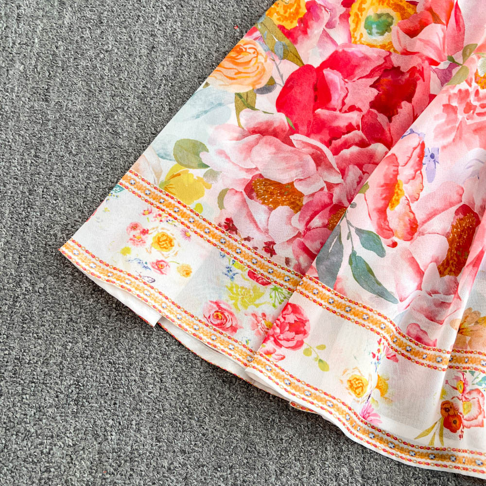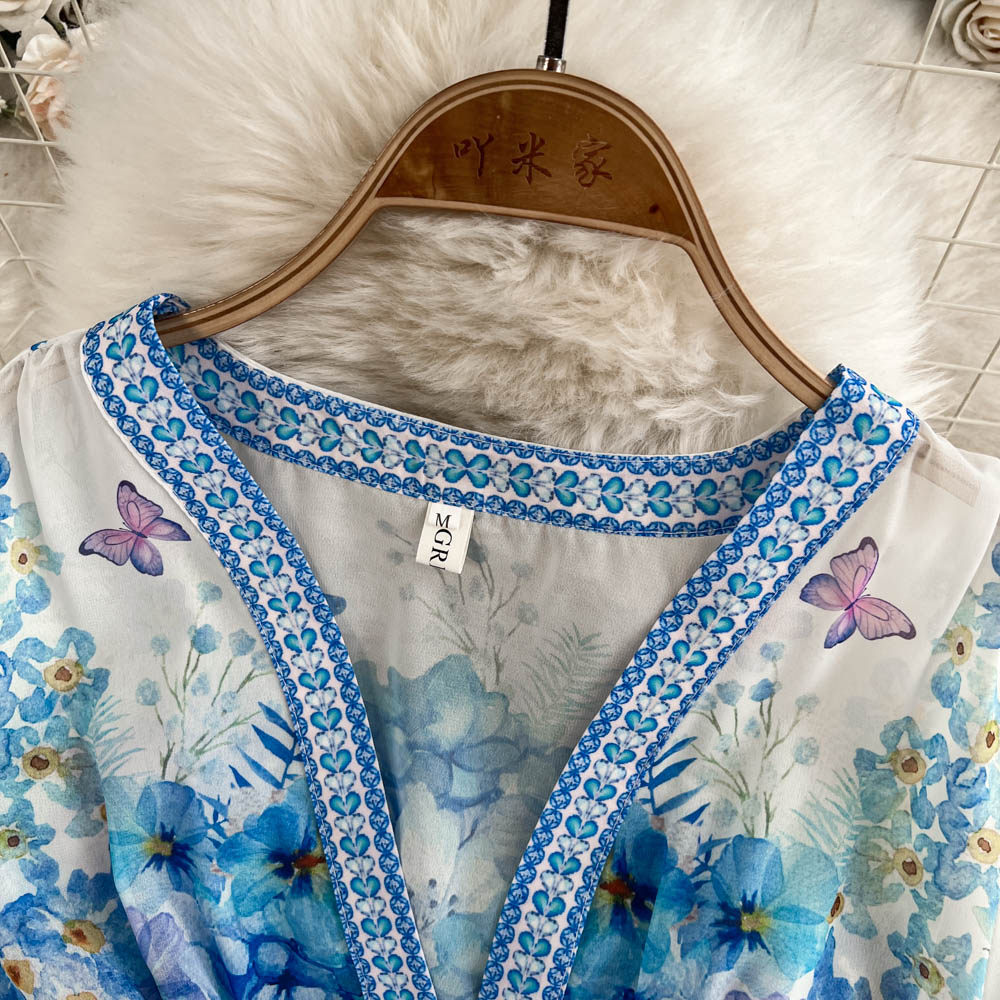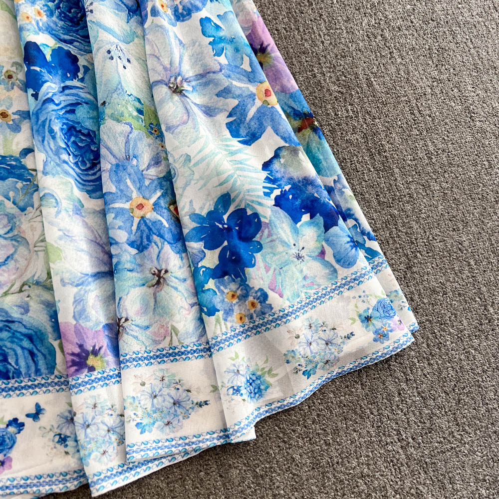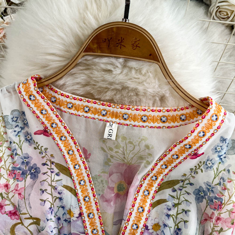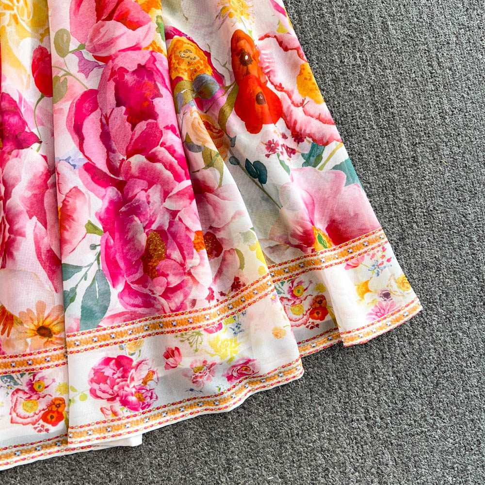 European and American palace style dress, sexy deep V-neck, buttoned waist, slimming and long design, printed temperament dress