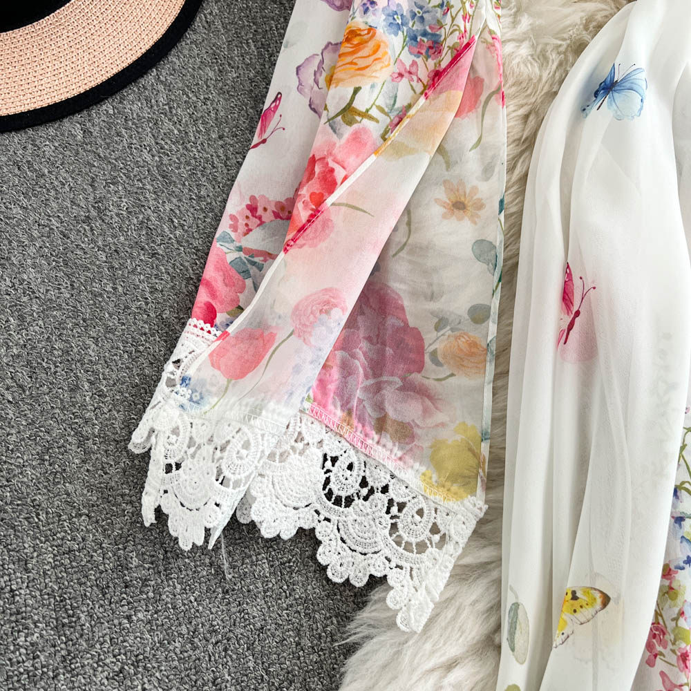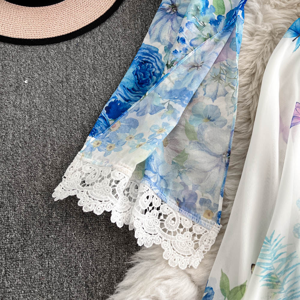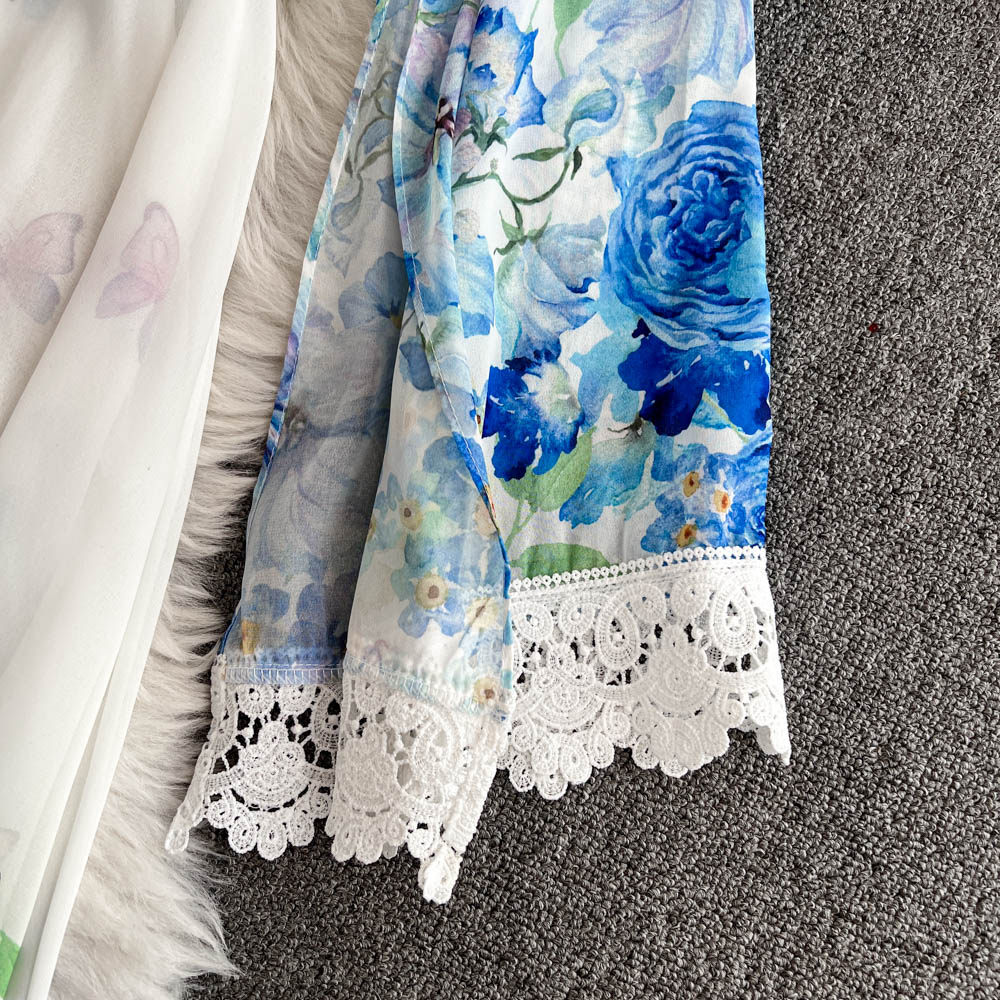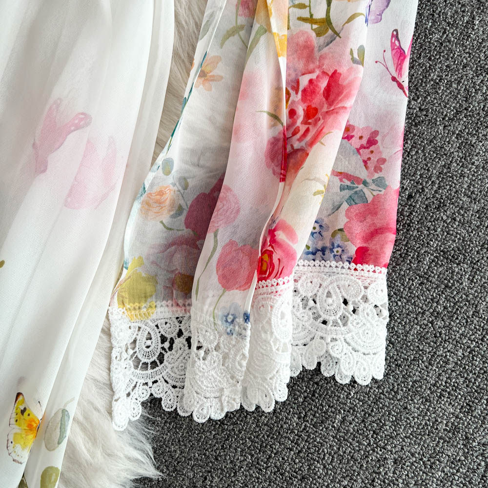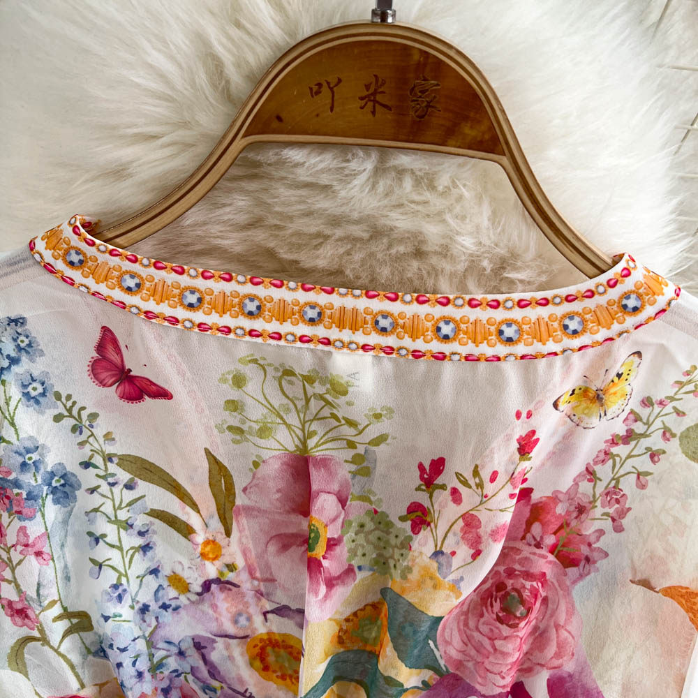 European and American palace style dress, sexy deep V-neck, buttoned waist, slimming and long design, printed temperament dress