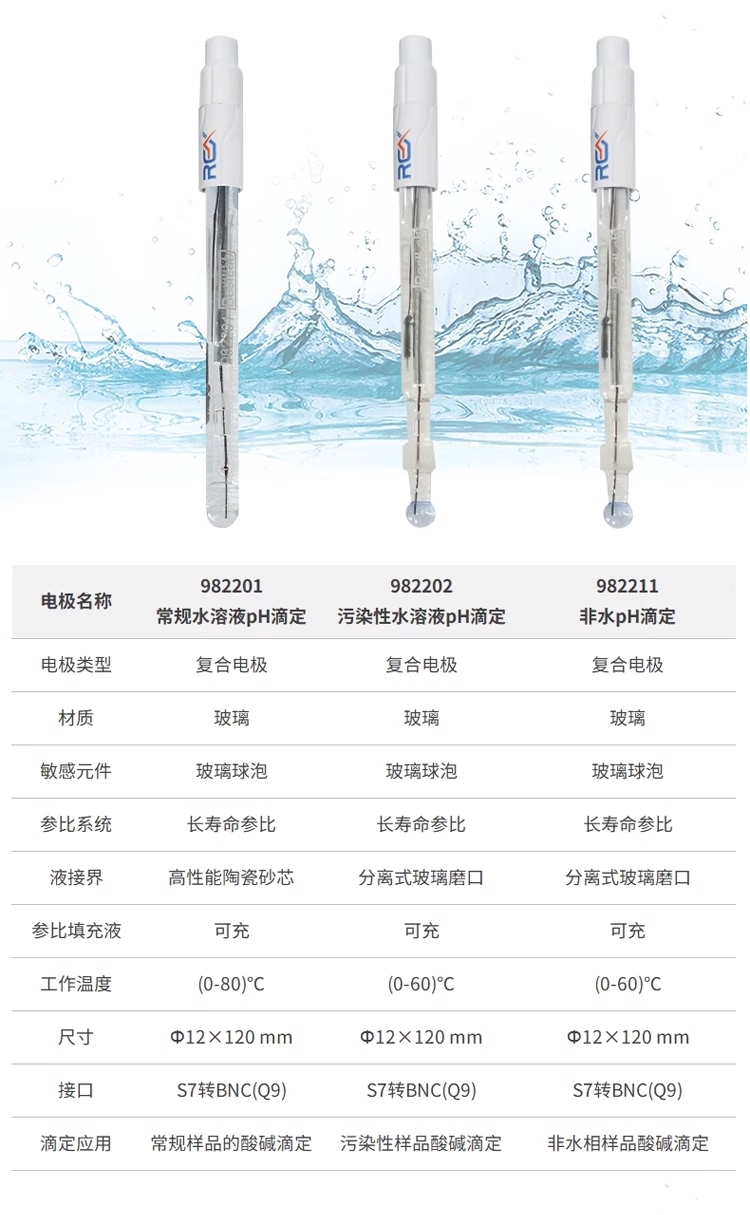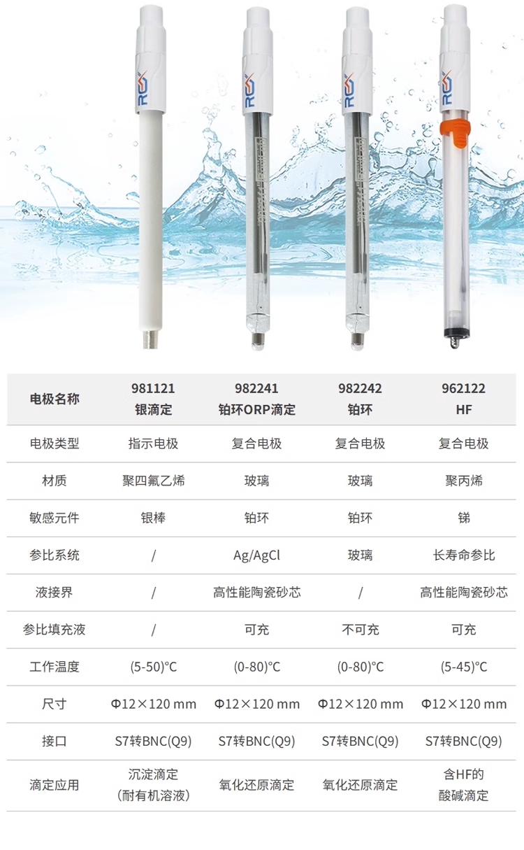 Color Classification 982201 Conventional Ph Titration Electrode,982202 Anti-Pollution Ph Titration Electrode,982211 Ph Titration Electrode for Non-Aqueous Solutions,981121 Silver Titration Electrode,982243 Silver Composite Electrode,982244 Silver Titration Electrode,982241 Platinum Ring Orp Titration Electrode,Type 982245 Platinum Titration Electrode,992201 Platinum Ring Orp Composite Electrode,Type 982242 Platinum Ring Composite Electrode,962122 Hydrofluoric Acid Titration Electrode
