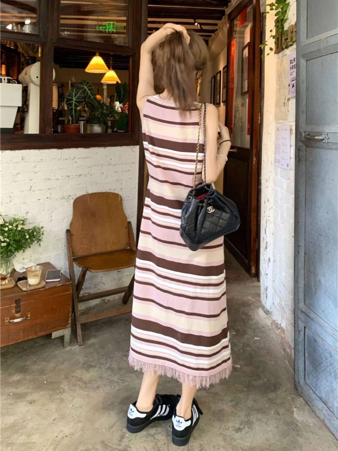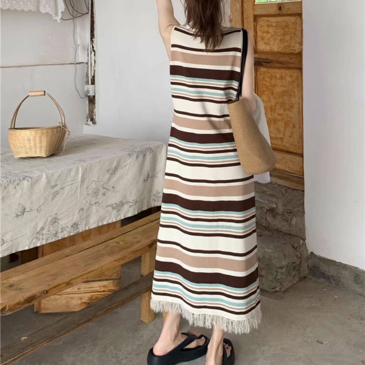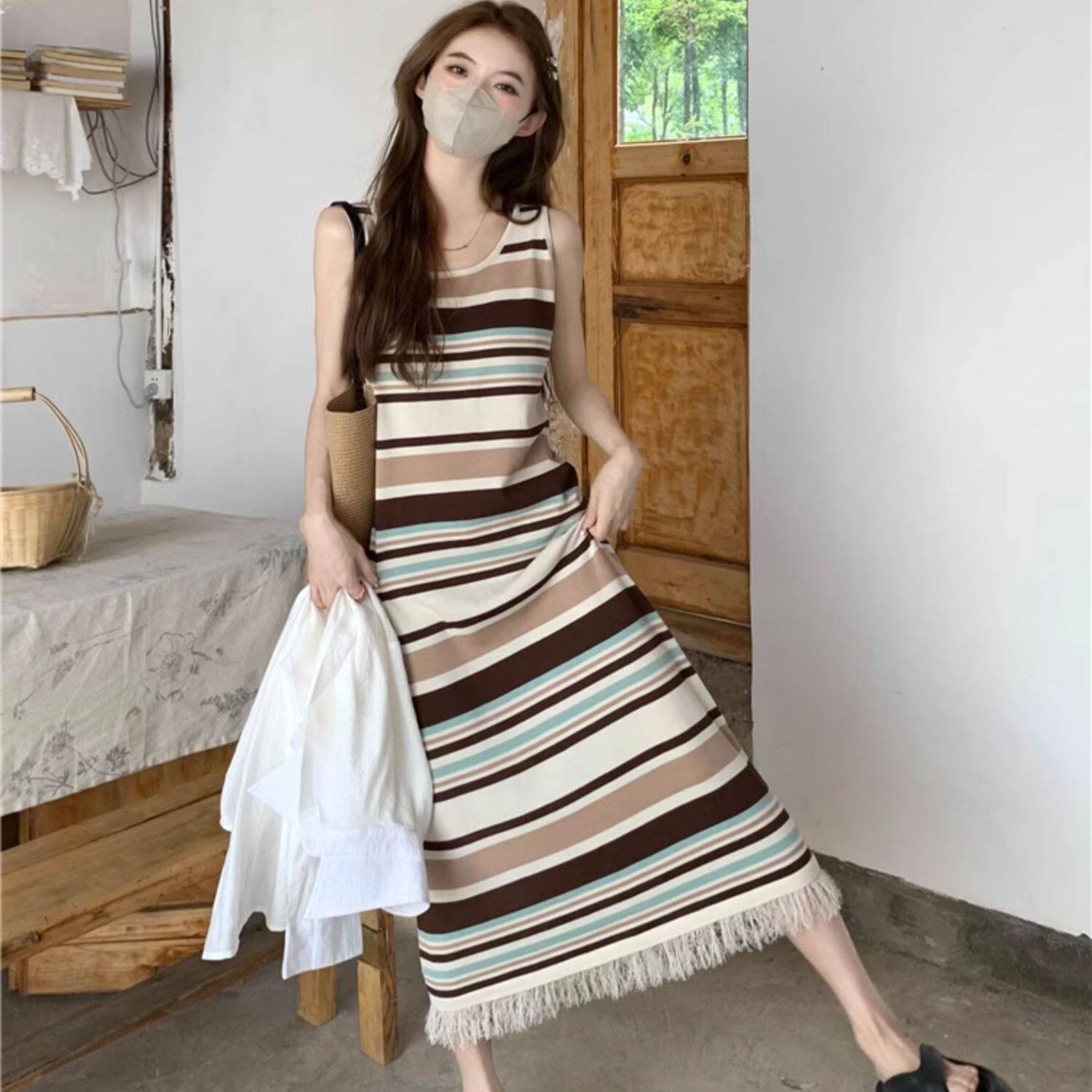 Colorful Stripesd Fat mm Sleeveless Vest Dress Women's Summer Loose Slimming Look Casual French Fringed Long Skirt
