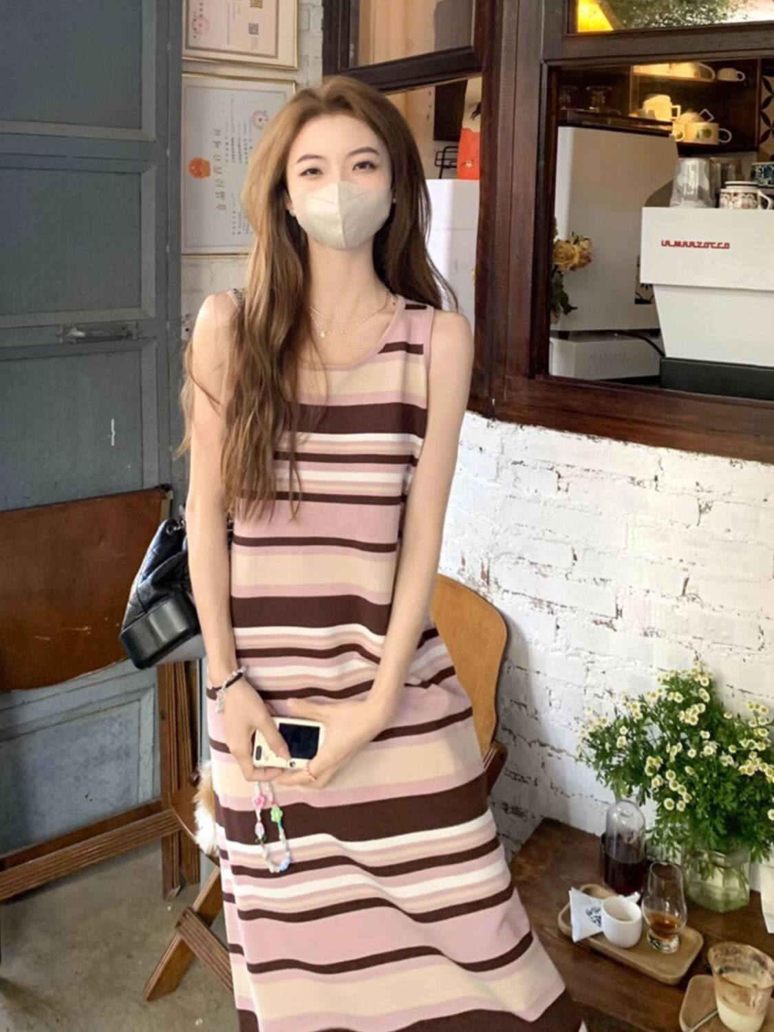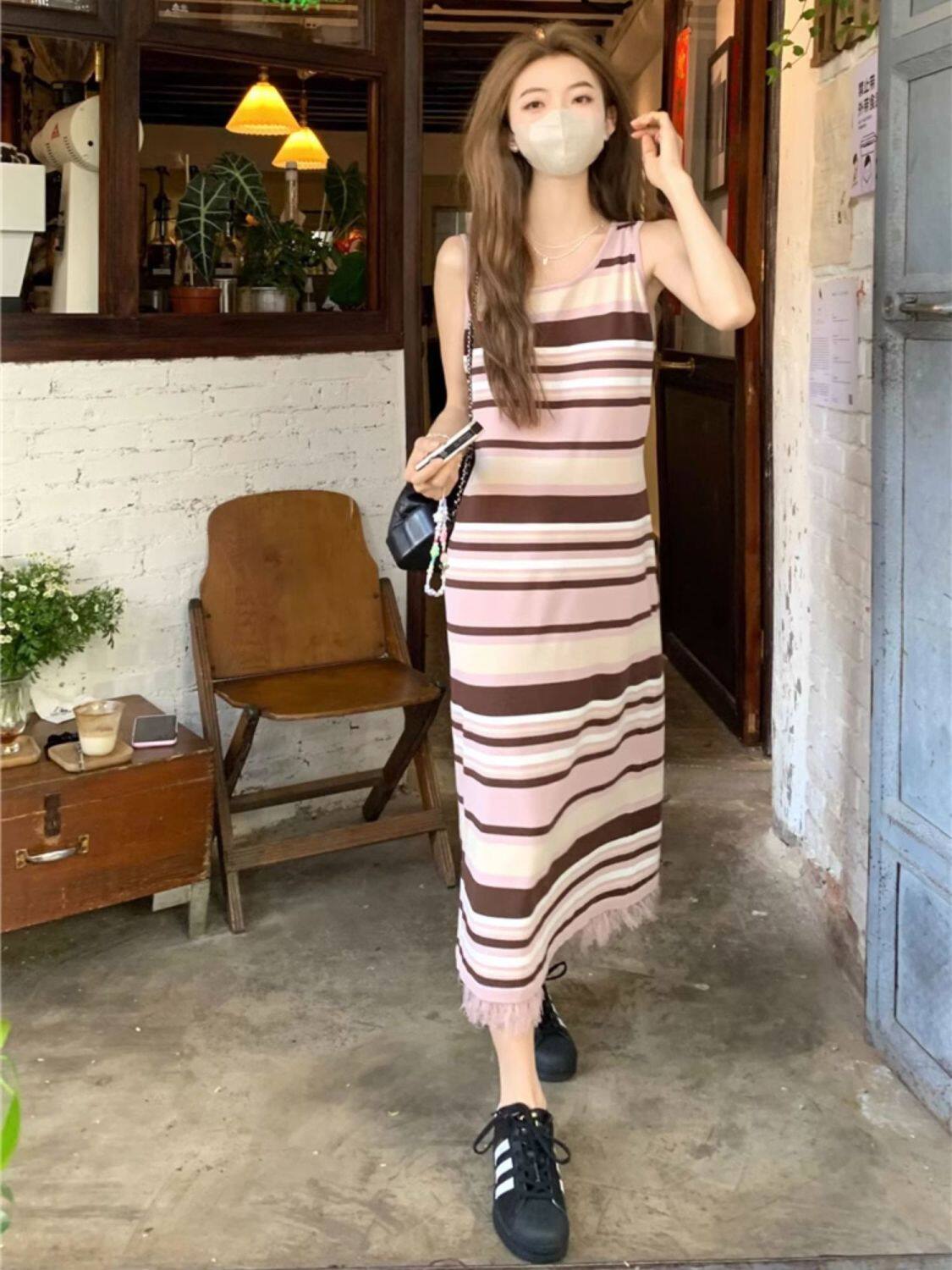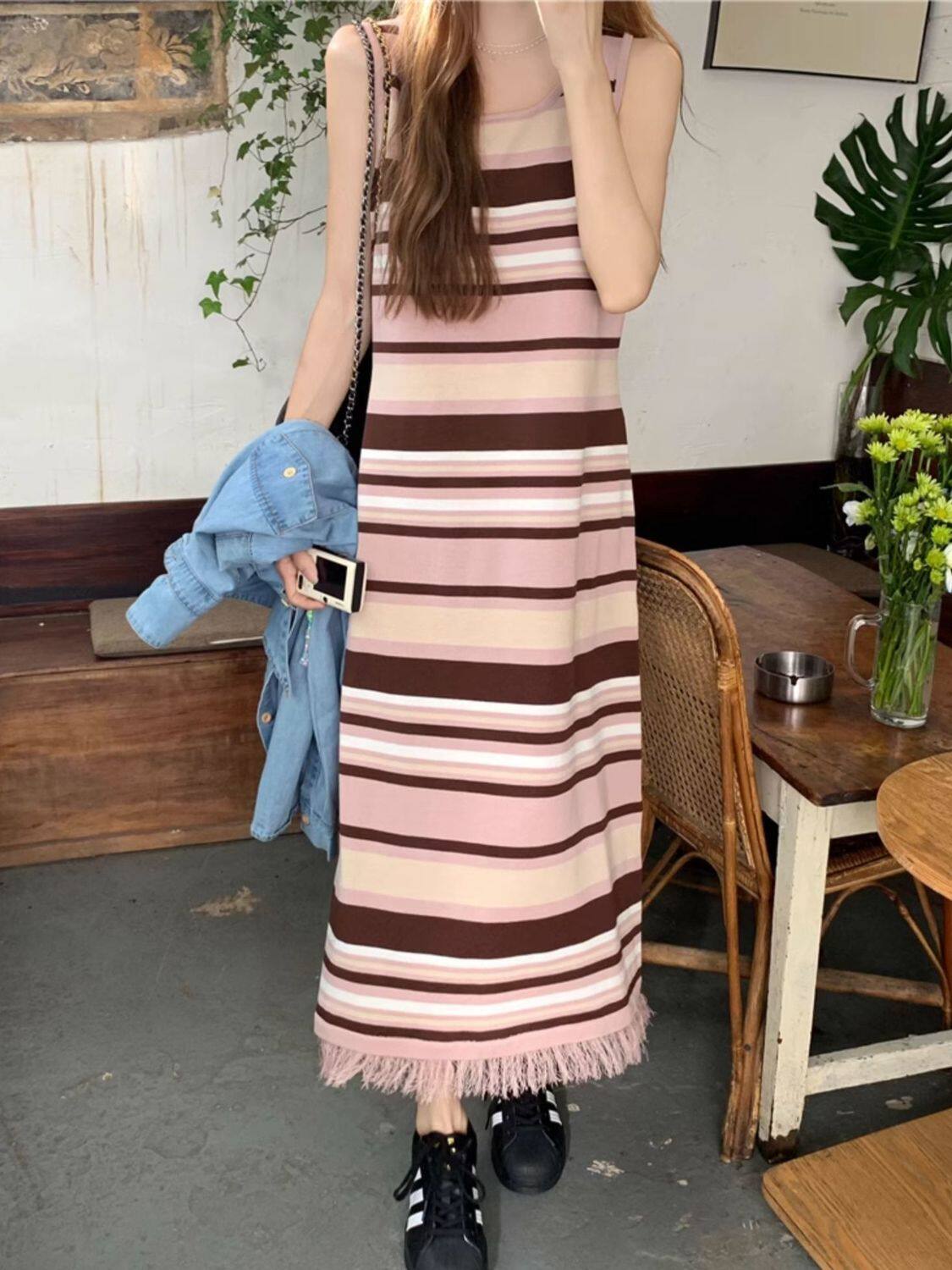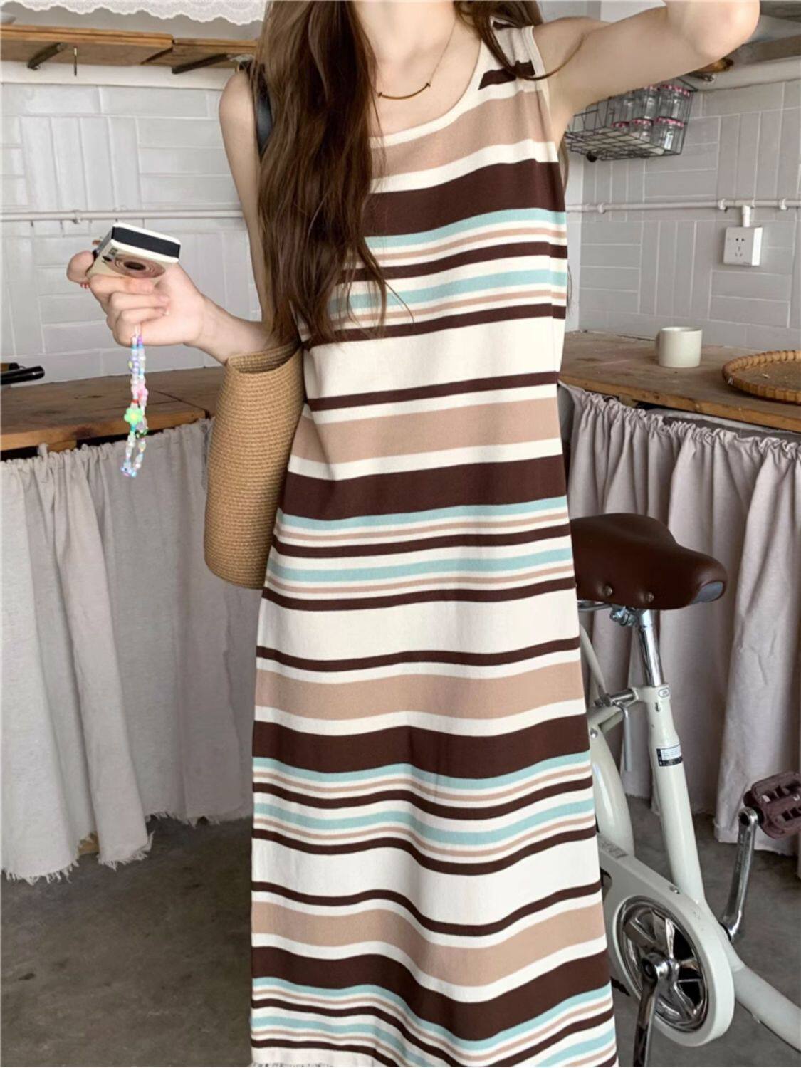 Colorful Stripesd Fat mm Sleeveless Vest Dress Women's Summer Loose Slimming Look Casual French Fringed Long Skirt