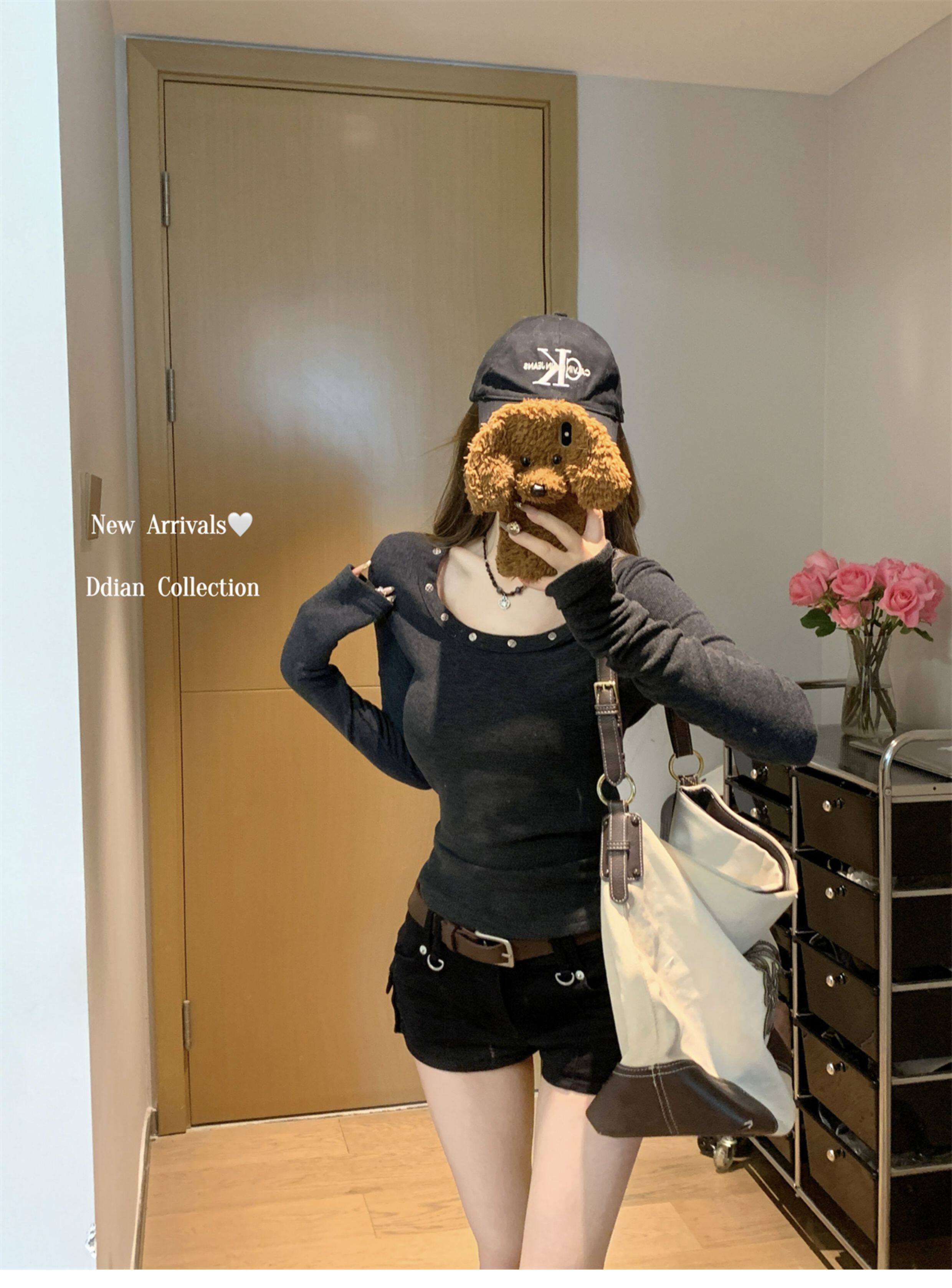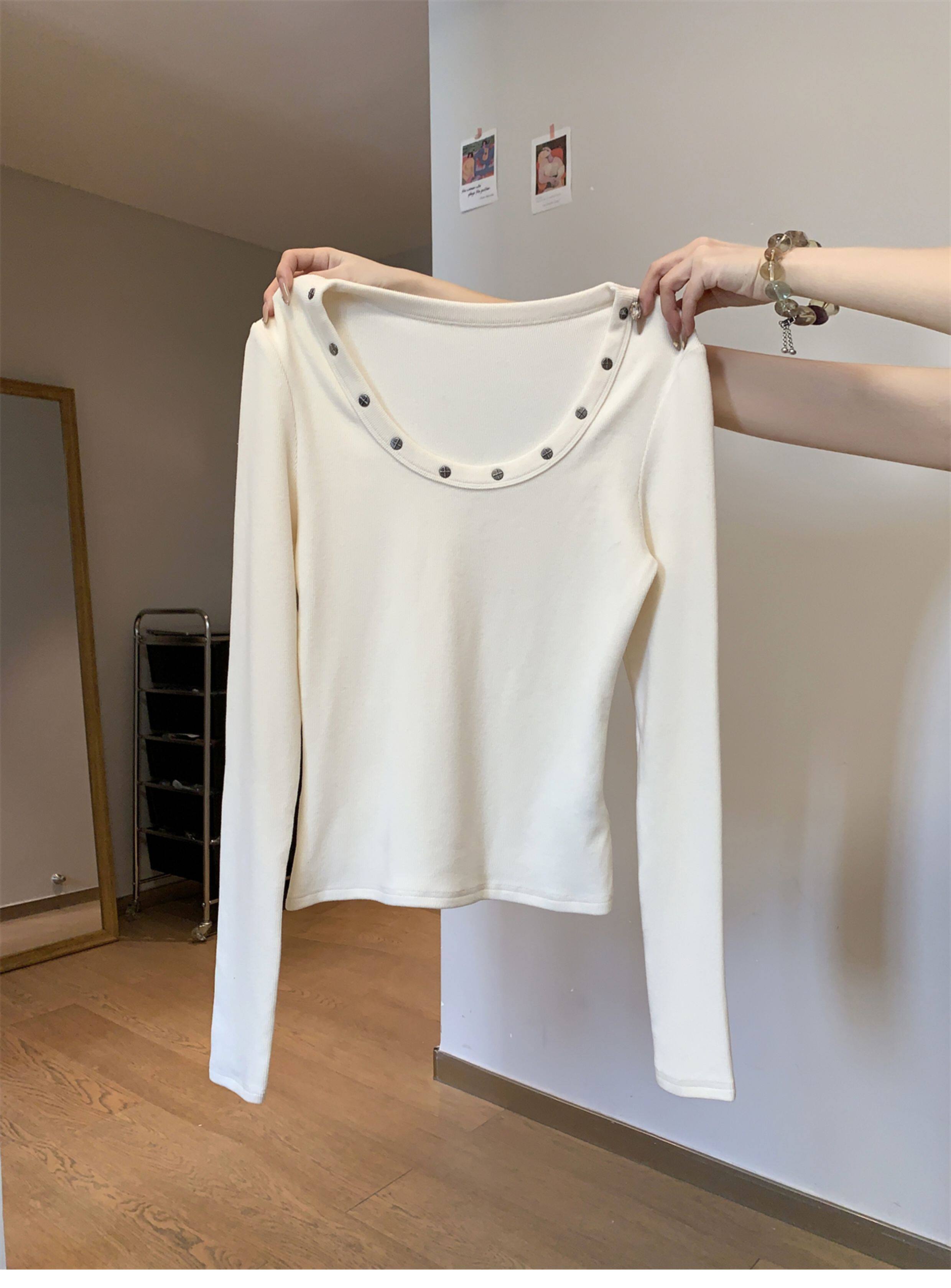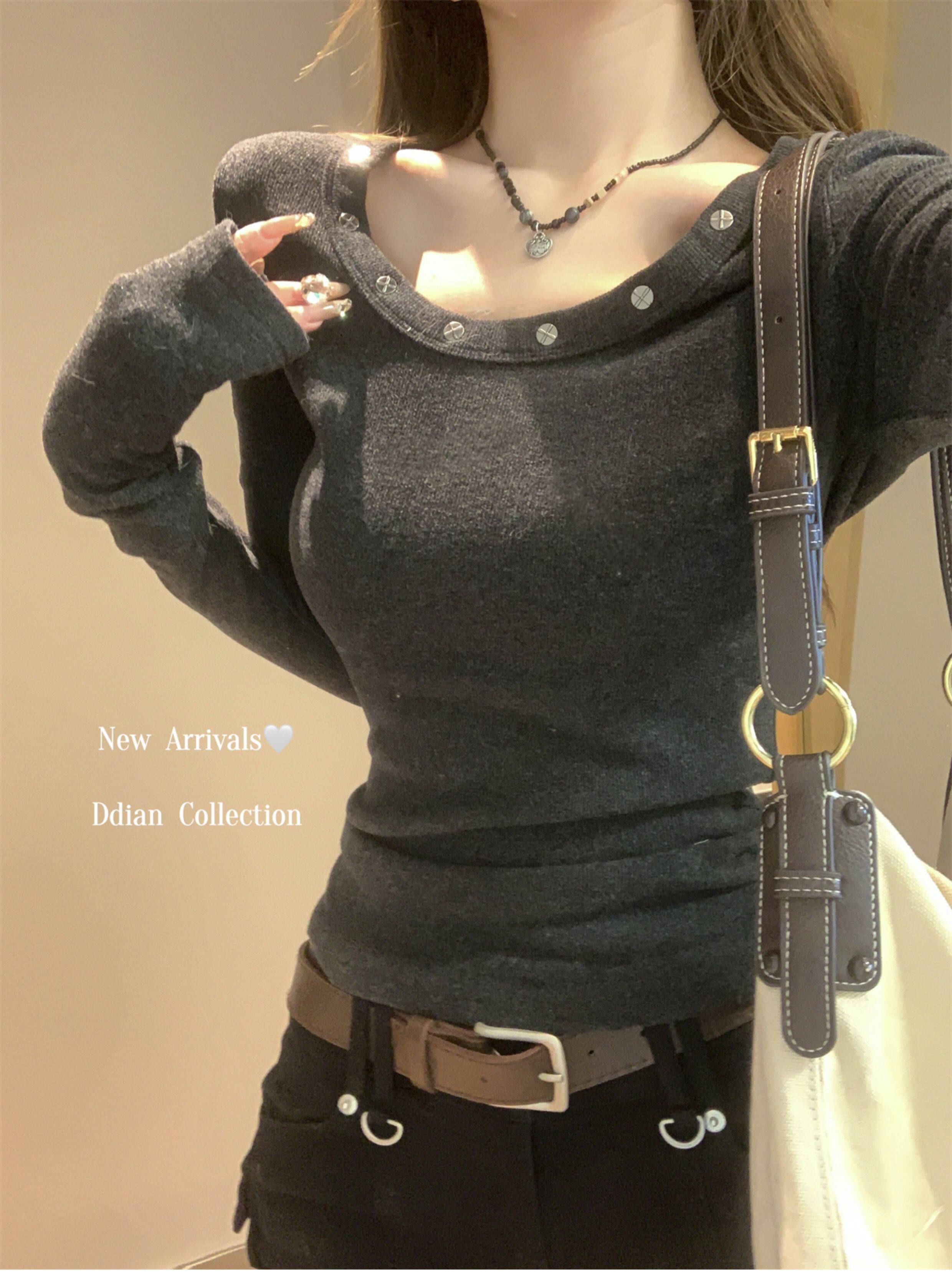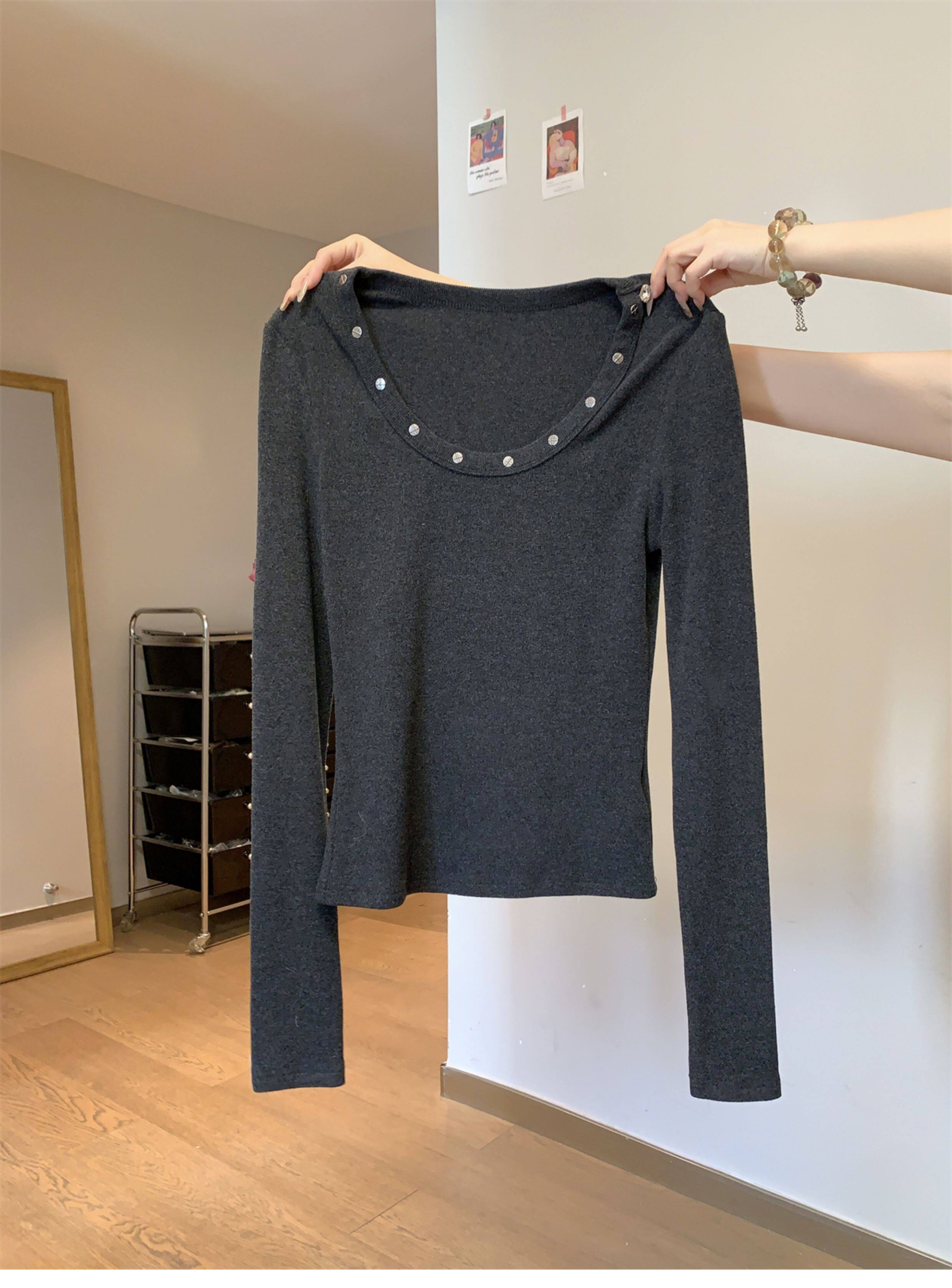 Low Round Neck Rivet Design Cashmere Base Shirt for Women, New Autumn and Winter High-End Gray Slim Fit Long-Sleeved T-Shirt Top