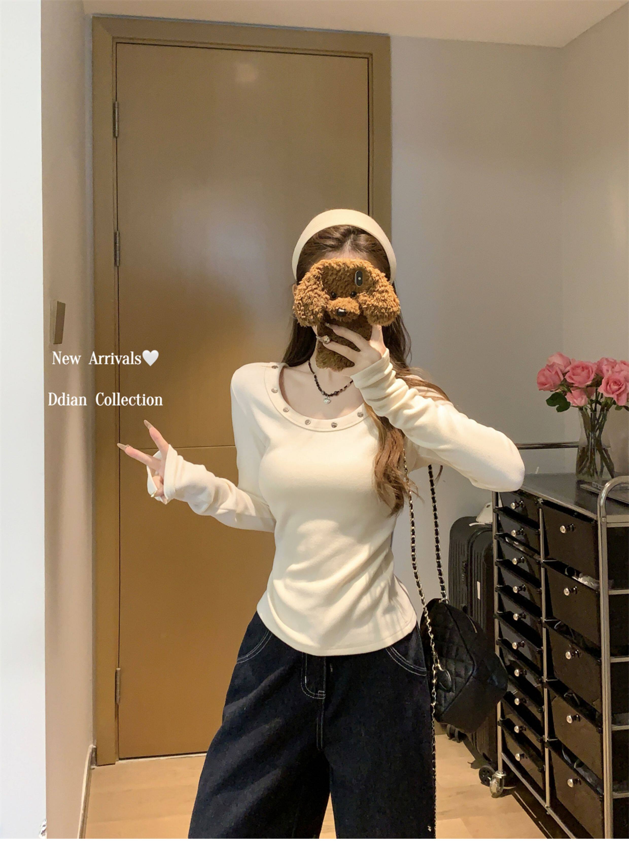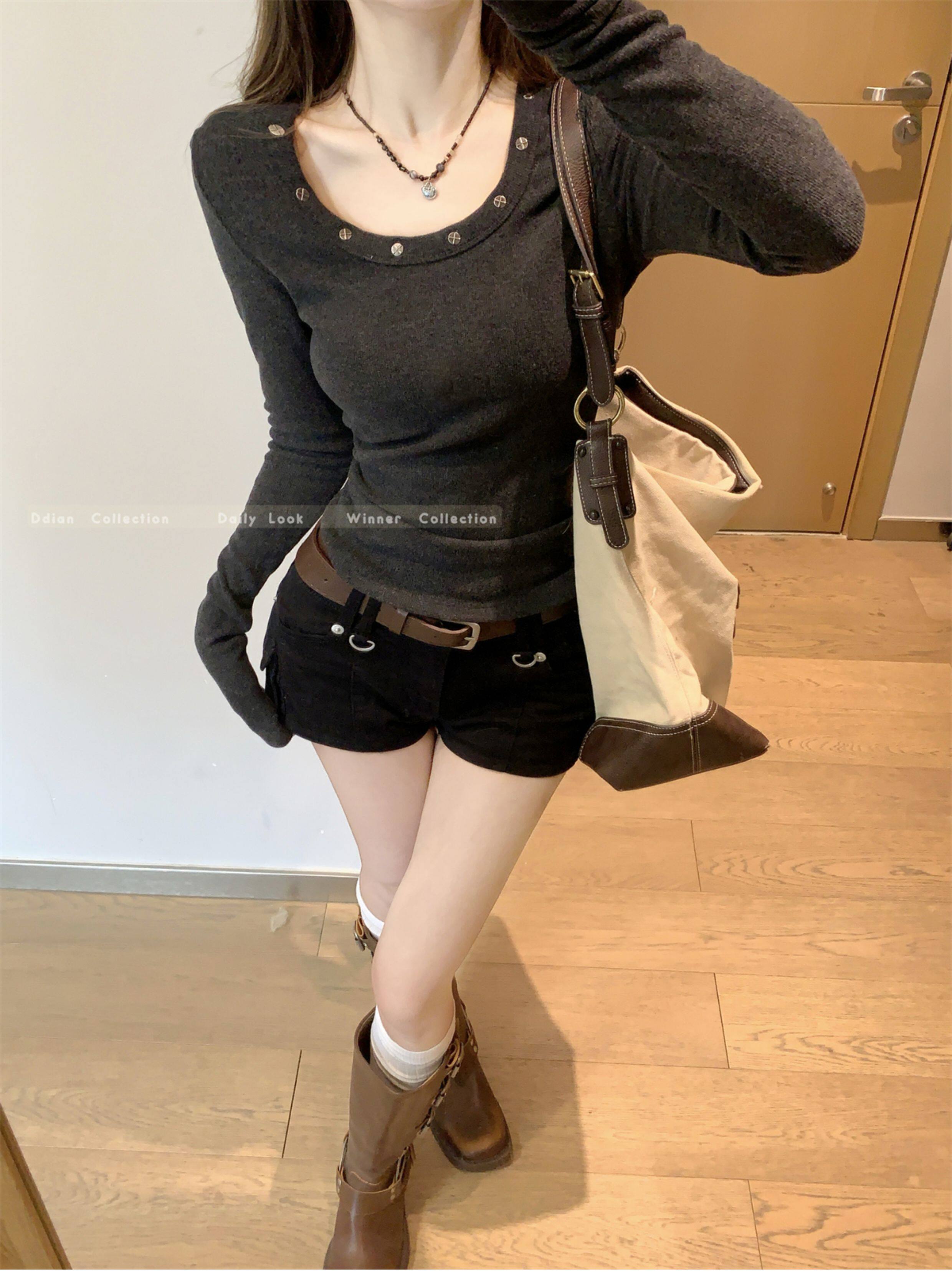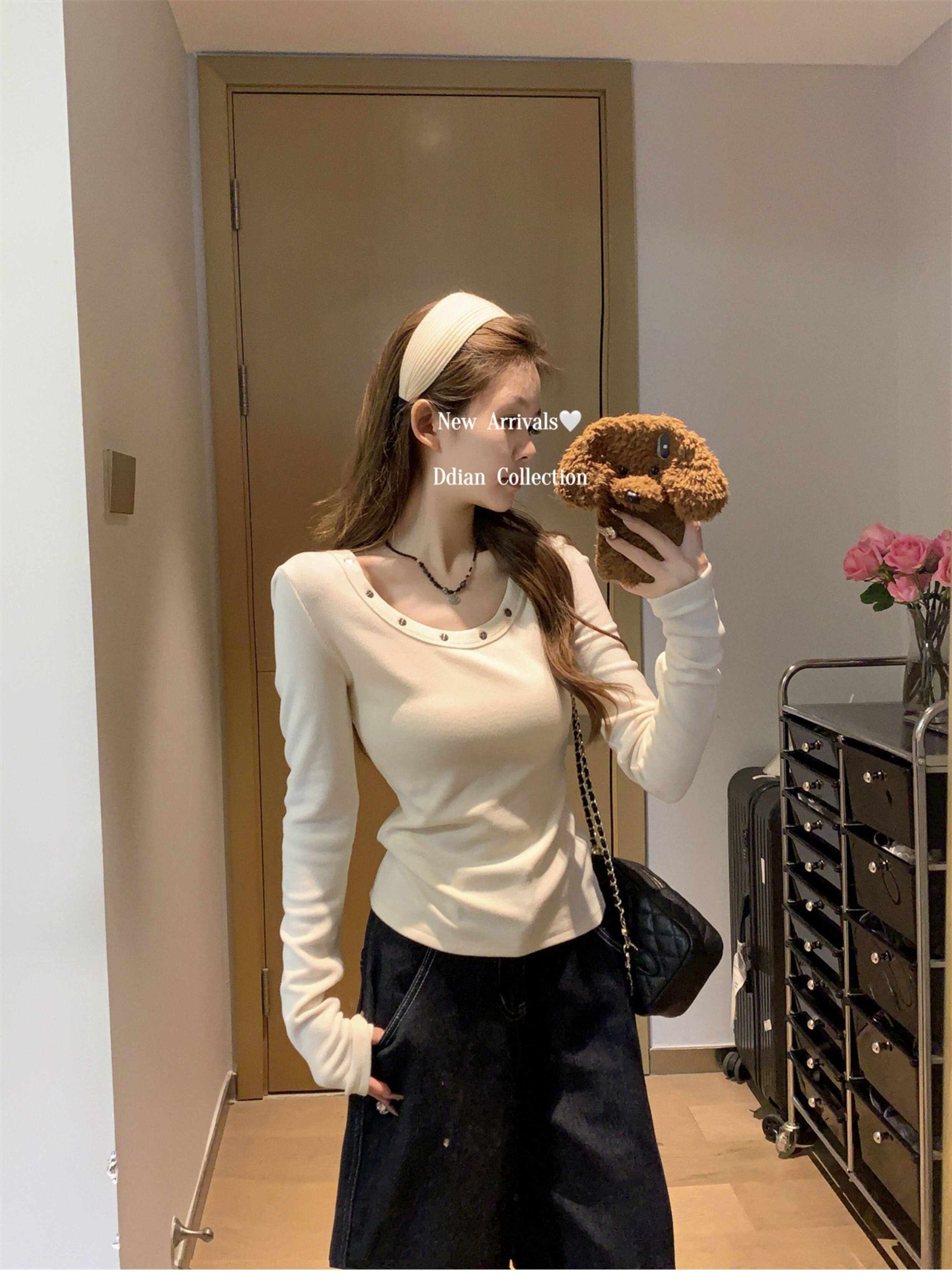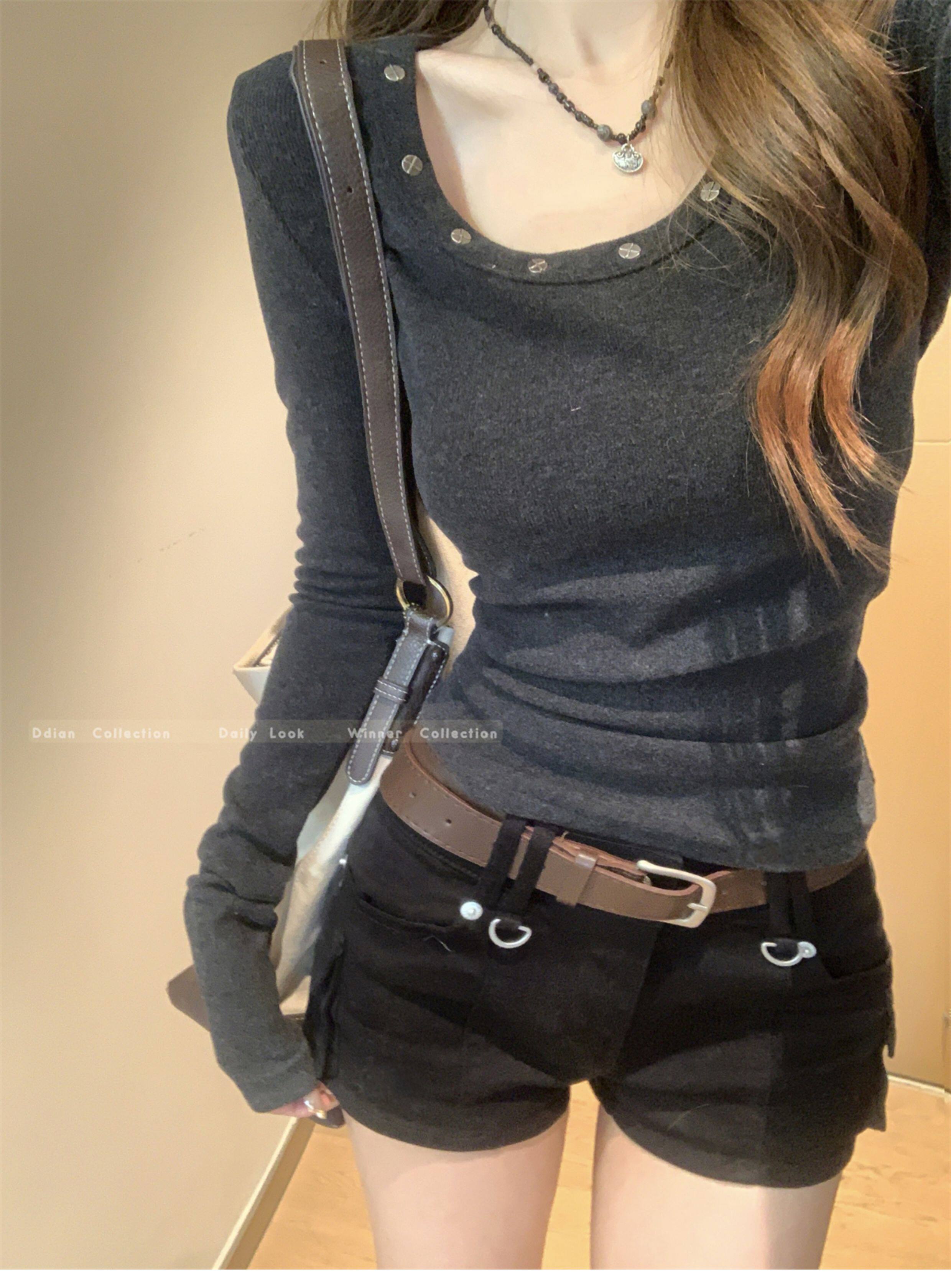 Low Round Neck Rivet Design Cashmere Base Shirt for Women, New Autumn and Winter High-End Gray Slim Fit Long-Sleeved T-Shirt Top