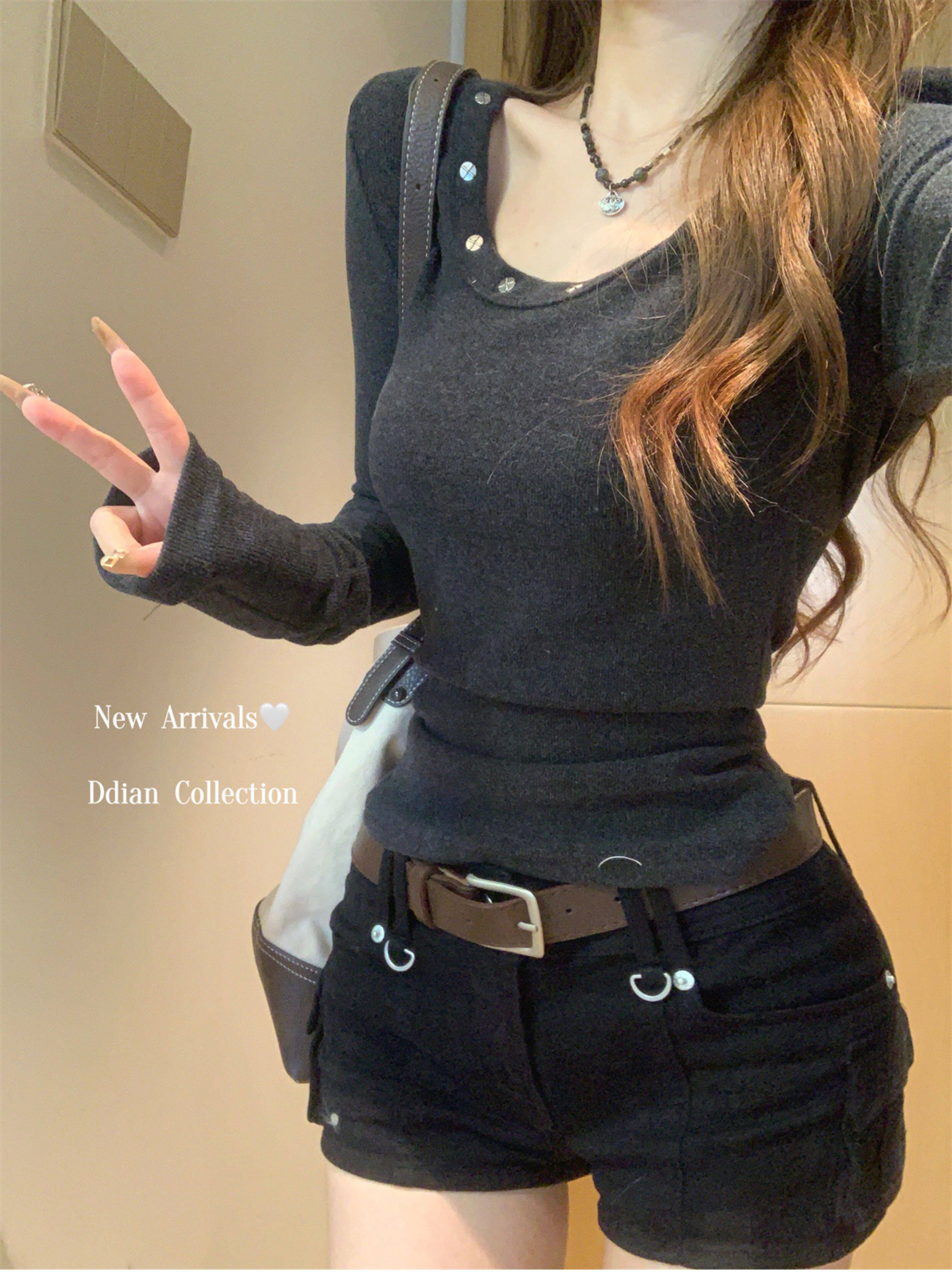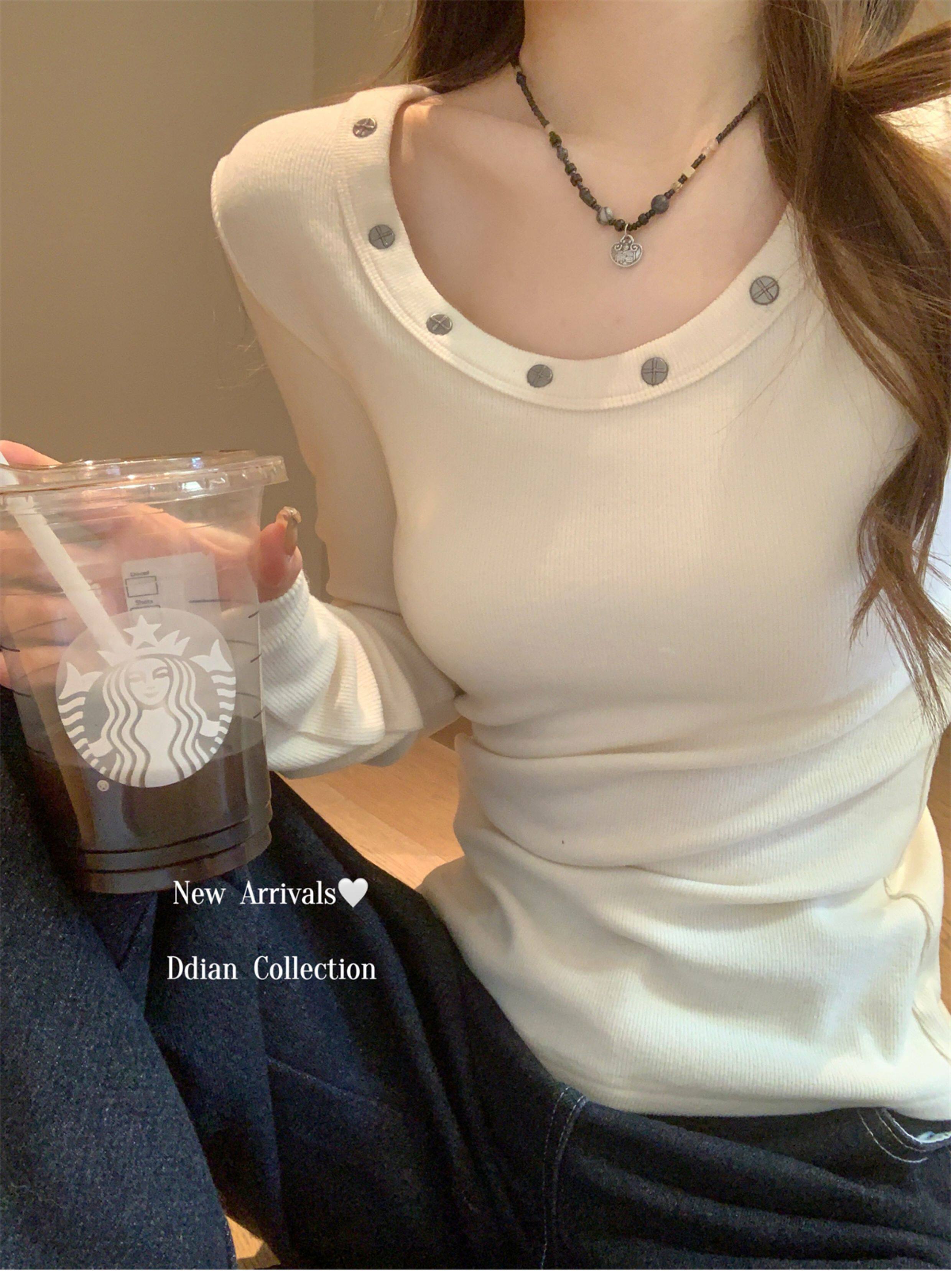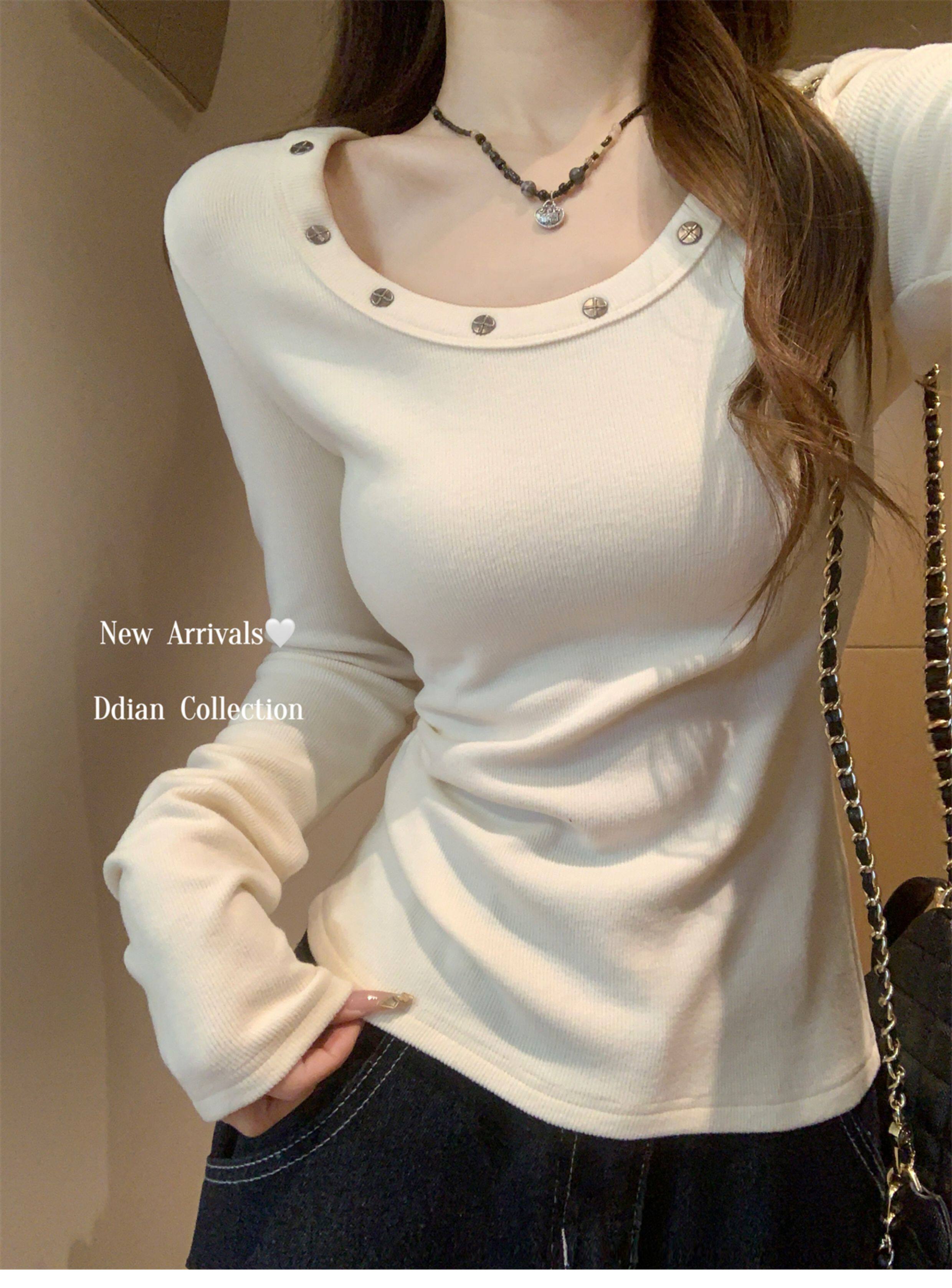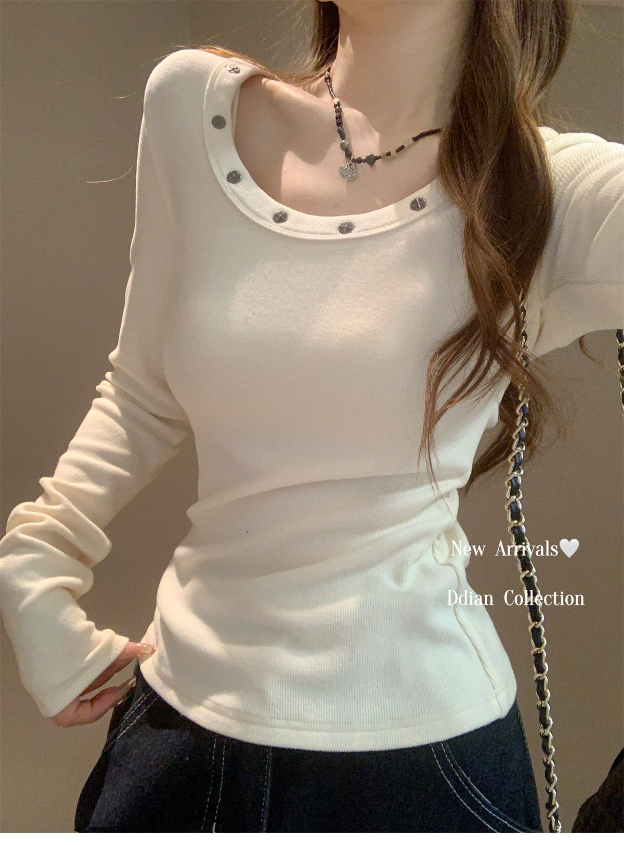 Low Round Neck Rivet Design Cashmere Base Shirt for Women, New Autumn and Winter High-End Gray Slim Fit Long-Sleeved T-Shirt Top