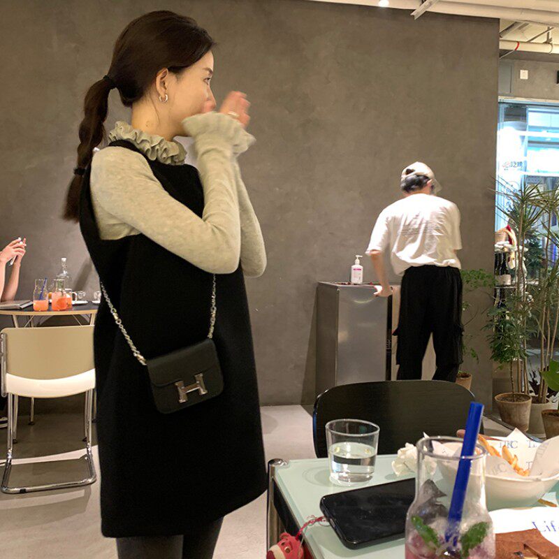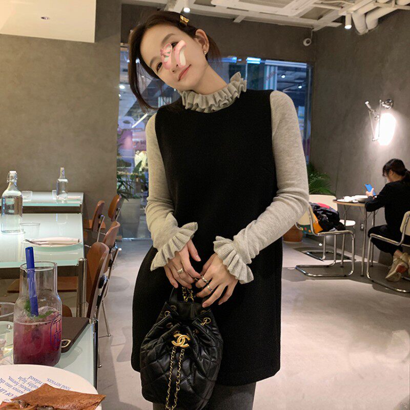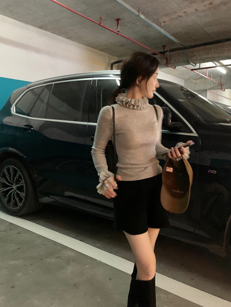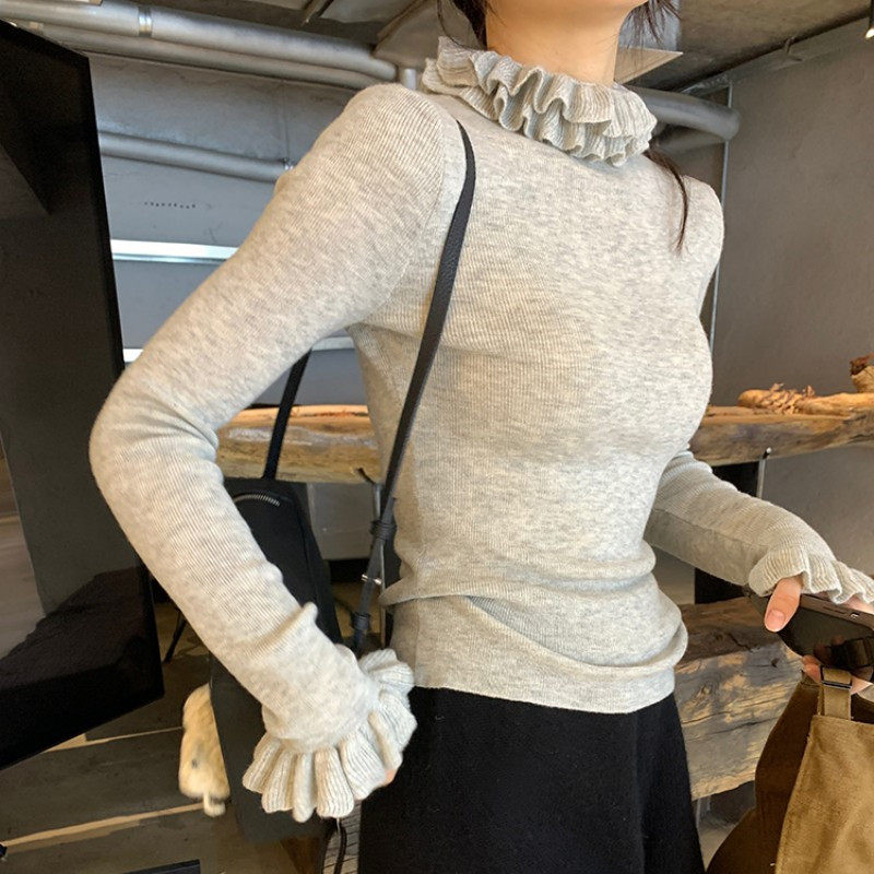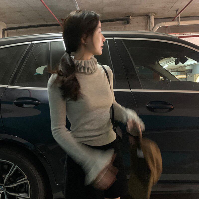 Hong Kong Style Ruffled Petal Stand-Up Collar Knit Sweater for Women, New Spring and Autumn Slim-Fit Elegant Layered Half-High Collar Sweater for Women, Trendy