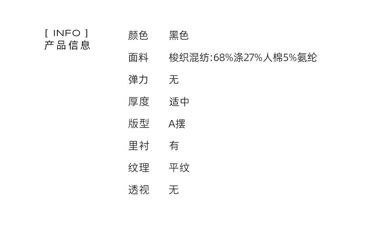 Material Composition Polyethylene Terephthalate (Polyester) 68% Viscose Fiber (Viscose Fiber) 27% Polyurethane Elastic Fiber (Spandex) 5%