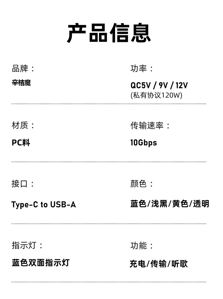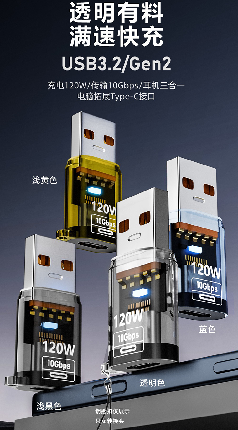 Color Classification Type-C Female to USB Male[Transparent]Adapter★120W Charging + Transmission,Type-C Female to USB Male[Transparent Black]Adapter★120W Charging + Transmission,Type-C Female to USB Male[Transparent Yellow]Adapter★120W Charging + Transmission,Type-C Female to USB Male[Transparent Blue]Adapter★120W Charging + Transmission,USB3.2 a Male to C Female Digital Display Adapter★Black 10Gbps Transmission●60W Fast Charge,USB3.2 a Male to C Female Digital Display Adapter★Light Black 10Gbps Transmission●60W Fast Charge,10A High Speed Type-C to USB[Orange]One Pack,10A High Speed Type-C to USB[Deep Black]One Pack,10A High Speed Type-C to USB[Yashi Silver]One Pack,6A High-Speed Type-C to USB[Orange]One Pack,6A High-Speed Type-C to USB[Deep Black]One Pack,6A High-Speed Type-C to USB[Yashi Silver]One Pack,Short/Typec to USB[Aurora Silver]One Pack,Short/Typec to USB[Magic Black]One Pack