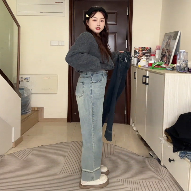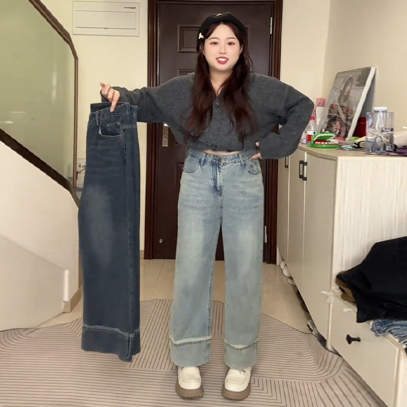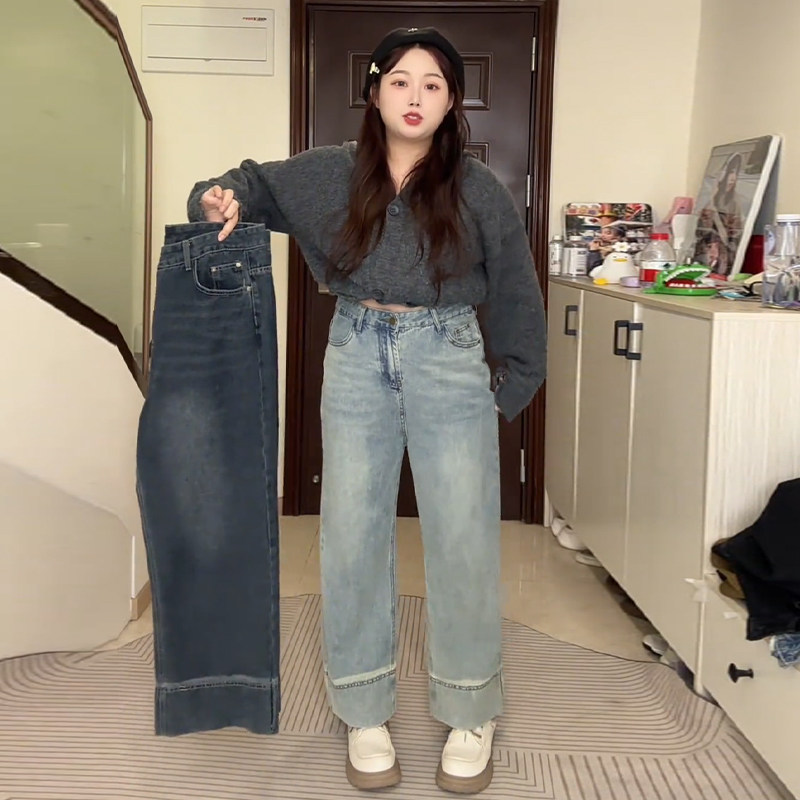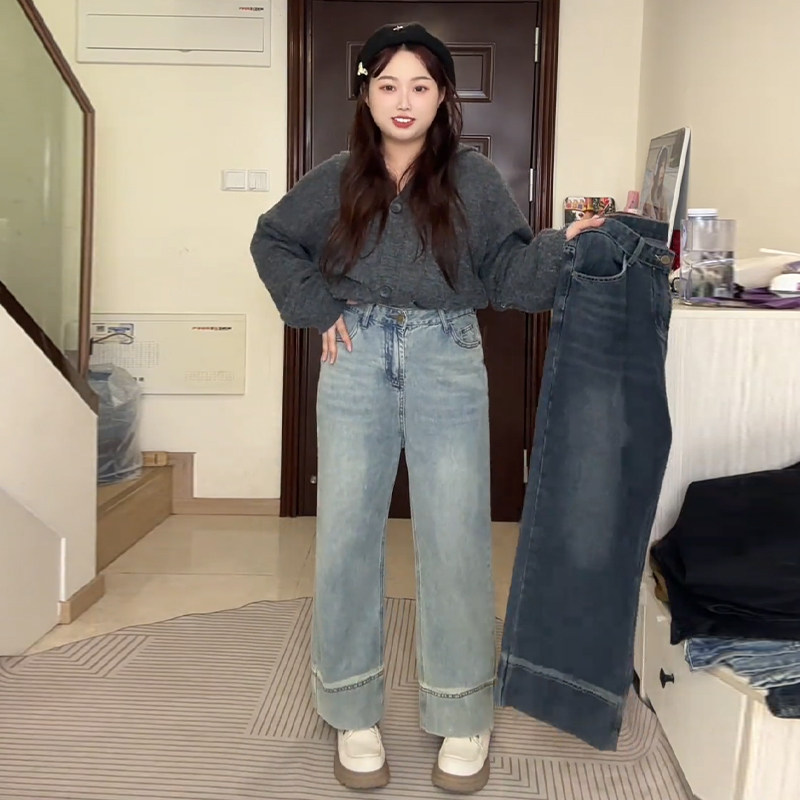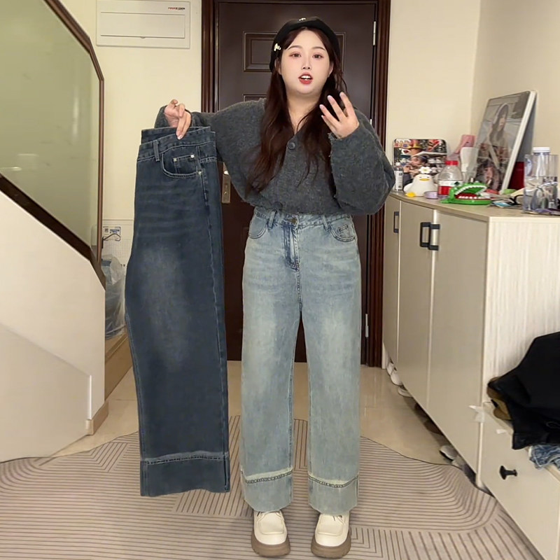 Large size American retro jeans for women in spring, fat mm, slim, loose straight nine-point pants, wide-leg pants, high-waisted pants