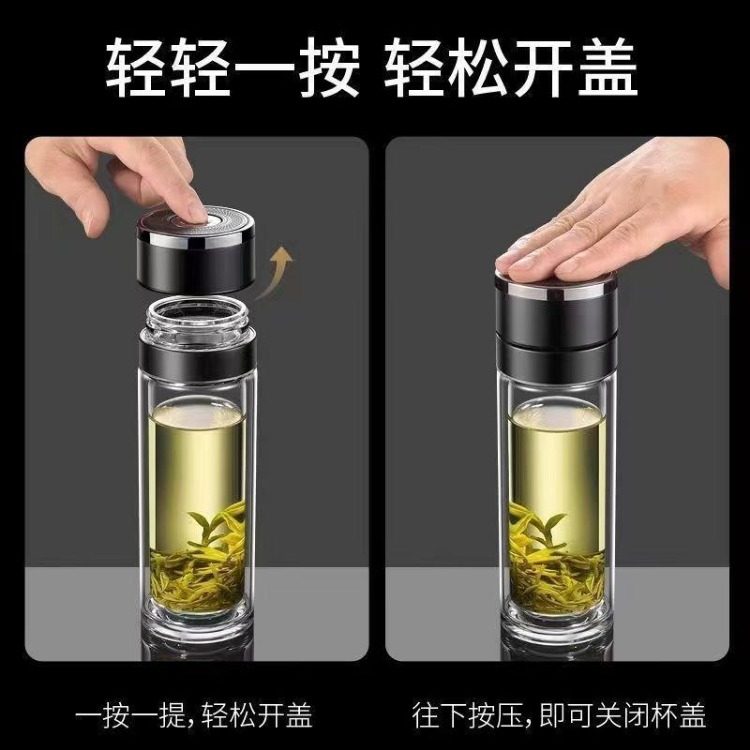 One-Touch Open Lid Tea Cup, Car-Mounted Quick-Open Cup, Tea-Water Separation Cup, New High-End Double-Layer High-Temperature Resistant Glass Cup for Men