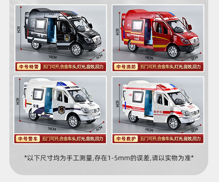 Color Classification China-Police Car 132,Dubai-Police Car 132,Urban Management-Pickup 132,Public Security-Pickup 132,Suv Police Car-White 132,Suv Police Car-Black 132,Sedan-Swat 132,Pickup - Swat 132,Pickup Truck - Engineering 132,Explosion-Proof-Swat 132,132 Public Security-110,132 Ambulance-120,132 Fire-119,Sports Car Orange Double Door Silent Light,Pickup Truck Yellow Double Door Silent Light,Pickup White Double Door Silent Light,Large Black Swat-4 Doors,Large Fire-4 Doors,Large Police Car-4 Doors,Medium-Sized Police Car - 5 Doors,Medium-Sized Ambulance - 5 Doors,Medium Black Swat-5 Door Opener,Medium Fire-5 Door,Audi Police Car,Auditec