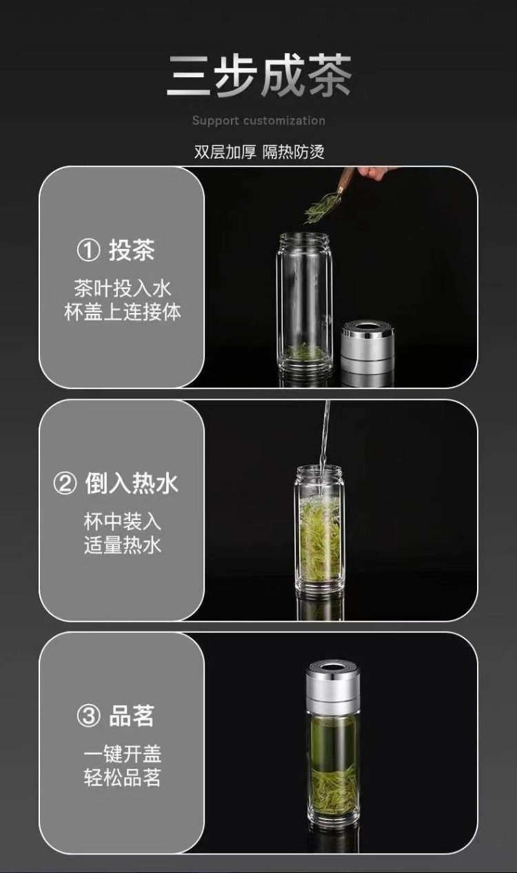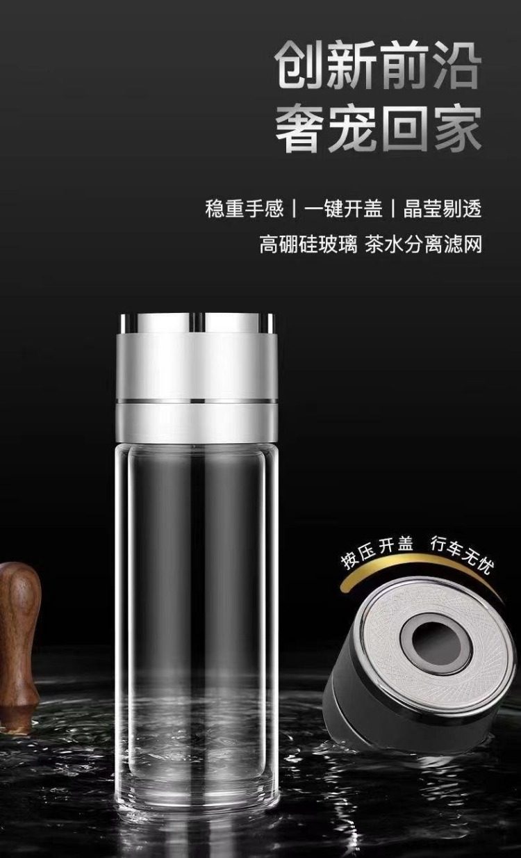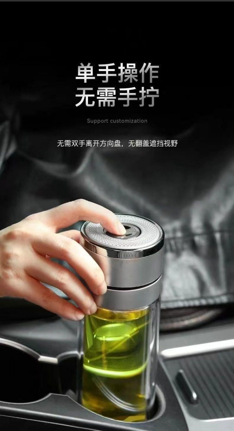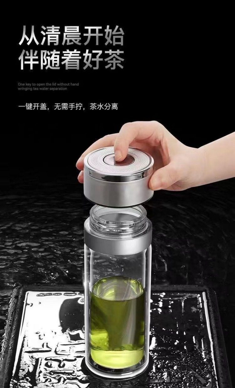 Extra-Large Glass Cup with One-Touch Lid Opening, Car-Mounted Quick-Opening Cup, Tea-Water Separation, High-End Double-Layer Glass Cup