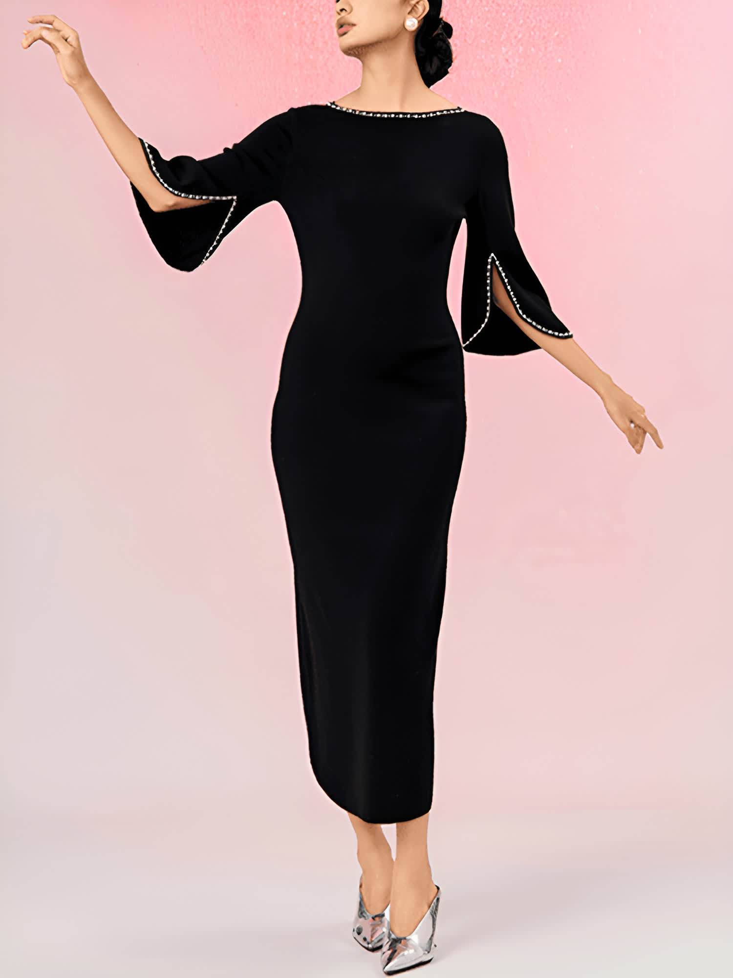 Mijie French-Style Black V-Neck Dress, Elegant and Graceful, with Shawl, Mid-Sleeve Little Black Dress, Slim-Fit Formal Long Dress, Two-Way Wear