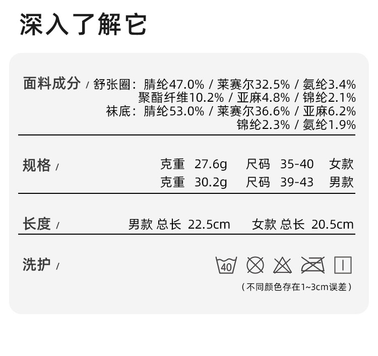 Fabric Material Composition Polyacrylonitrile Fiber (Acrylic Fiber) 53% Lyocell Fiber (Lyocell) 36.6% Linen 6.2% Polyamide Fiber (Nylon)2.3% Polyurethane Elastic Fiber (Spandex) 1.9%
