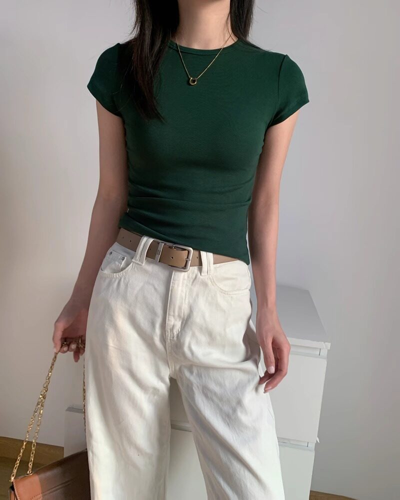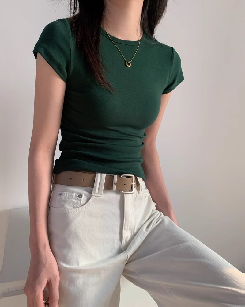 Green Short-Sleeved T-Shirt for Women, 2025 Summer New Style, Tight-Fitting, Figure-Flattering, Slimming, Pure Cotton, Round Neck Top