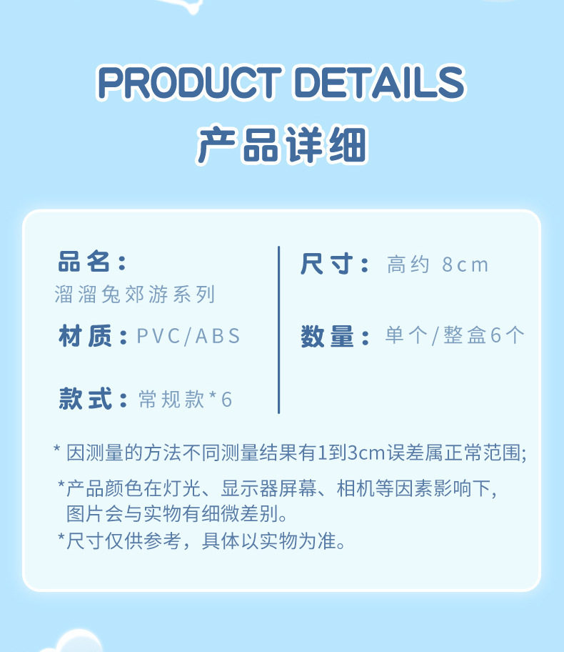 Style Description Liu Liu Rabbit Outing Blind Box - One Random Figure,Liu Liu Rabbit Outing Blind Box - Random Set of 2,Liu Liu Rabbit Outing Blind Box - Random 5-Pack (Buy Four Get One Free),A Set of Luffy Rabbit Blind Boxes (6 Pieces, No Duplicates),Pull Out the Radish--Confirm the Payment,Flower Picking--Confirmation,Let's Go! -- Payment Confirmed,Skateboarding - Payment Confirmed,Record the Good Times - Confirm Payment,Travel and Leisure - Confirmed Payment,Butterfly Catch - Hidden Edition,Liu Liu Rabbit Daily Series - Random Selection,Liu Liu Rabbit Daily Series - Random Set of 2,Liu Liu Rabbit Daily Series Set (6 Unique Pieces)