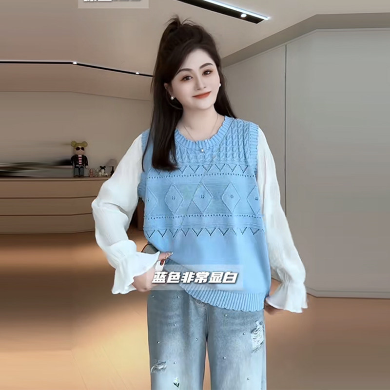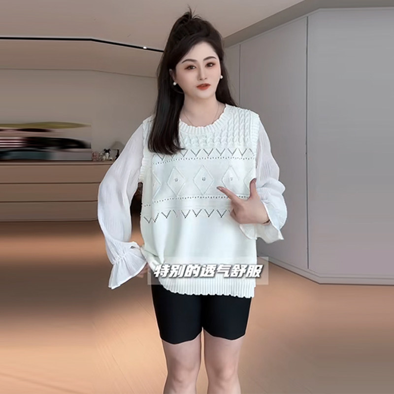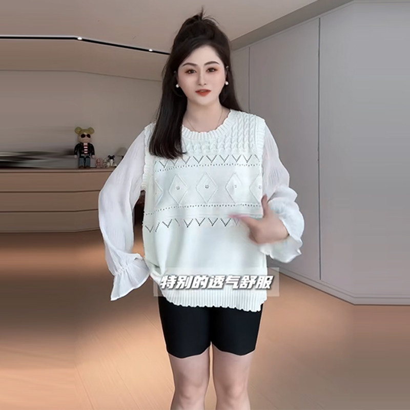Plus-Size Patchwork Chiffon Knit Shirt for Women, Spring Season, Slimming for Chubby Girls, Unique and Chic, Loose-Fitting Top