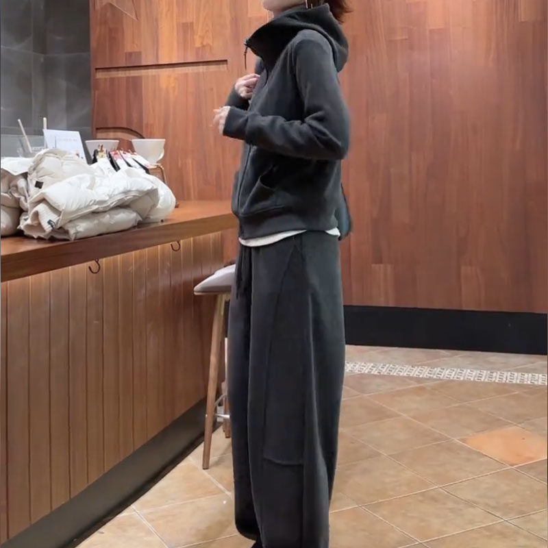 Plus size fat MM fashion warm zipper gray casual suit 2026 new winter loose sweatshirt wide leg pants XL