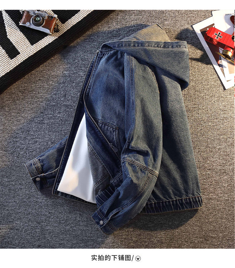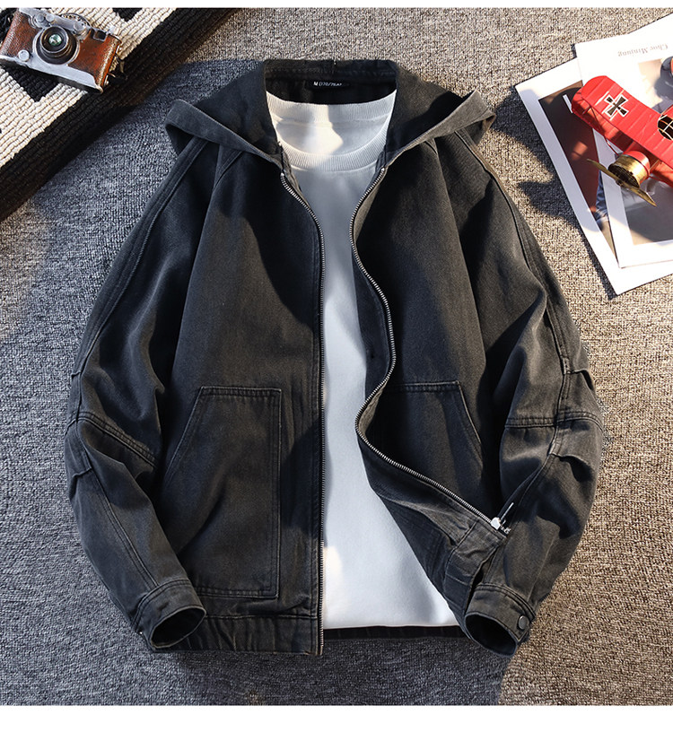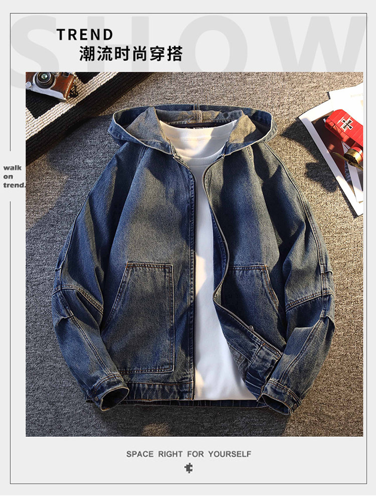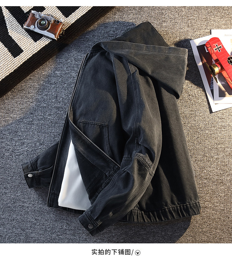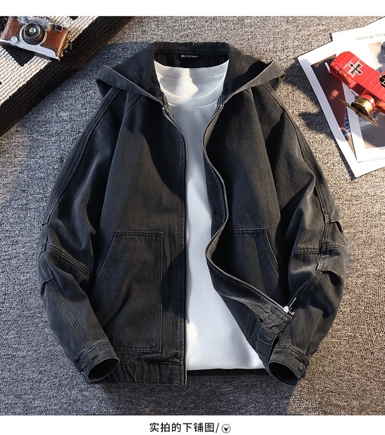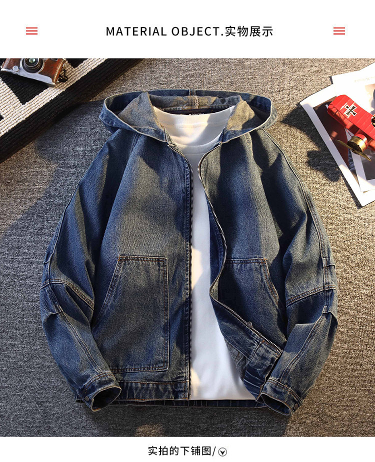 Spring and Autumn Fashion Hooded Retro Zipper Denim Jacket for Men, Teenagers and Students, Loose, Handsome and Casual Jacket
