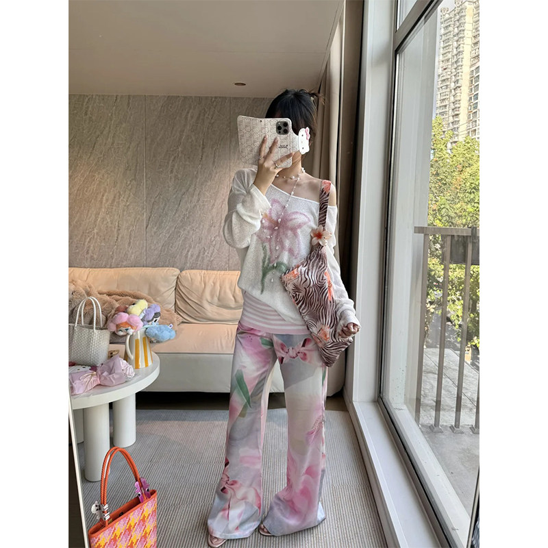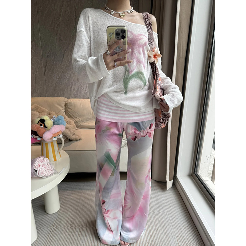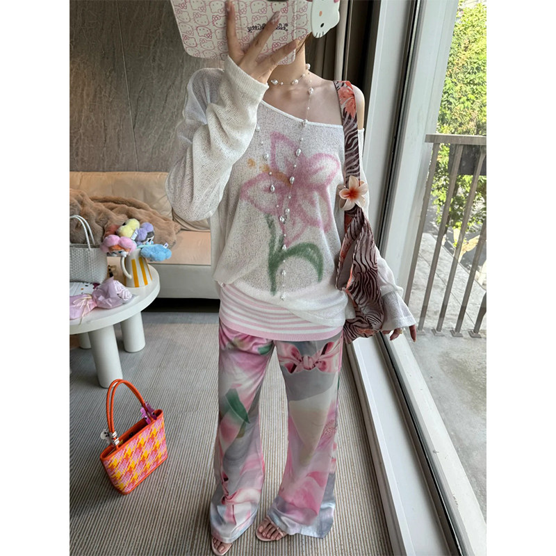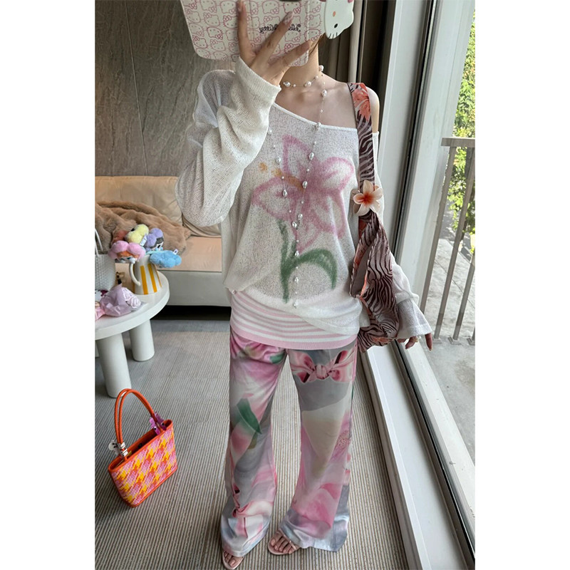 Y2k American hot girl loose and lazy flower pattern design sheer knitted long-sleeved versatile round neck bottoming top