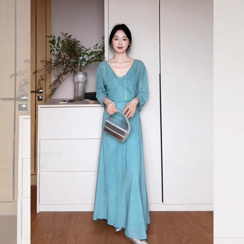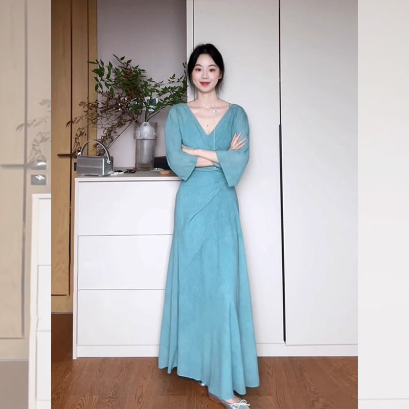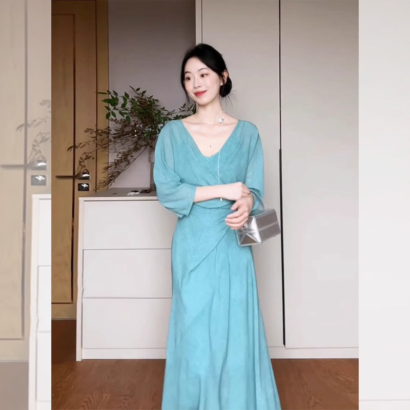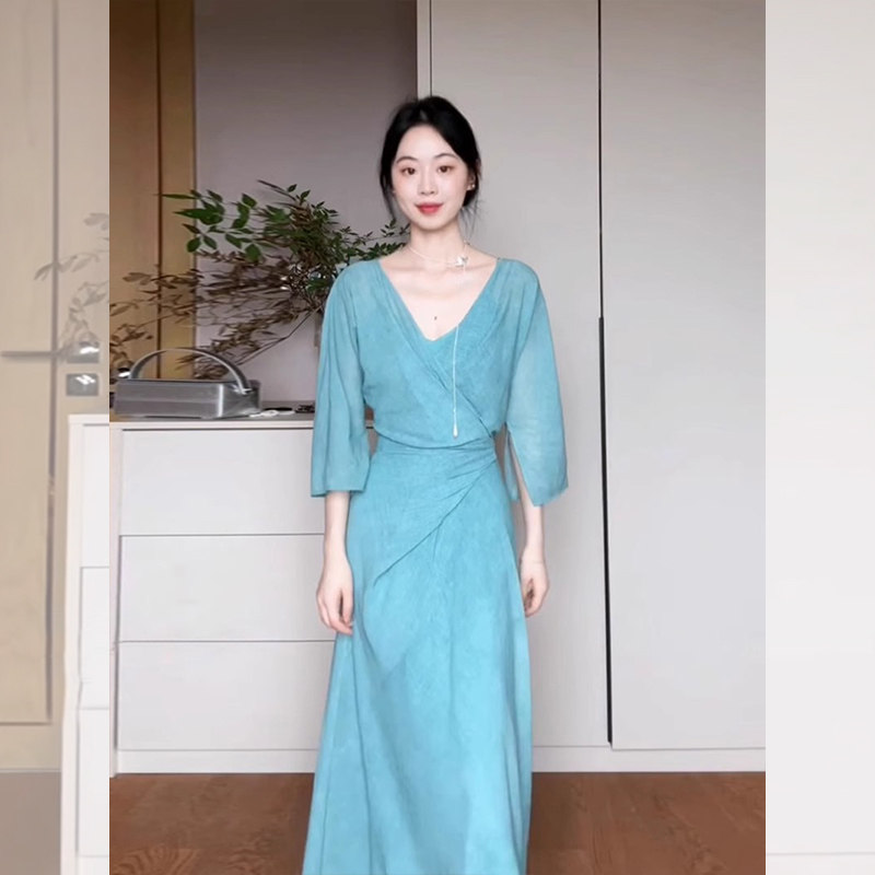 French Blue Pleated Waist-Cinching V-Neck Dress for Women, Summer Relaxed Style, Elegant and Slimming Long Dress, Seaside Vacation Beach Dress