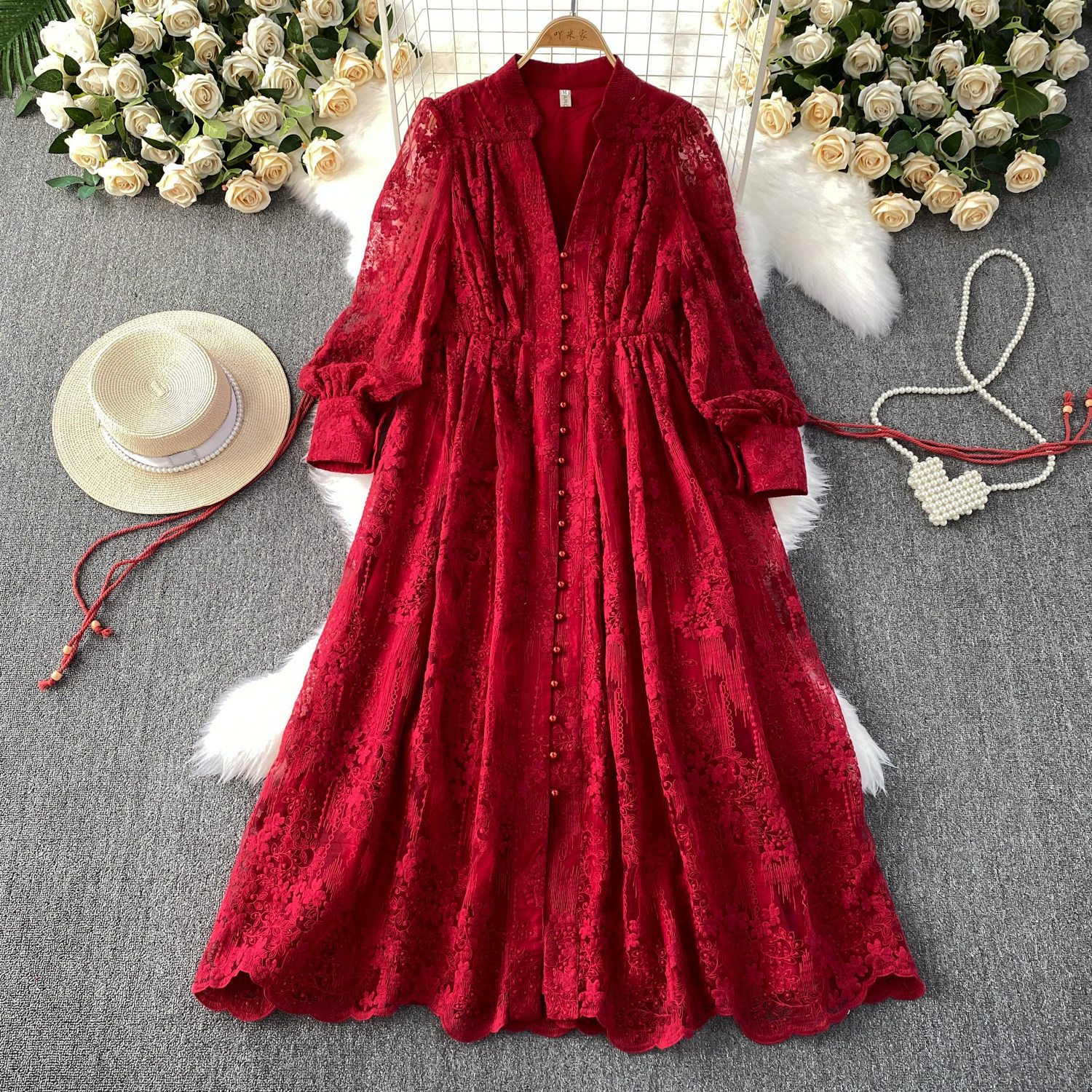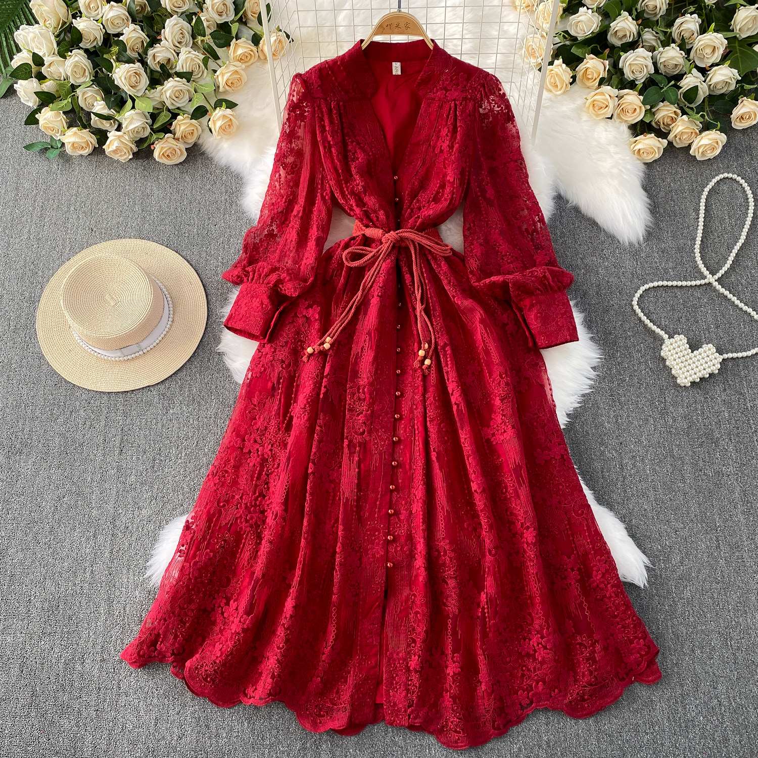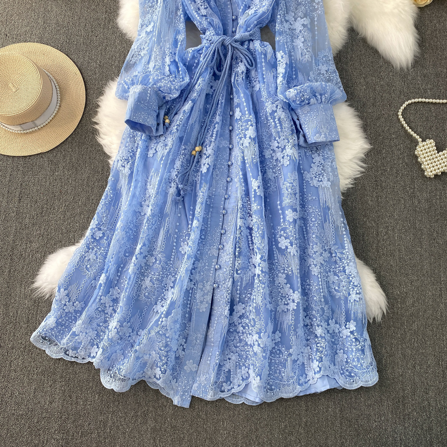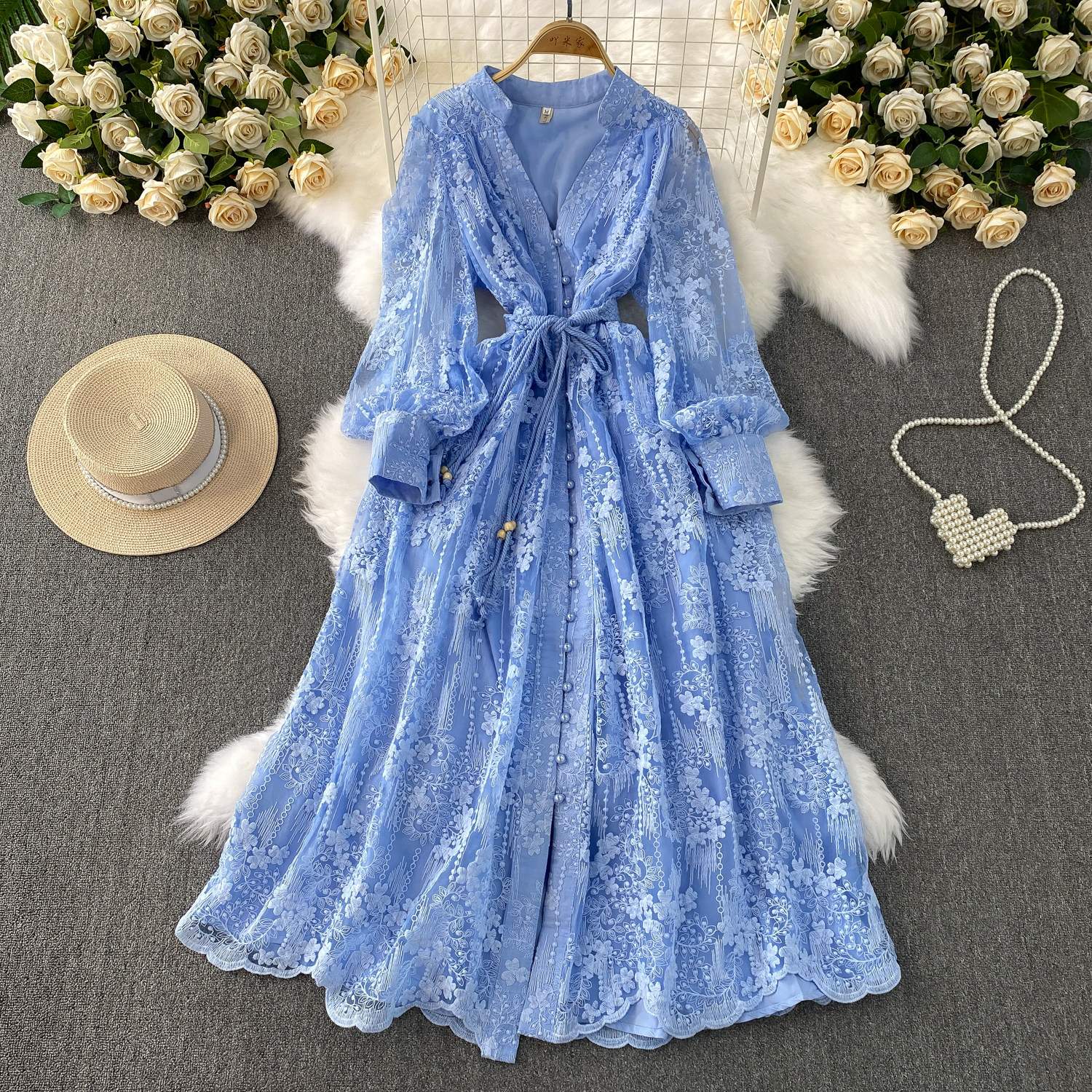 High-end authentic French high-end women's dress 2025 summer waist heavy embroidery V-neck lantern sleeve long dress