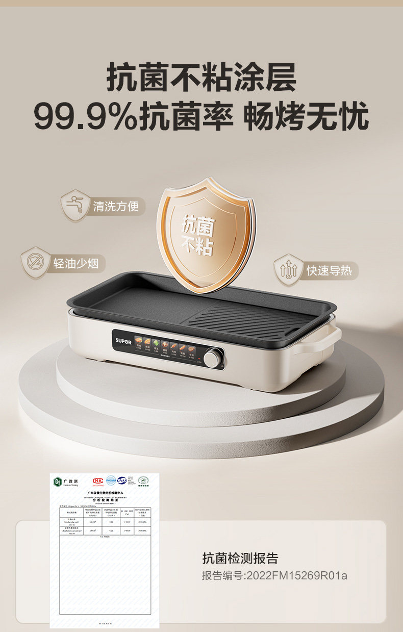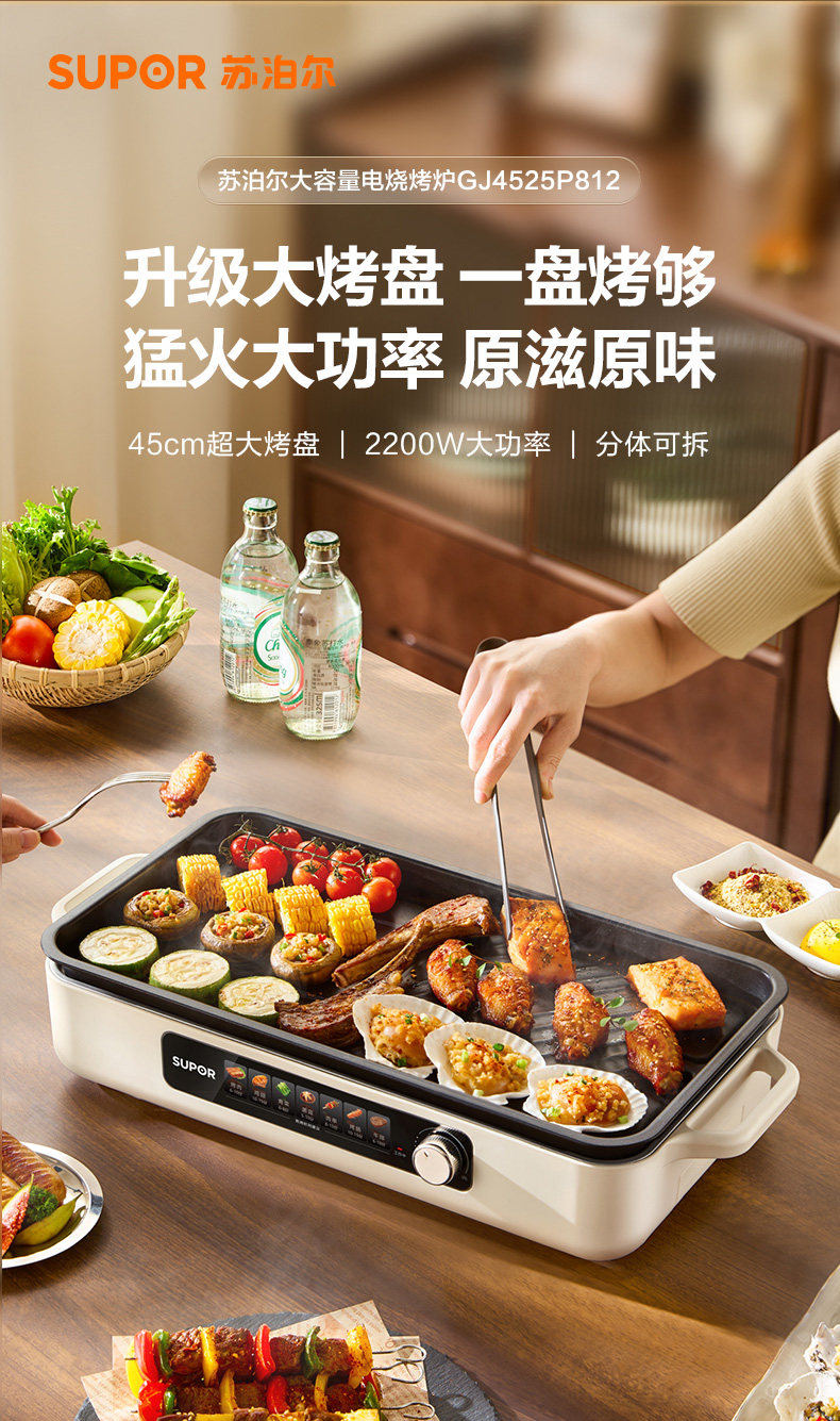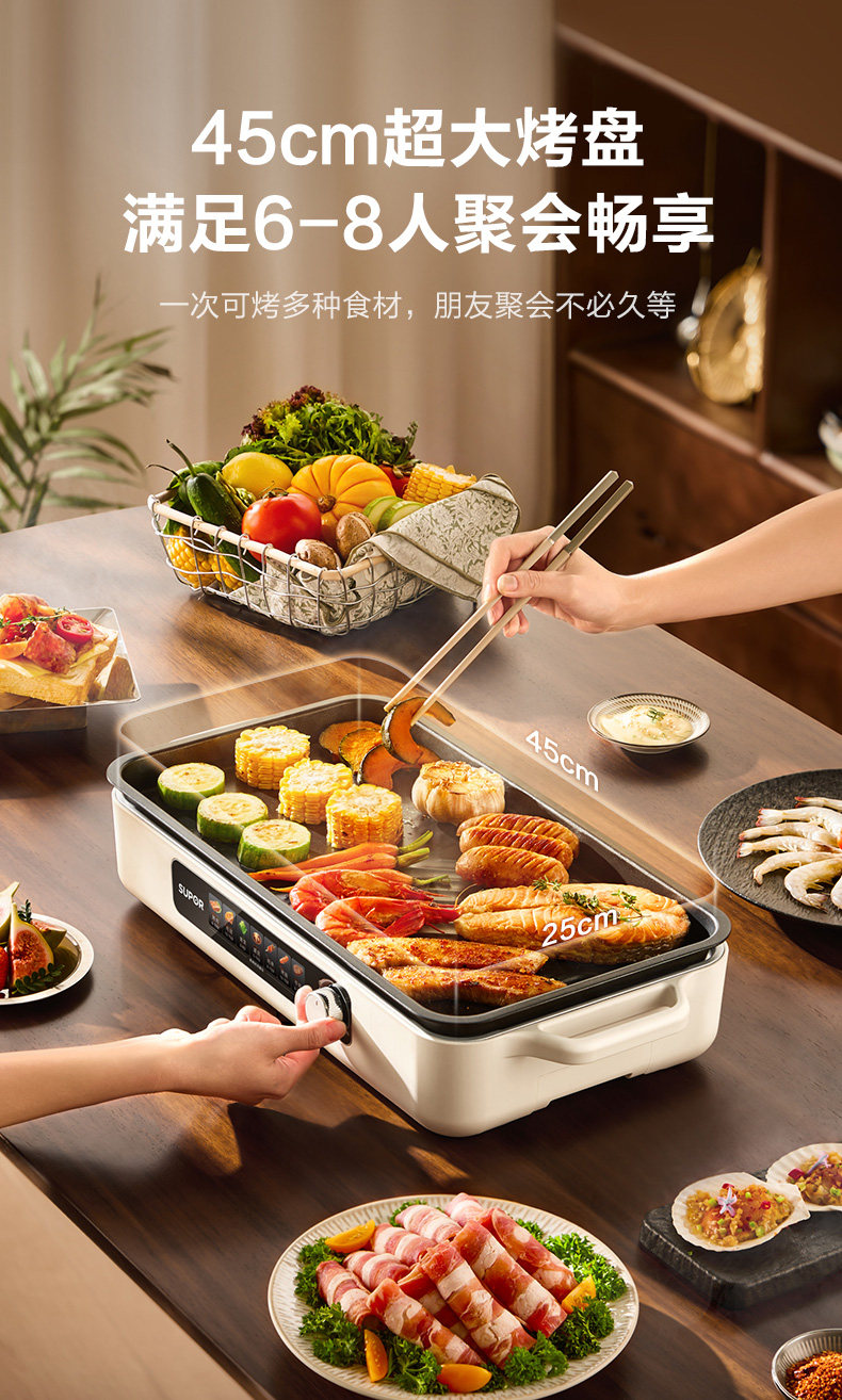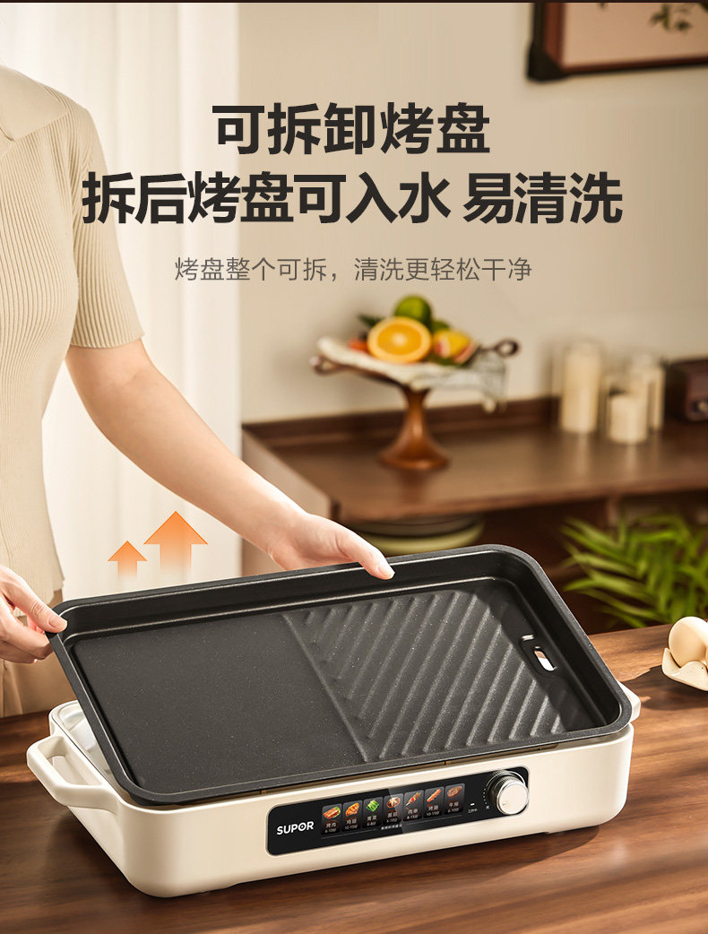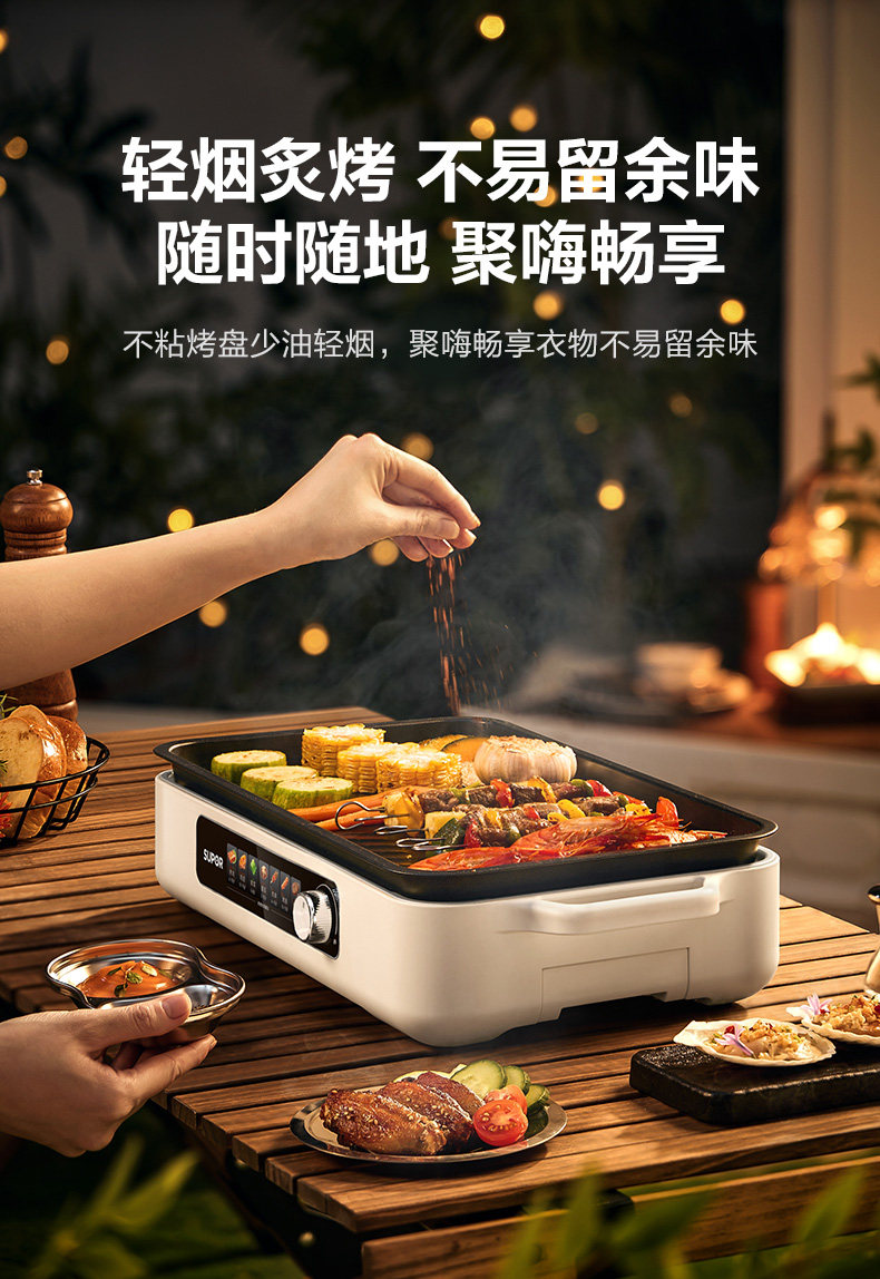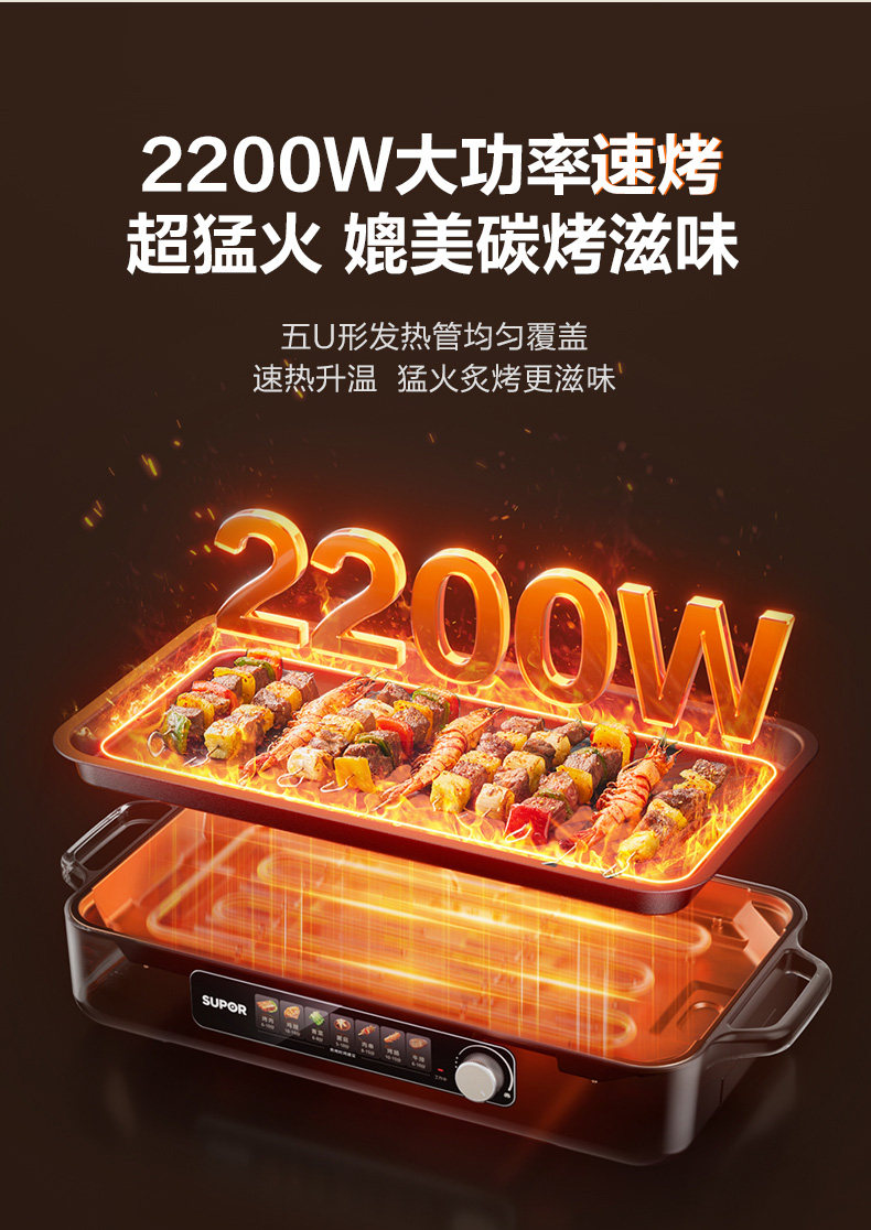 Supor Electric Grill Pan for Home Use, Non-Stick Electric Barbecue Grill, Kebab Machine, Indoor Low-Smoke Electric Grill Pot for Family Use