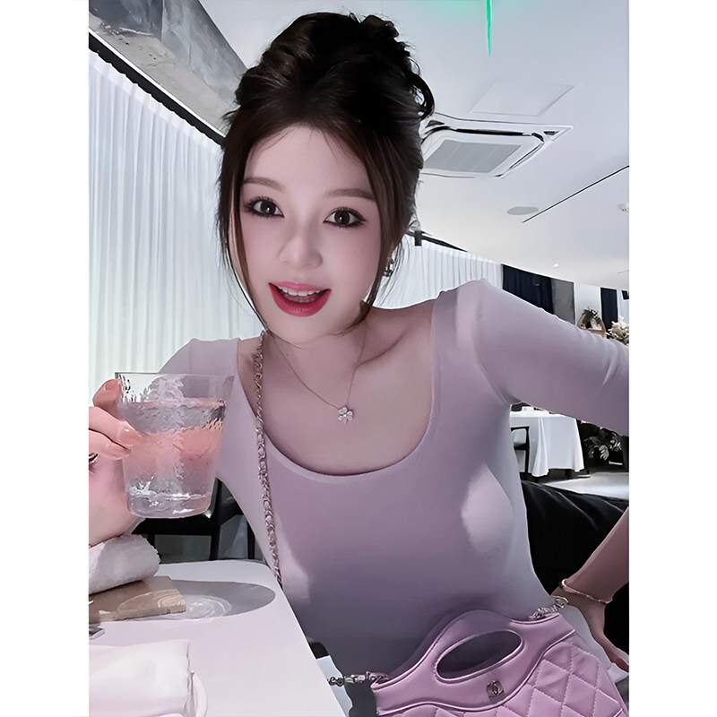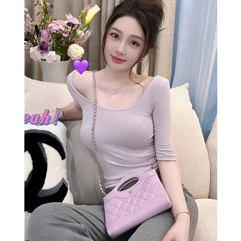 Pure Desire to Show Off Figure, Mid-Sleeve Light Purple T-Shirt for Women, Summer Tight-Fitting Five-Quarter Sleeve, Sweet and Spicy, Slimming U-Neck Base Shirt Top