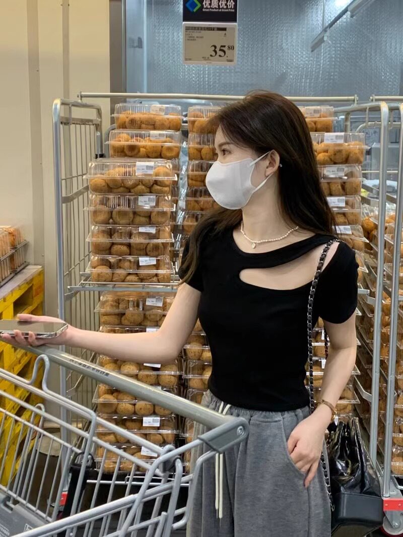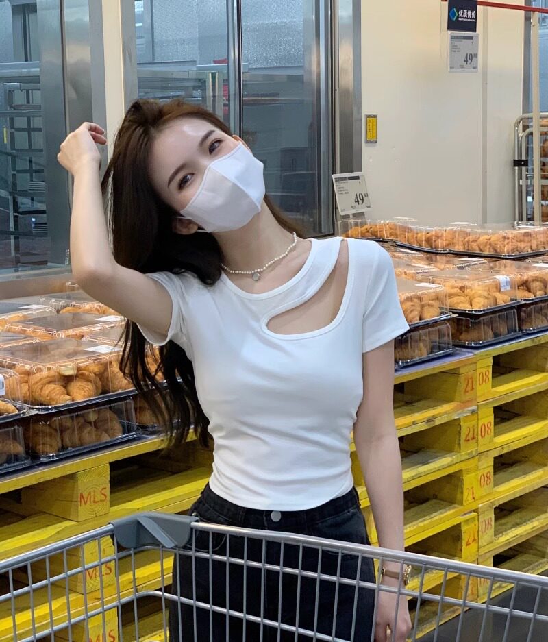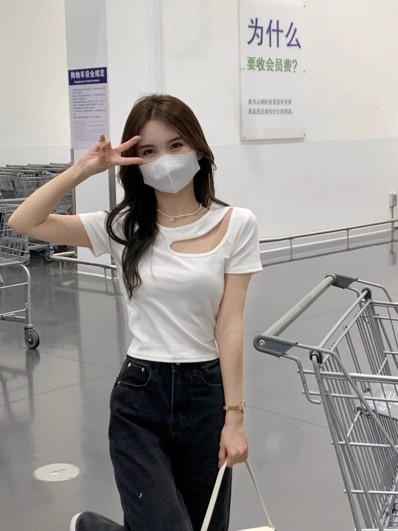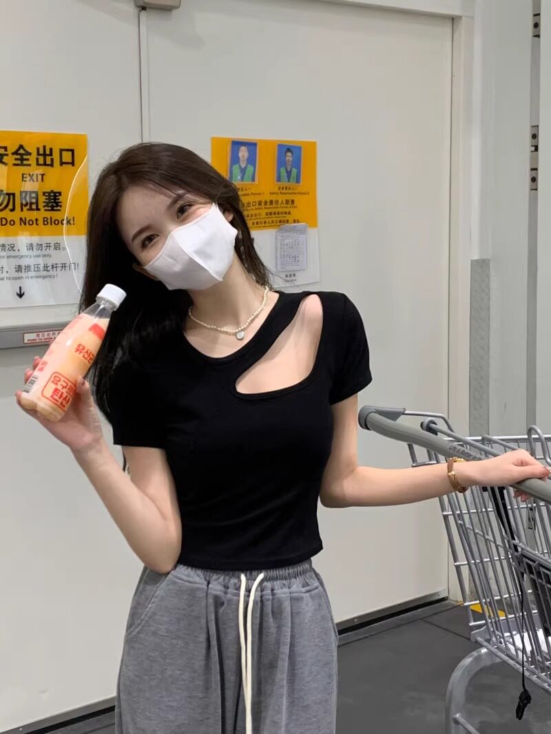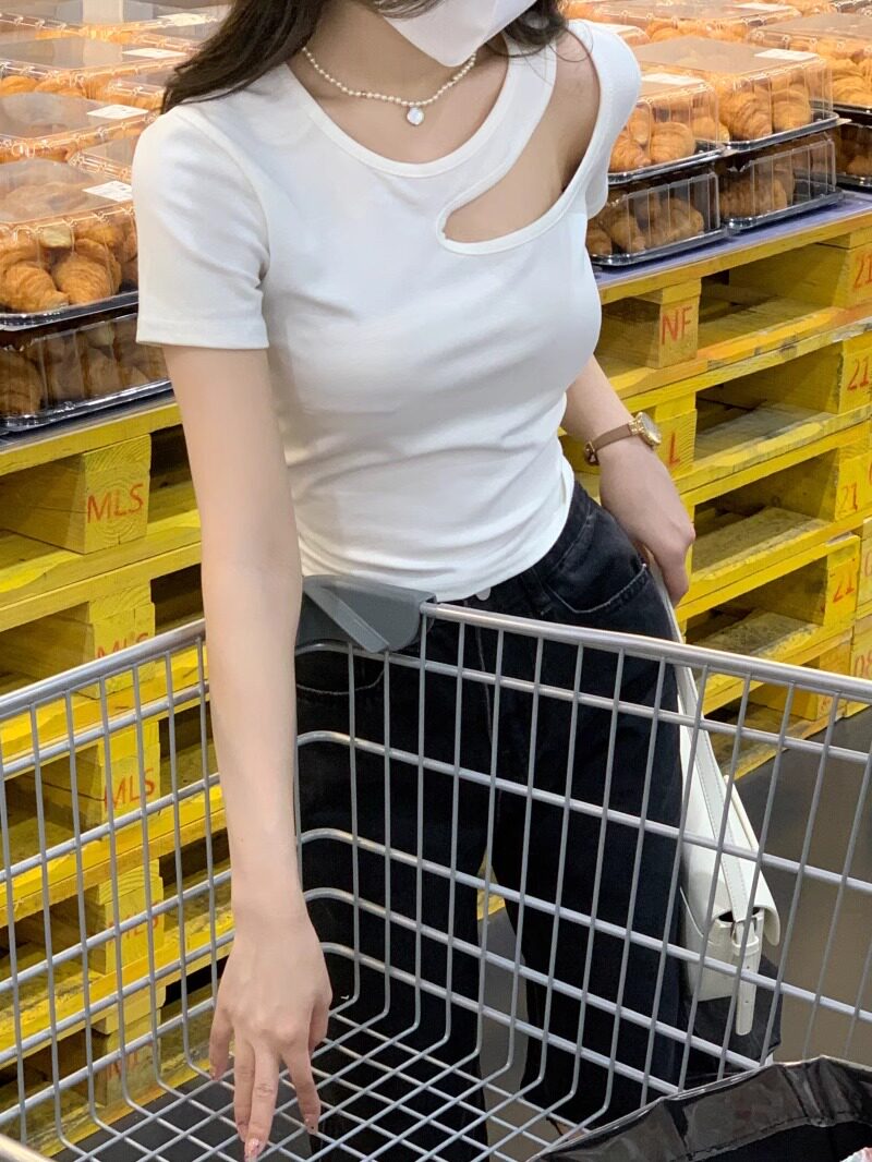 Designed Cut Out Right Shoulder Short-Sleeved Collarbone Top for Women in Summer, Unique and Beautiful Slimming Look Sexy T-Shirt