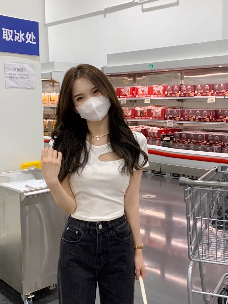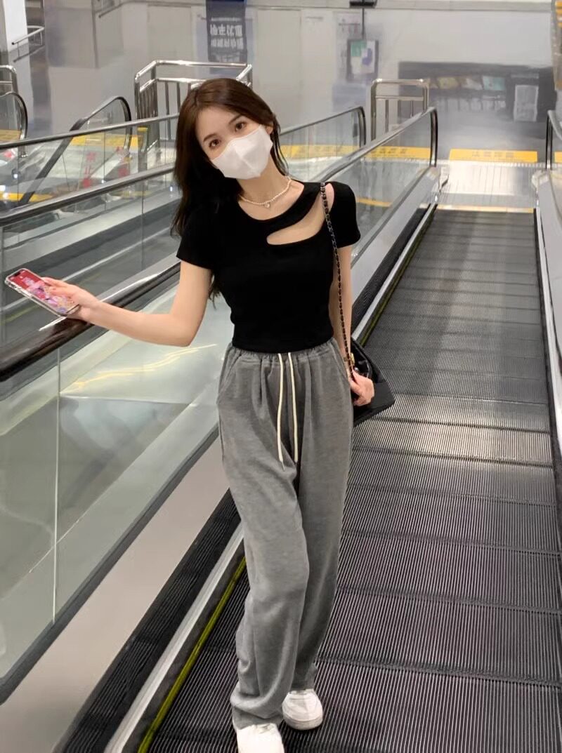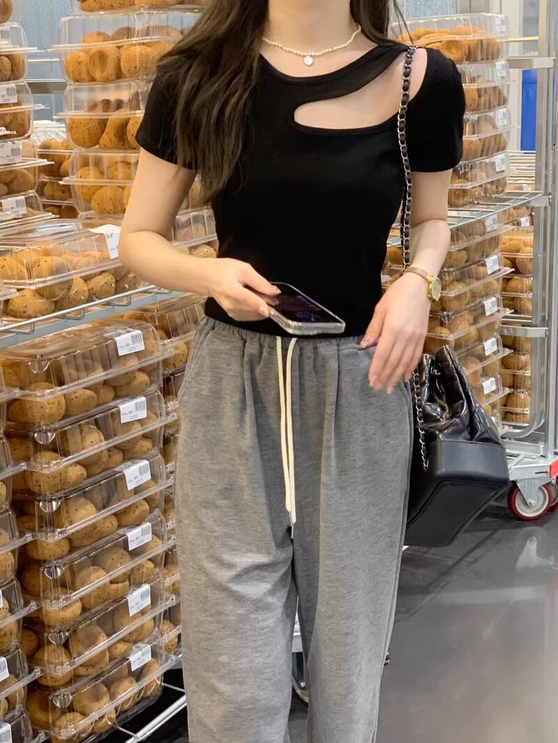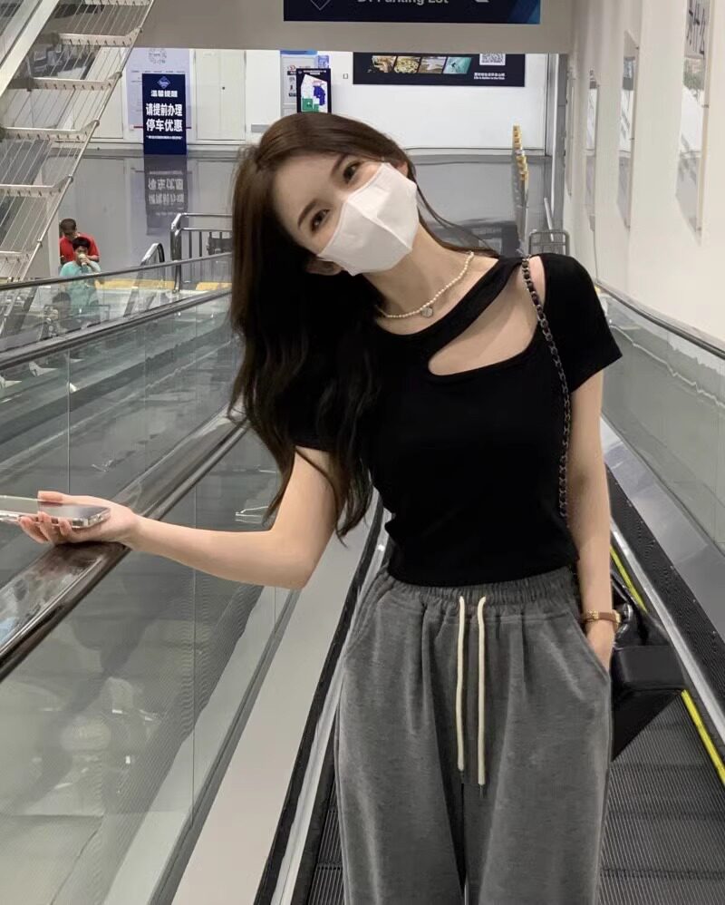 Designed Cut Out Right Shoulder Short-Sleeved Collarbone Top for Women in Summer, Unique and Beautiful Slimming Look Sexy T-Shirt