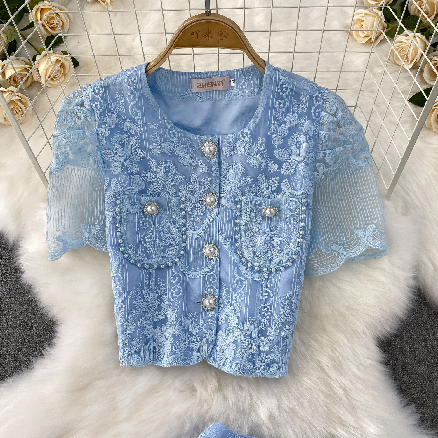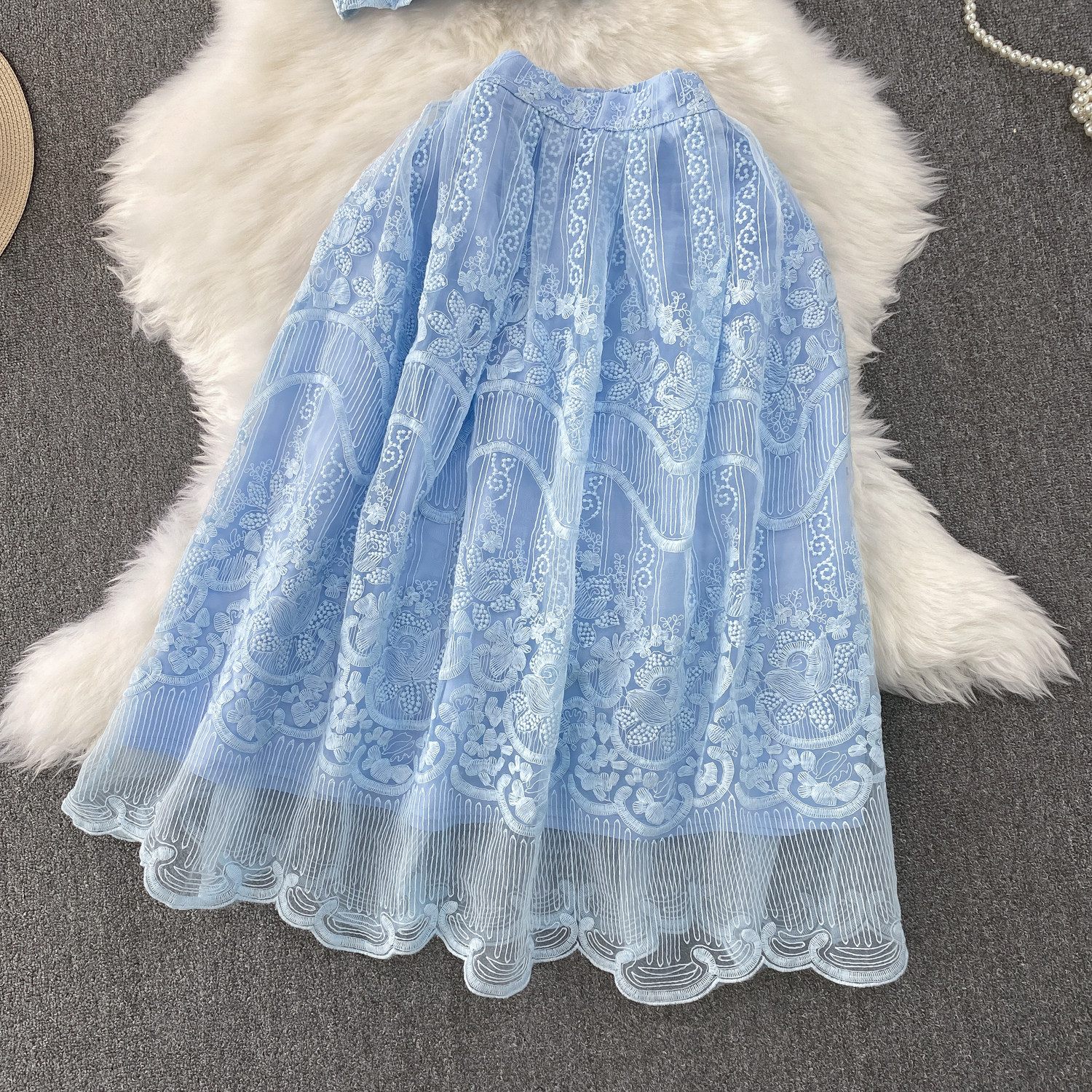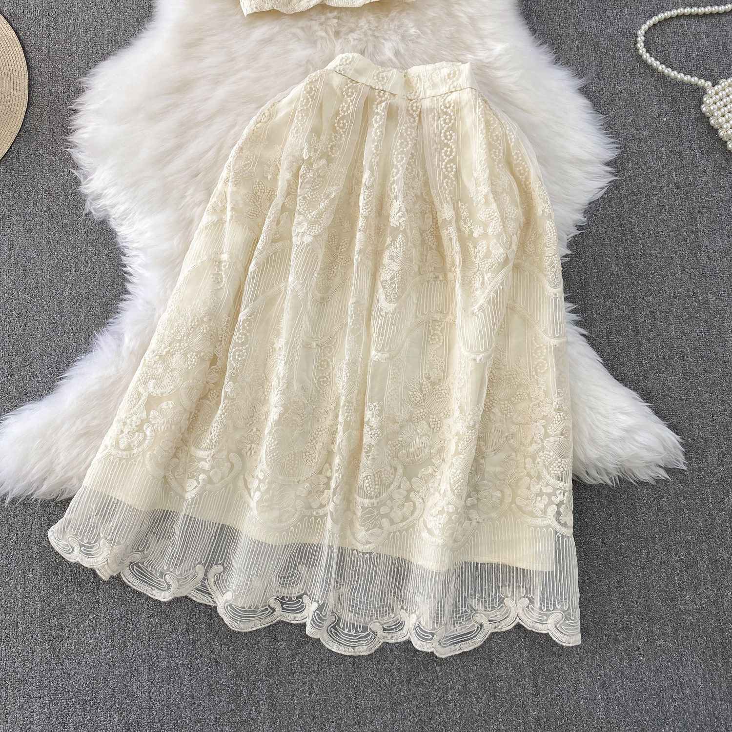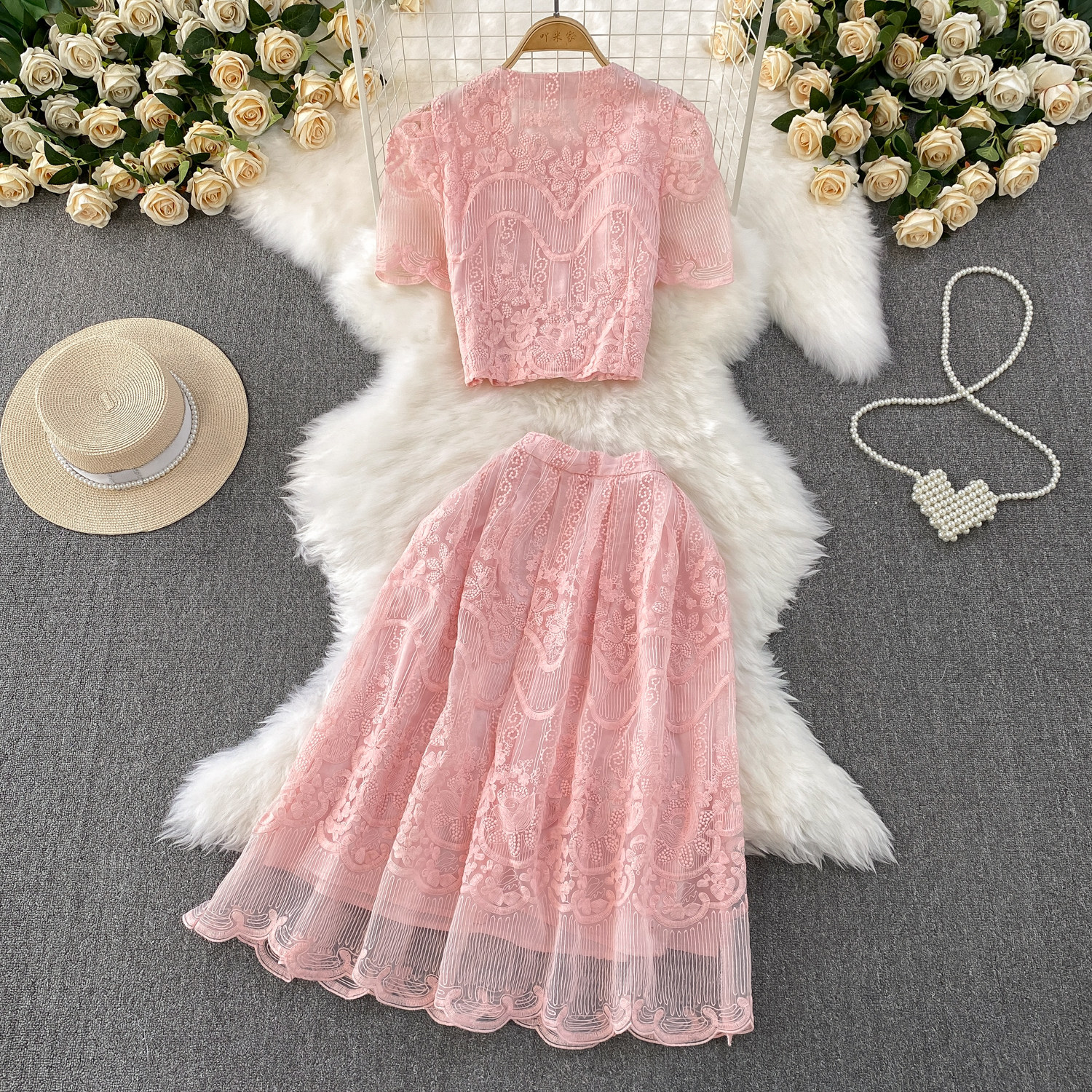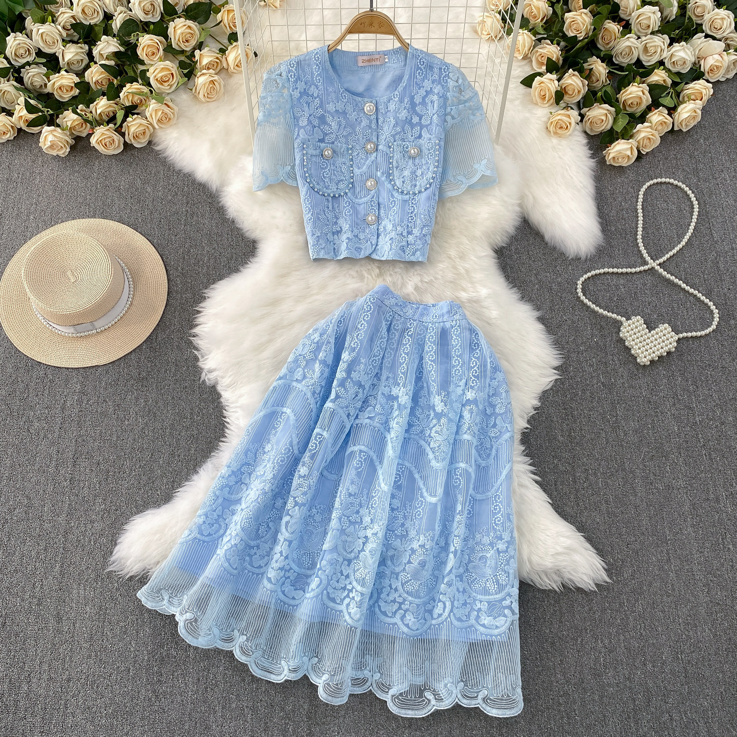 Ladylike temperament lace embroidery two-piece set for women 2025 new summer petite high-end top + skirt