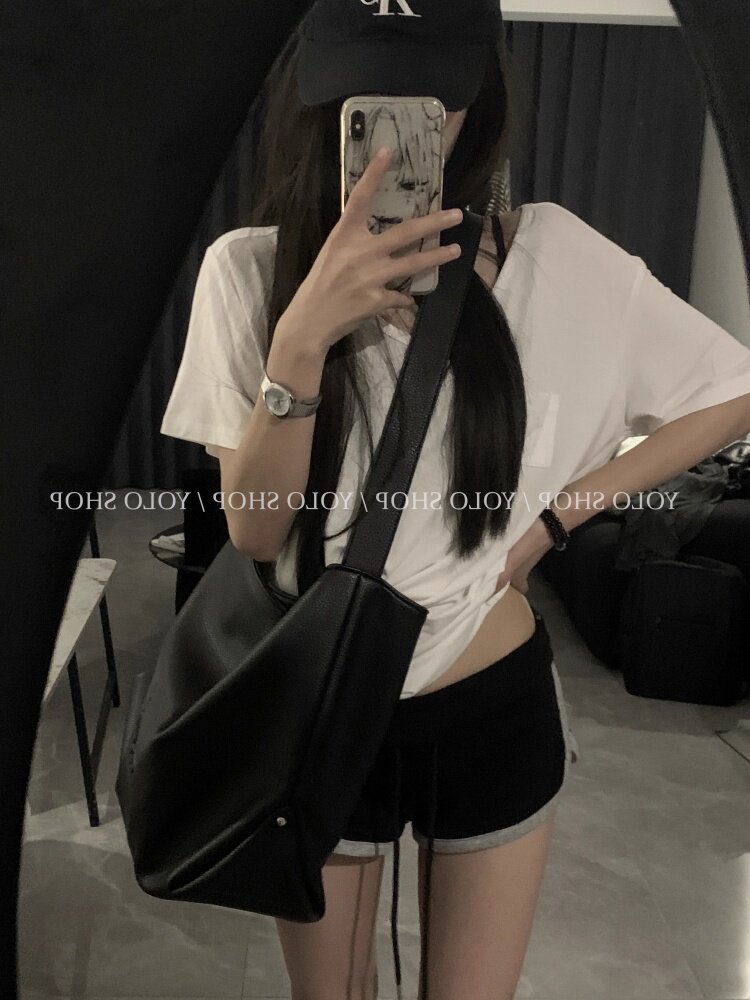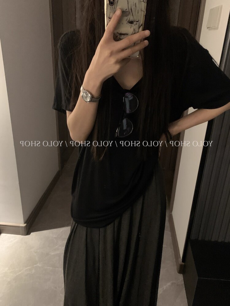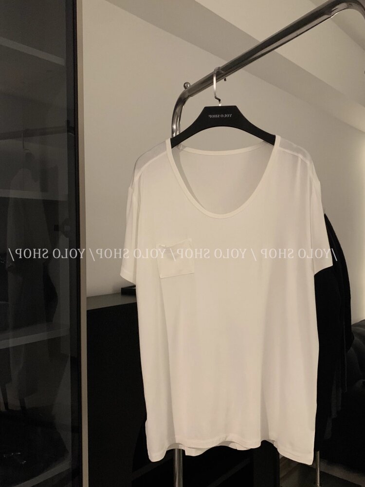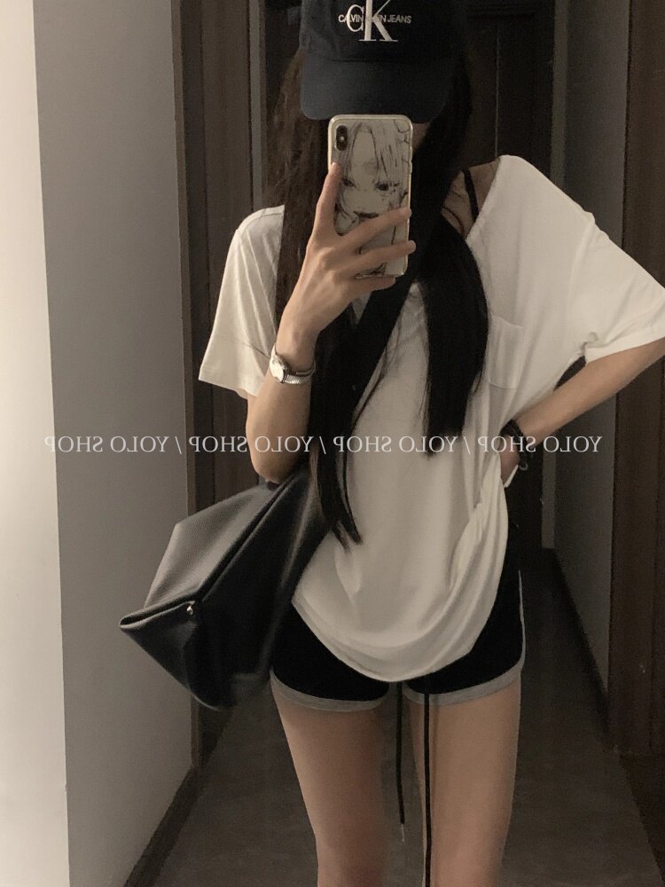 Loose and lazy style white big u-neck short-sleeved T-shirt for women summer pure desire half-sleeved right shoulder T-shirt loose feeling thin top