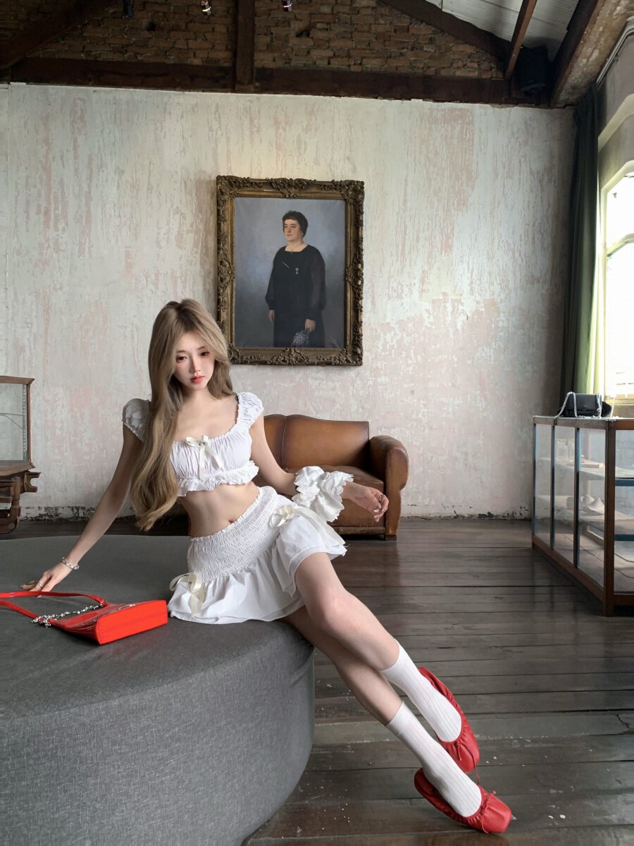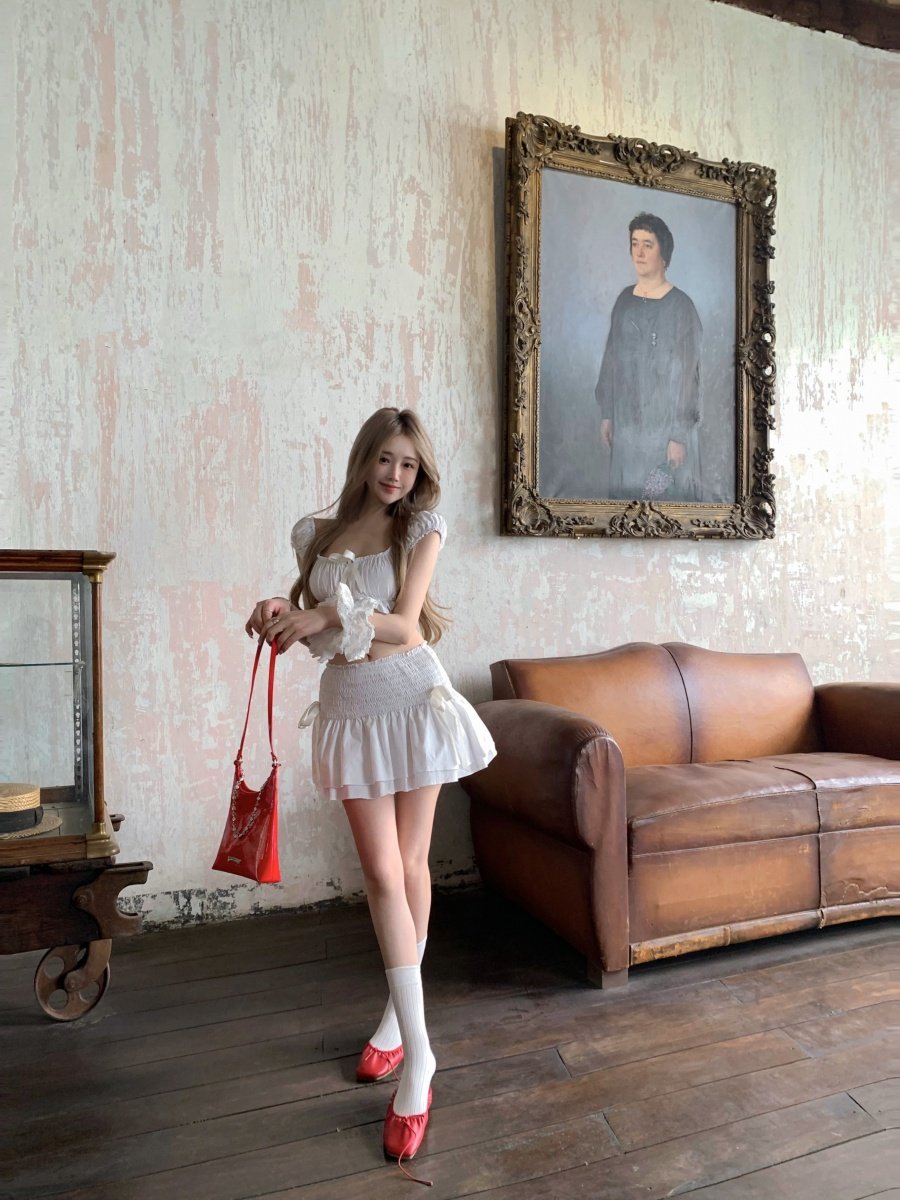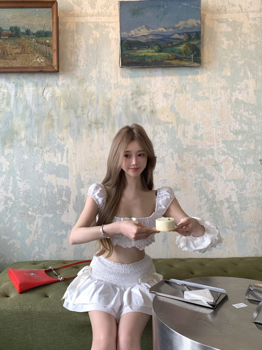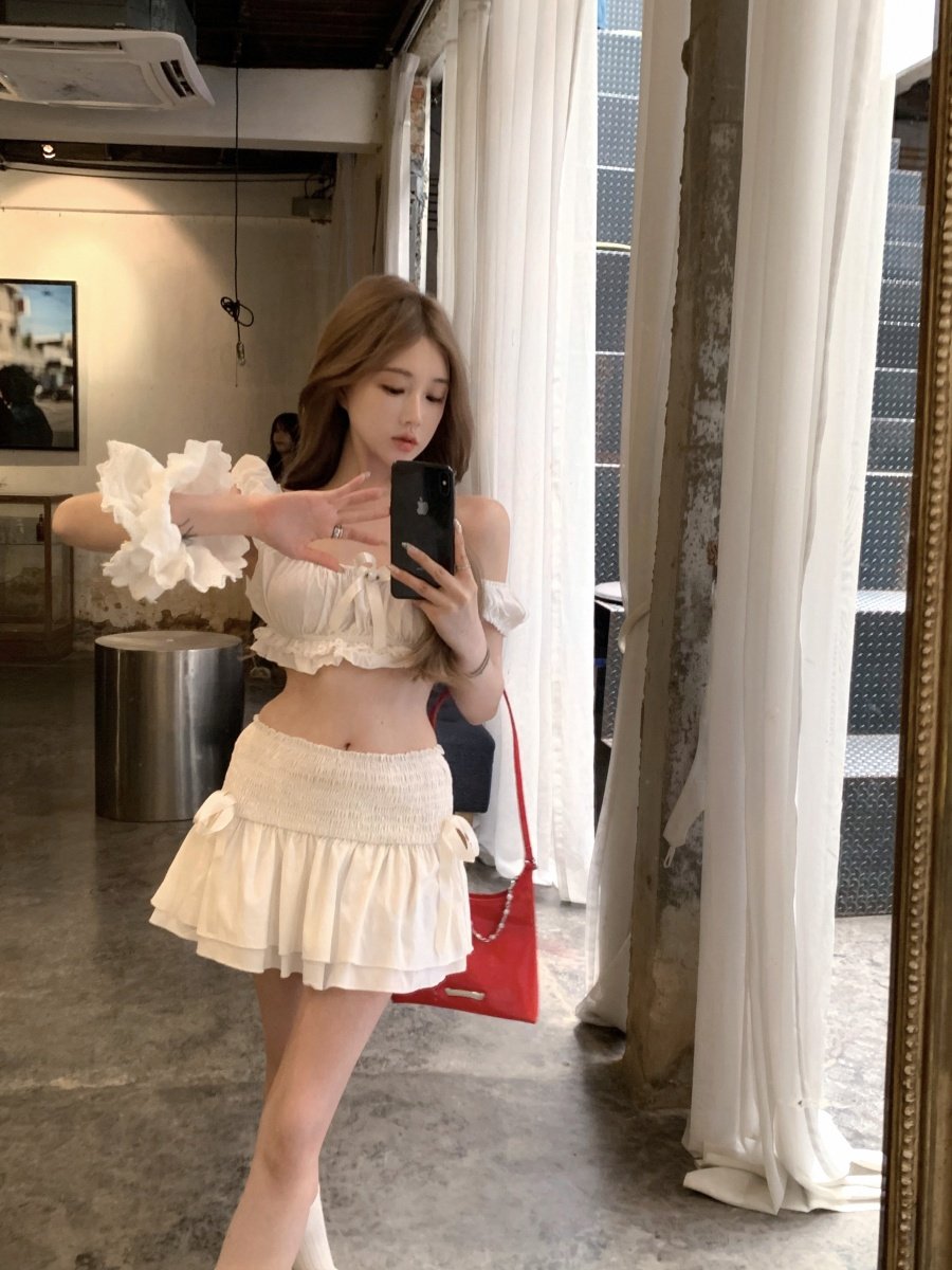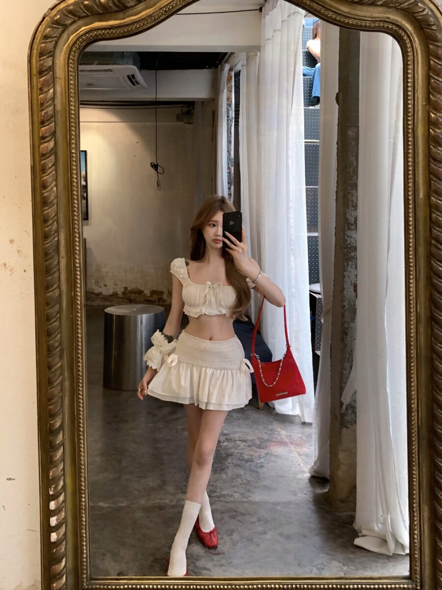 Thailand Travel Photo Vacation Outfit for Petite Women, Pure and Innocent White Short Bow-Tie Camisole Top and Skirt Set