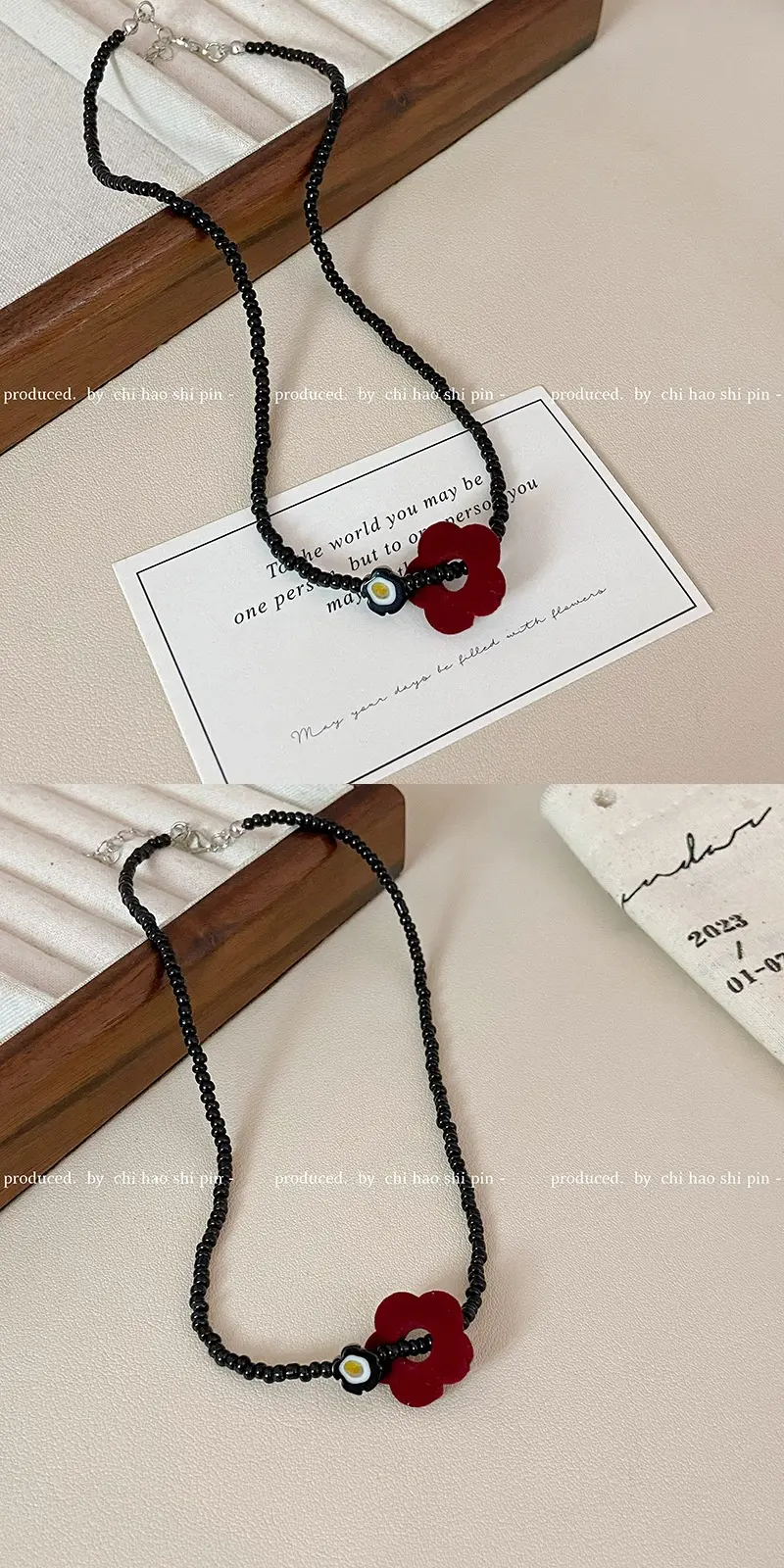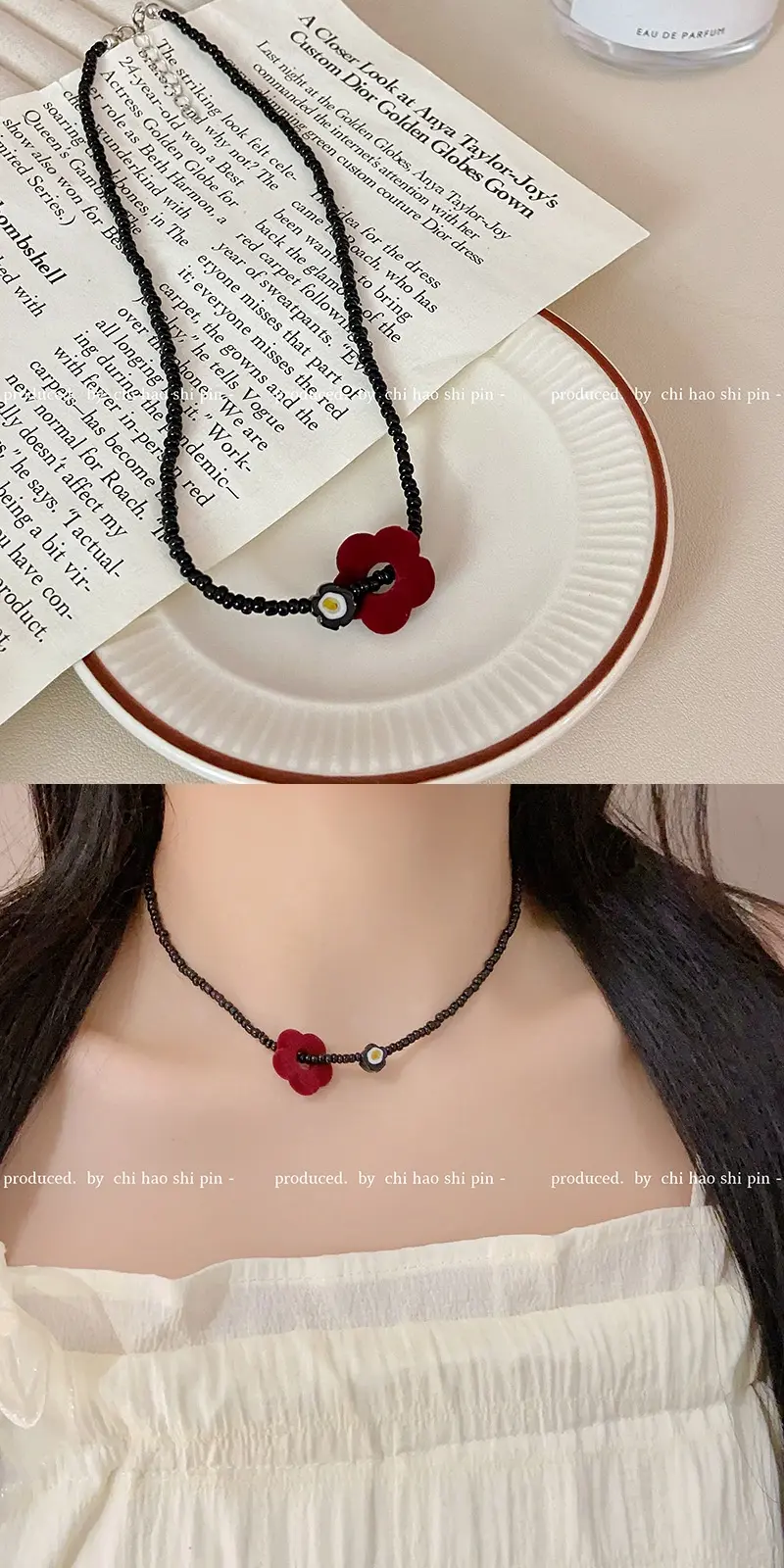 Chinese restaurant Jiang Yan's same style red velvet flower beaded necklace women's niche exquisite high-looking versatile clavicle chain