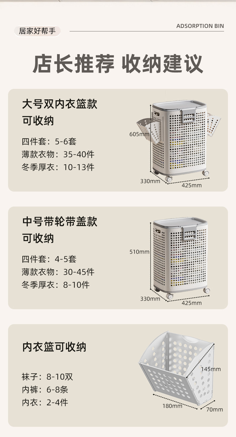 Color Classification Large Size❤️Double Underwear Basket Model [Underwear Basket*2+Removable Universal Wheels*4+With Cover],Large Size❤️Single Underwear Basket Model [Underwear Basket*1+Removable Universal Wheel*4+With Cover],Large Size ❤️ With Pulleys - with Cover [Removable Universal Wheels*4],Large Size❤️With Pulleys - No Cover [Removable Universal Wheels*4],Medium❤With Pulleys - with Cover [Removable Universal Wheels*4],Medium❤Model with Pulleys and No Cover [Removable Universal Wheels*4],Large Size - No Pulleys and No Cover [Floor-Standing Model],Medium Size - No Pulleys and No Cover [Floor-Standing Model],Small Size - Wheelless Model Without Cover [Removable Universal Wheels*4]