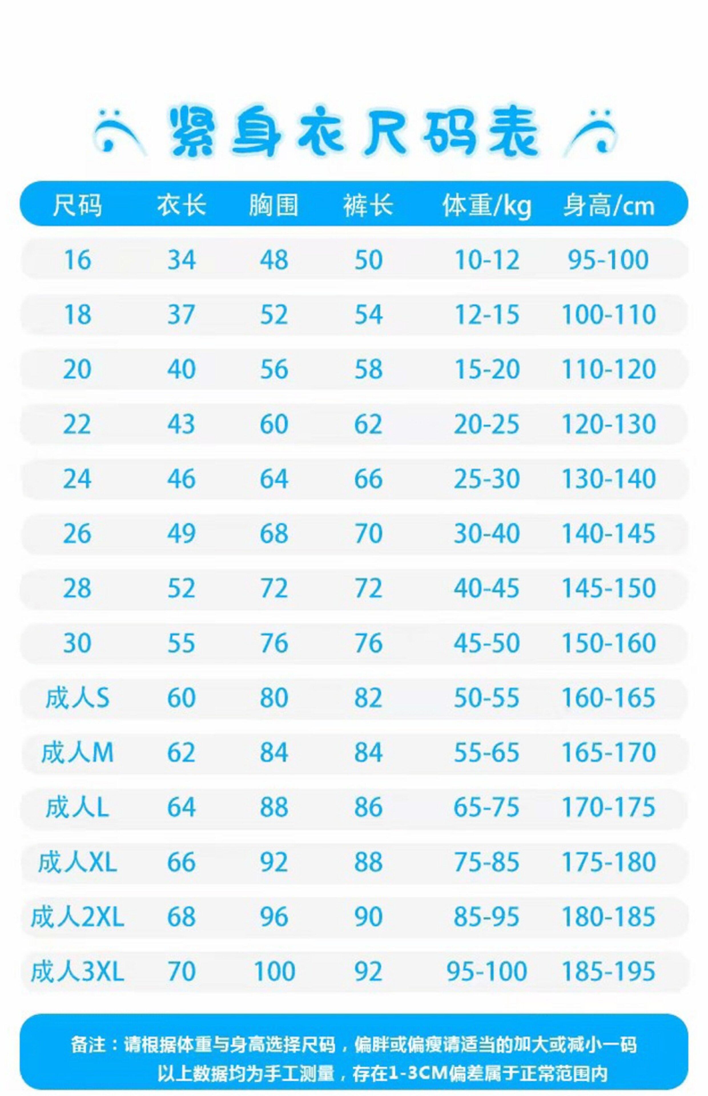 Size Size 16 (recommended 95-100cm, 20-24Jin Jin equals 0.5kg),Size 18 (recommended 100-110cm, 24-30Jin Jin equals 0.5kg),20 yards (recommended 110-120cm, 30-40Jin Jin equals 0.5kg),22 yards (recommended 120-130cm, 40-50Jin Jin equals 0.5kg),Size 24 (recommended 130-140cm, 50-60Jin Jin equals 0.5kg),Size 26 (recommended 140-145cm, 60-80Jin Jin equals 0.5kg),28 yards (recommended 145-150cm, 80-90Jin Jin equals 0.5 kg),30 yards (recommended 150-160cm, 90-100Jin Jin equals 0.5kg),Adult S (recommended 160-165cm, 100-110Jin Jin equals 0.5kg),Adult M (recommended 165-170cm, 110-130Jin Jin equals 0.5kg),Adult L (recommended 170-175cm, 130-150Jin Jin equals 0.5kg),Adult XL (recommended 175-180cm, 150-170Jin Jin equals 0.5kg),Adult 2XL (recommended 180-185cm, 170-190Jin Jin equals 0.5kg),Adult 3XL (recommended 185-195cm, 190-200Jin Jin equals 0.5kg)