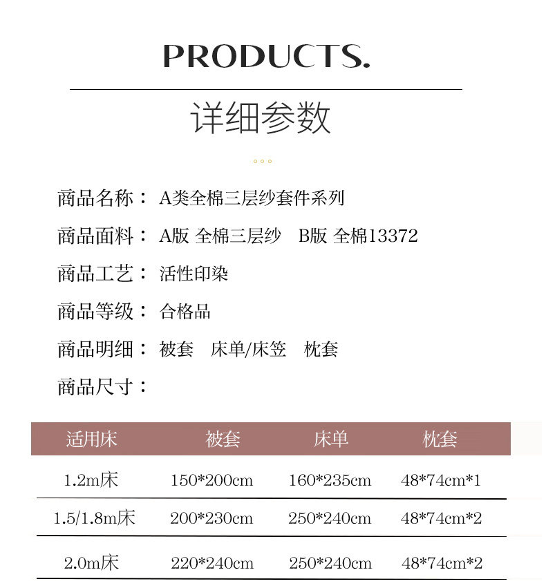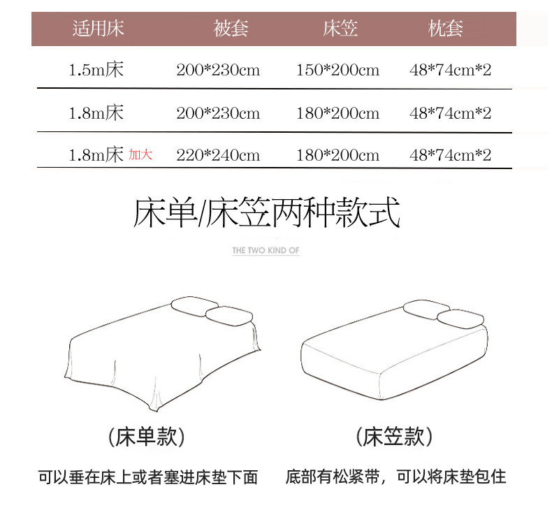 Applicable bed size Three-piece set for student dormitory suitable for 150x200cm quilt,1.2m bed sheet three-piece set - suitable for 150x200cm quilt core,1.5m bed sheet four-piece set - suitable for 200x230cm quilt core,1.8m bed sheet four-piece set - suitable for 200x230cm quilt core,2.0m bed sheet four-piece set - suitable for 220x240cm quilt core,1.5m bed, four-piece set of mattresses - suitable for 200x230cm quilt core,1.8m bed cover set - suitable for 200x230cm quilt core,2.0m bed cover set - suitable for 220x240cm quilt core