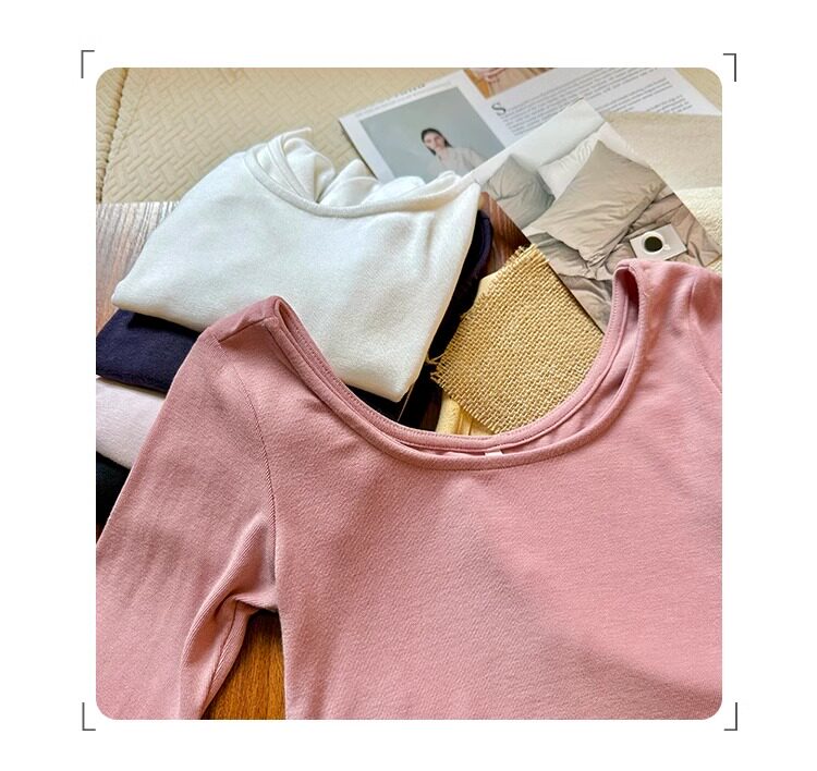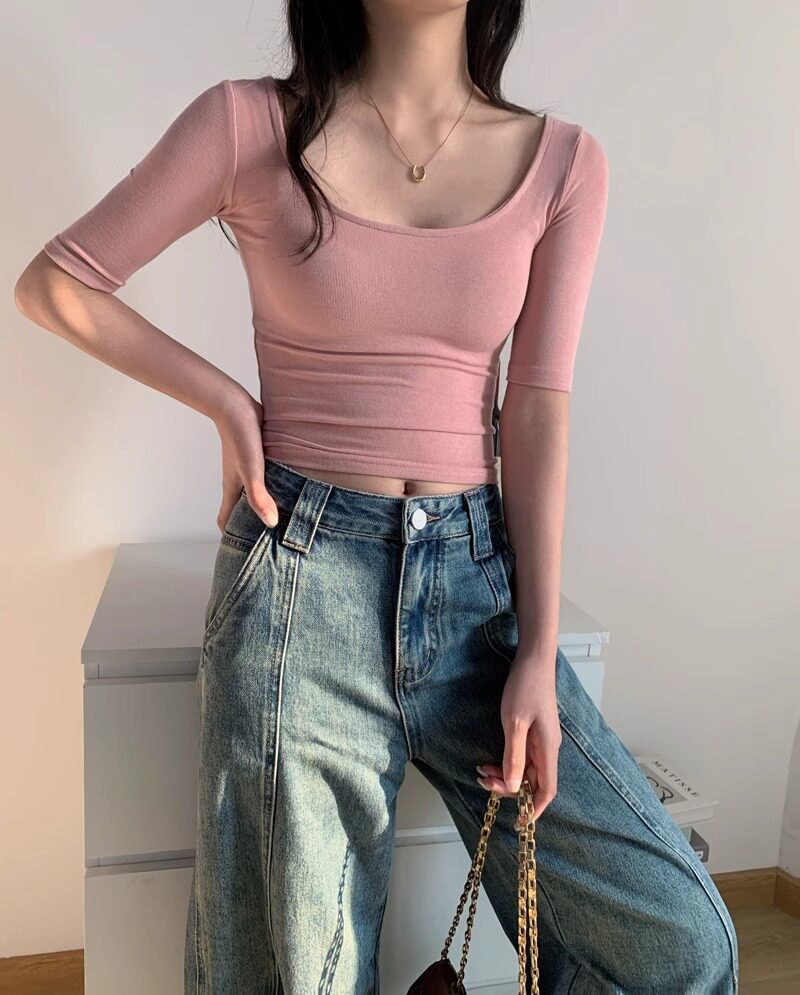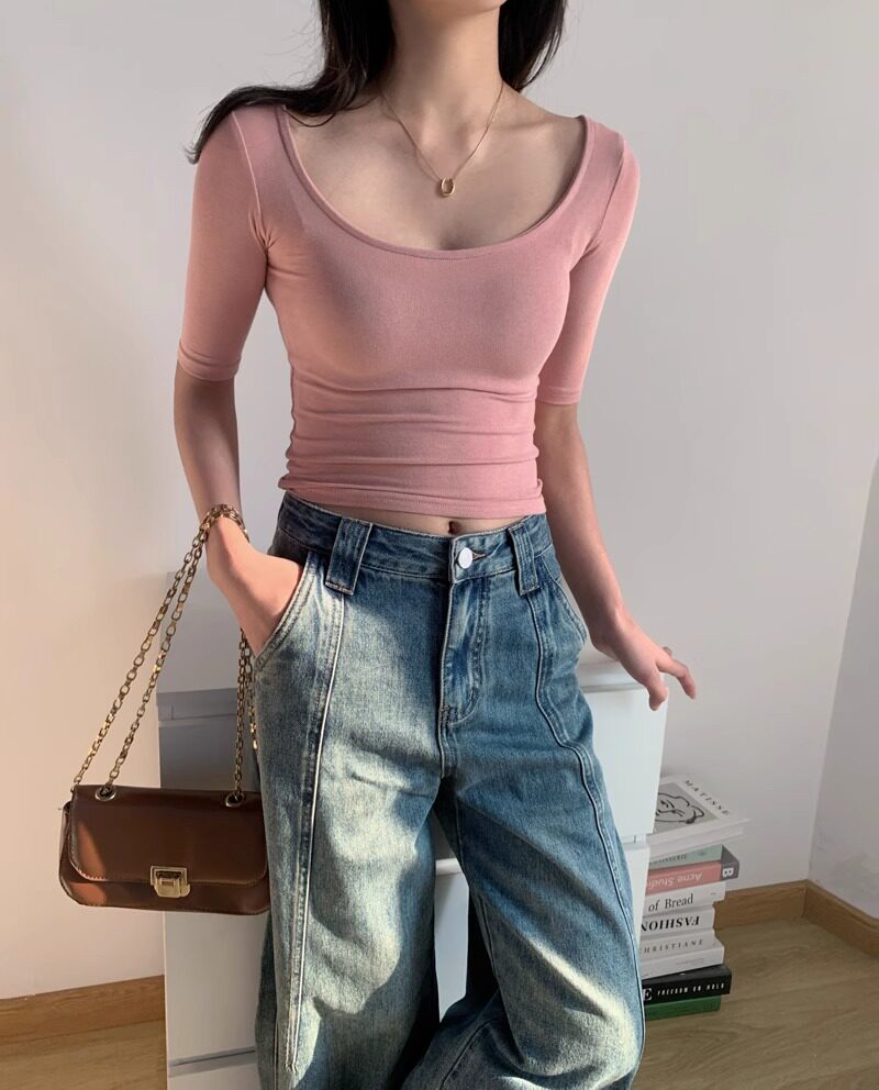 Large U-Neck Five-Quarter Sleeve Solid Color Top for Women, Summer 2025 New Popular Style, Unique Slim-Fit Tight Inner Wear Mid-Sleeve T-Shirt