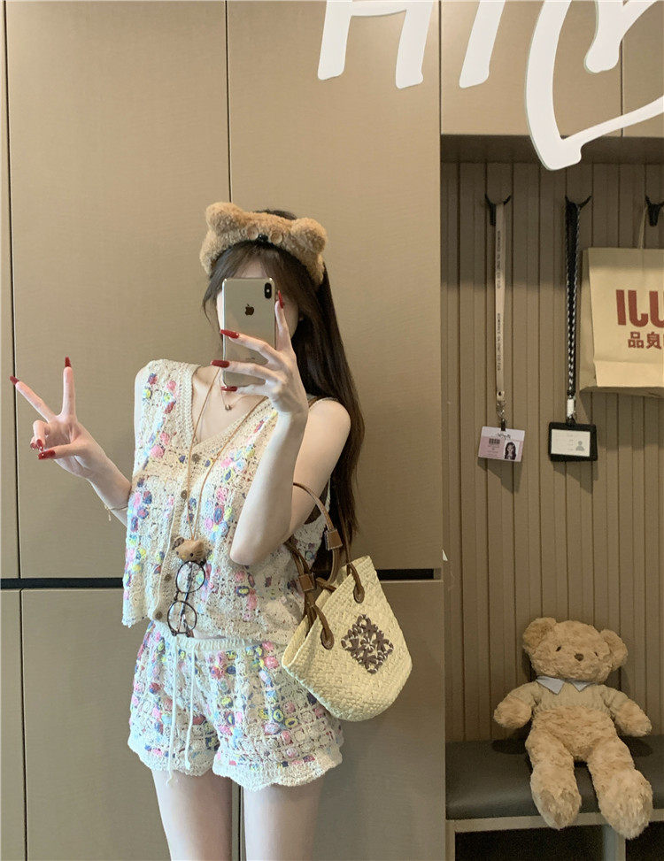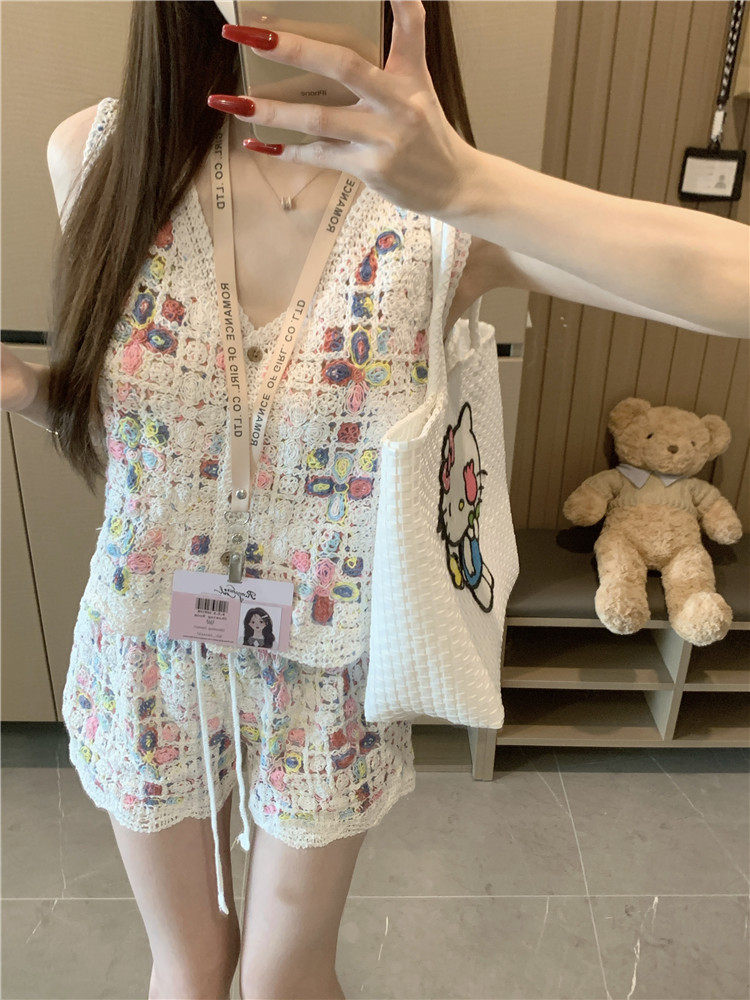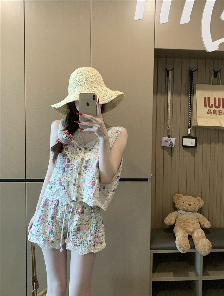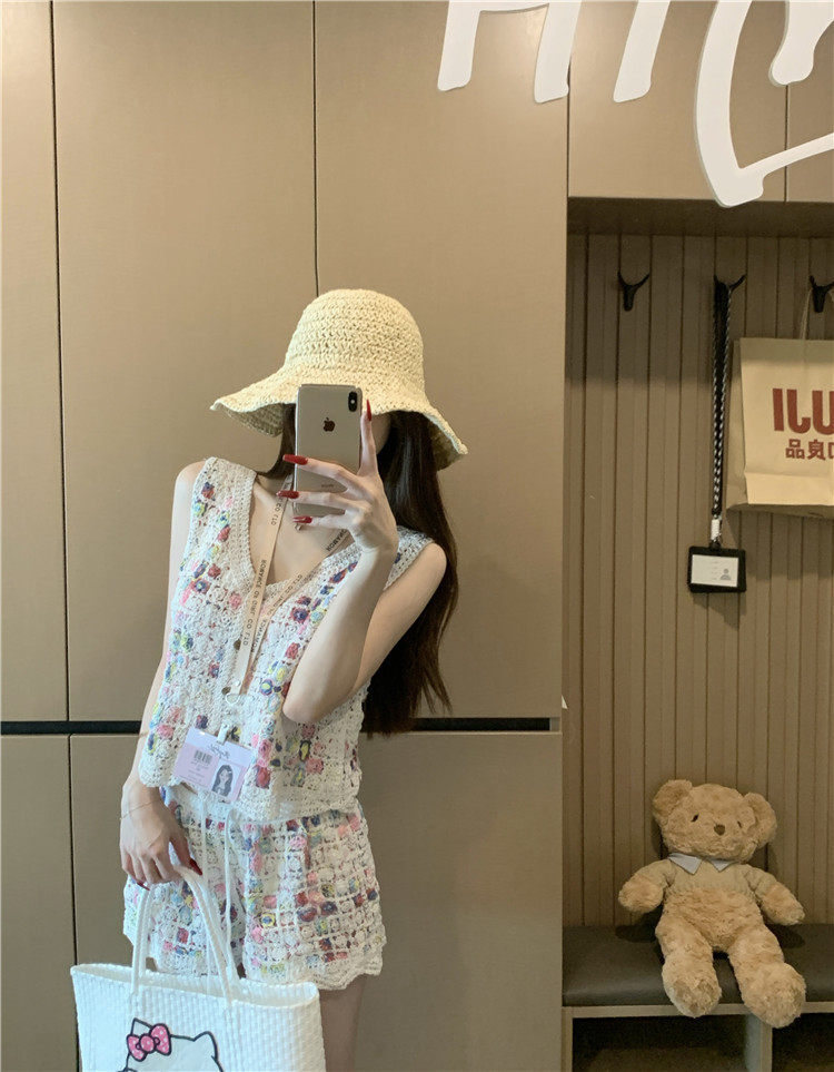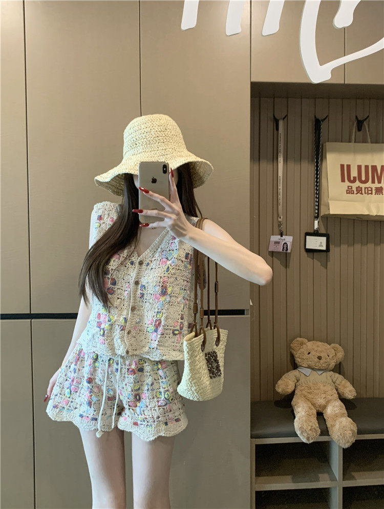 Lin Xi Xi ~ Beach Vacation Style Casual Suit Plaid Hollow-Out V-Neck Sleeveless Top High-Waisted Short Style